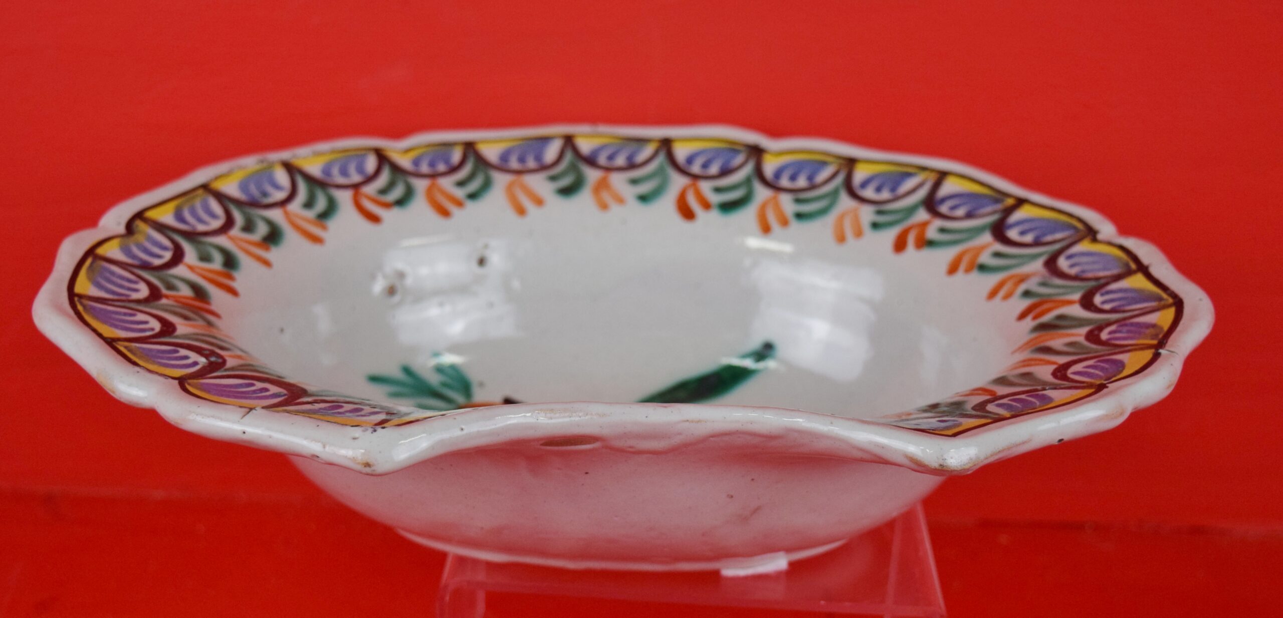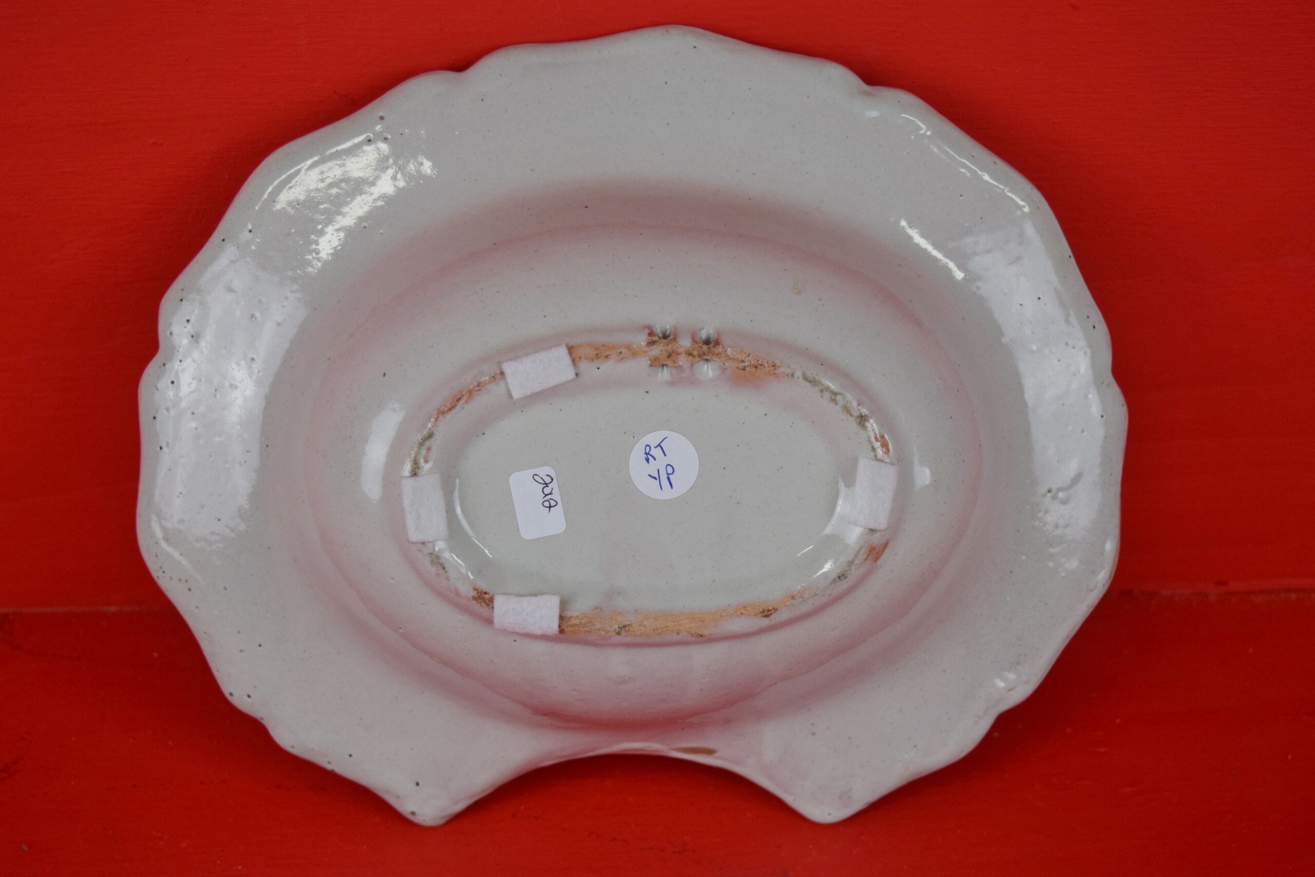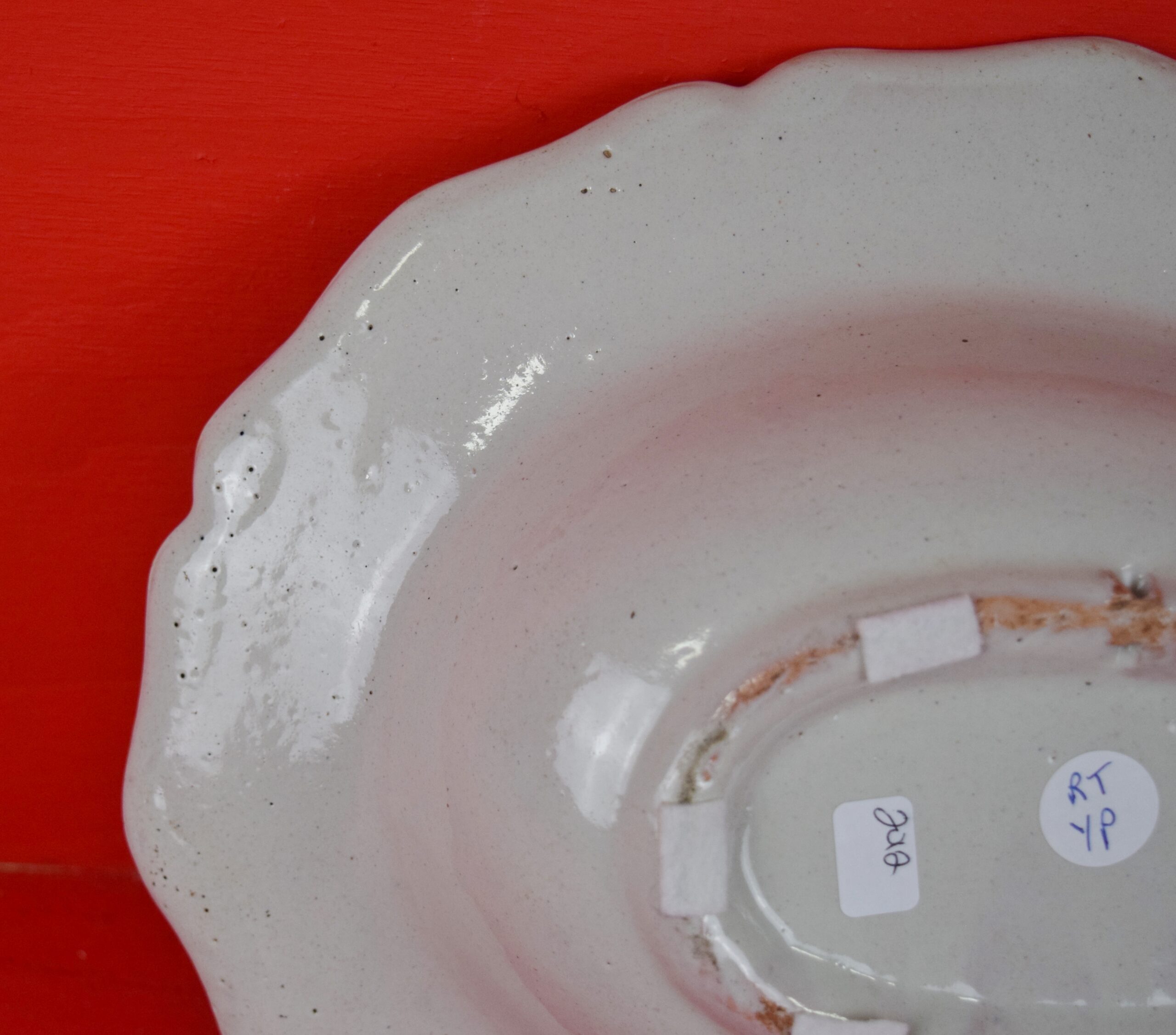 If you look at the history of barbers, you will find that they were similar to doctors in the early years. Known as barber-surgeons, they performed a multitude of tasks, including bloodletting, pulling teeth, setting bones, and treating wounds. This bowl was used for a few purposes, namely bloodletting and pulling teeth. The notch is made to contact the neck, so the bowl would easily hold any blood or fluids that occurred during surgery. The outer lip of the bowl is scalloped with a repetitive decoration. Inside the bowl are three flowers with green trim. You can see some imperfections in the bowl that occurred during production. Underneath are some minor imperfections with two small holes in the base where a string was used to display the bowl. 2012-YP
