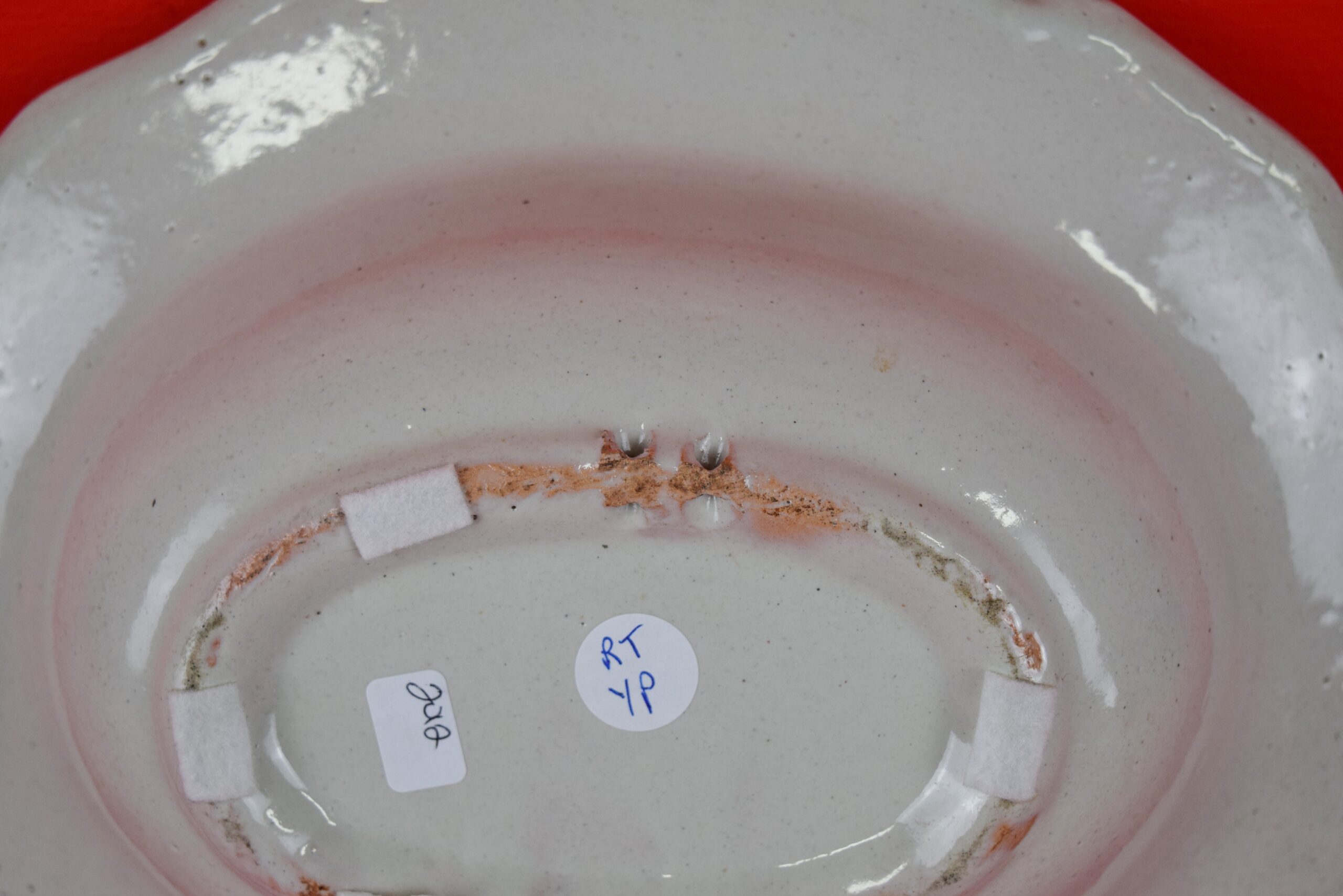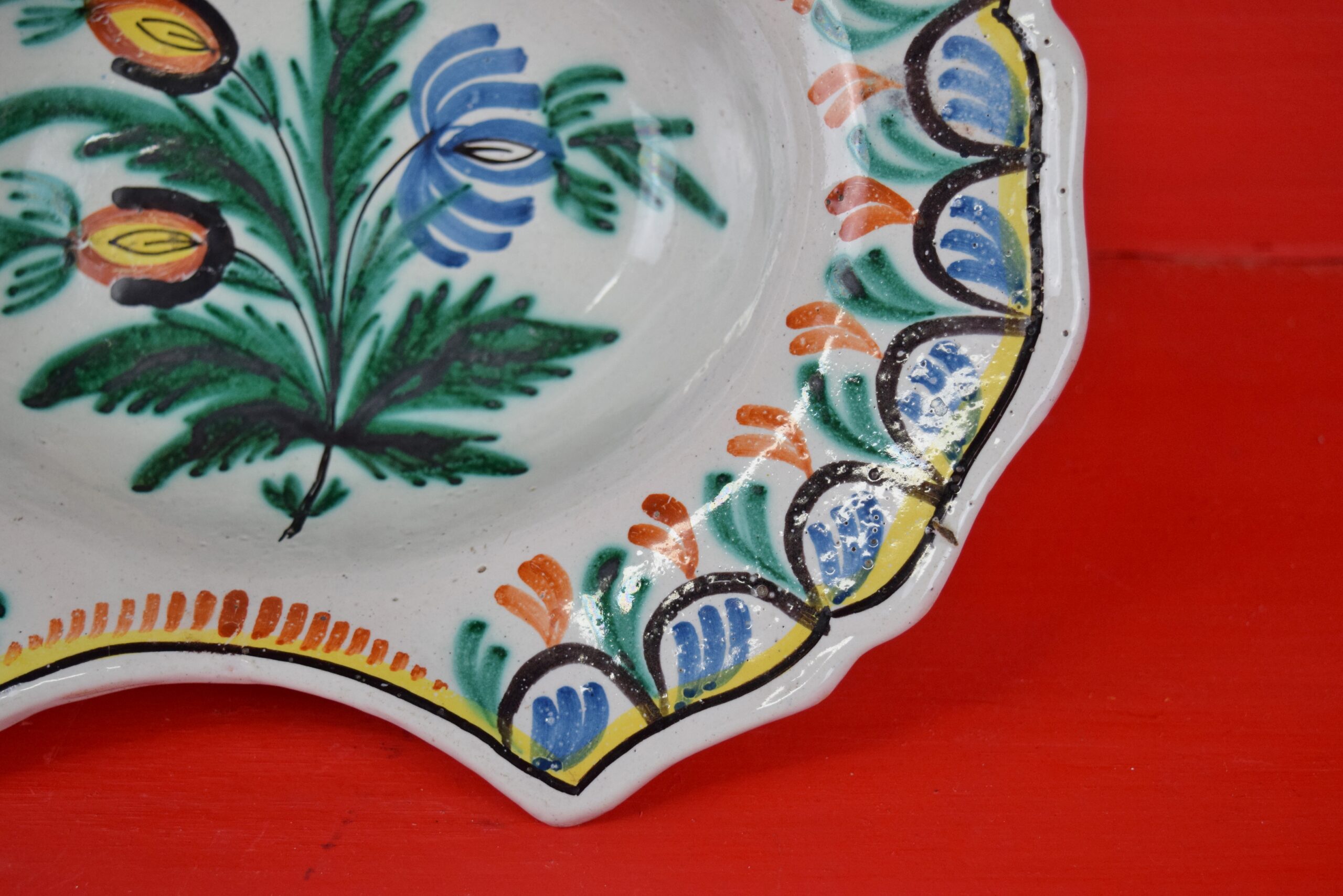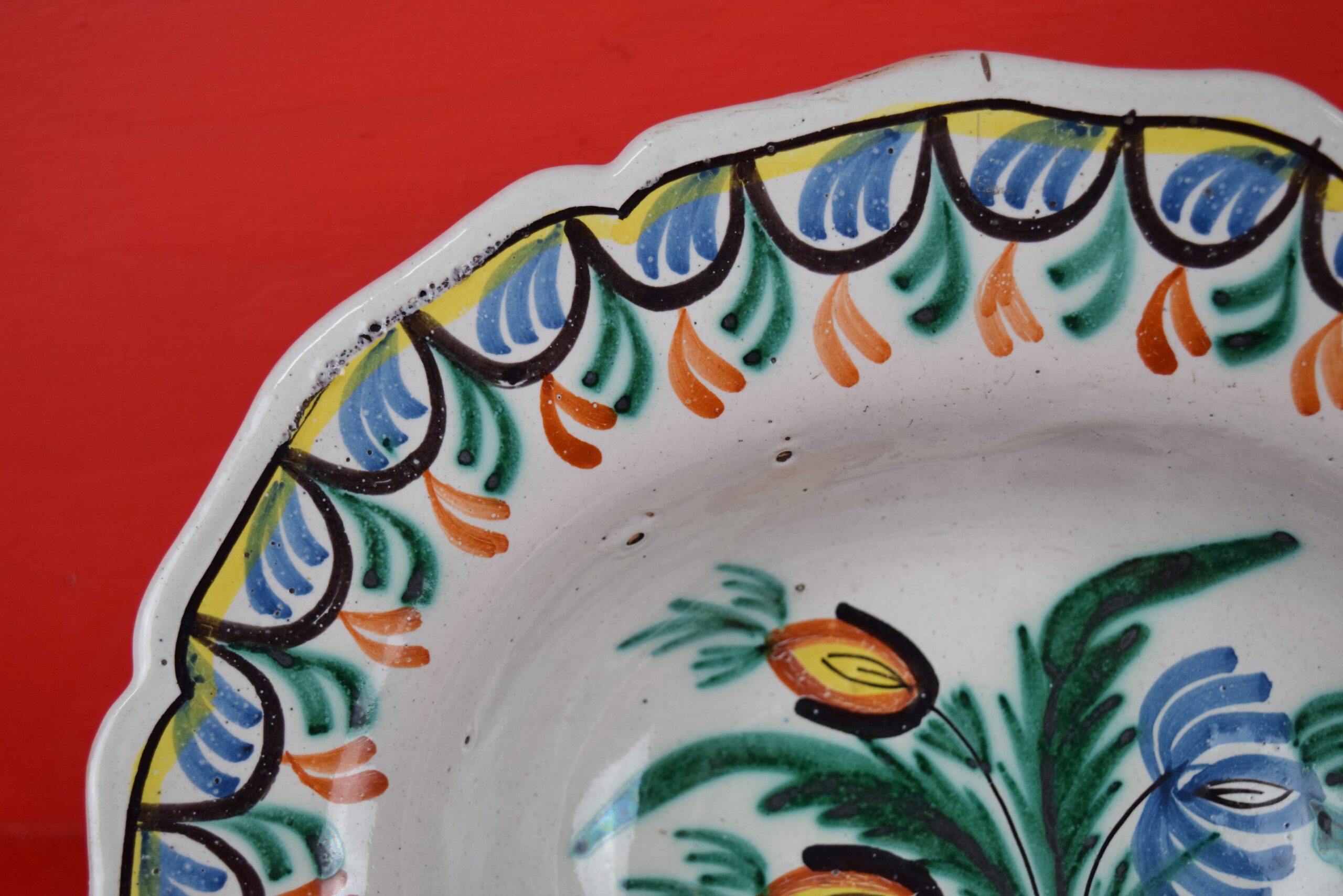 If you look at the history of barbers, you will find that they were similar to doctors in the early years. Known as barber-surgeons, they performed a multitude of tasks, including bloodletting, pulling teeth, setting bones, and treating wounds. This bowl was used for a few purposes, namely bloodletting and pulling teeth. The notch is made to contact the neck, so the bowl would easily hold any blood or fluids that occurred during surgery. The outer lip of the bowl is scalloped with a repetitive decoration. Inside the bowl are three flowers with green trim. You can see some imperfections in the bowl that occurred during production. Underneath are some minor imperfections with two small holes in the base where a string was used to display the bowl. 2012-YP