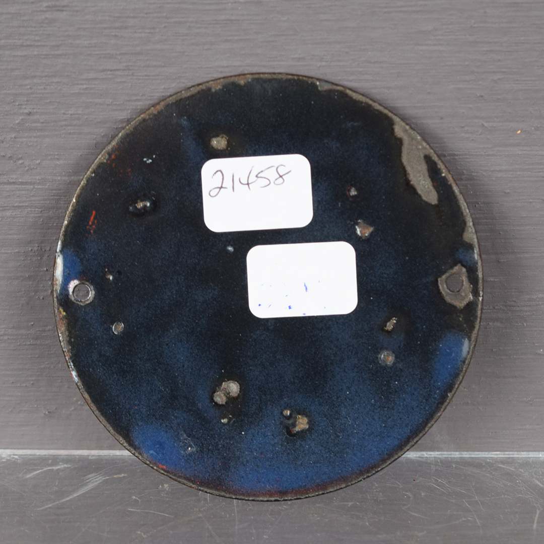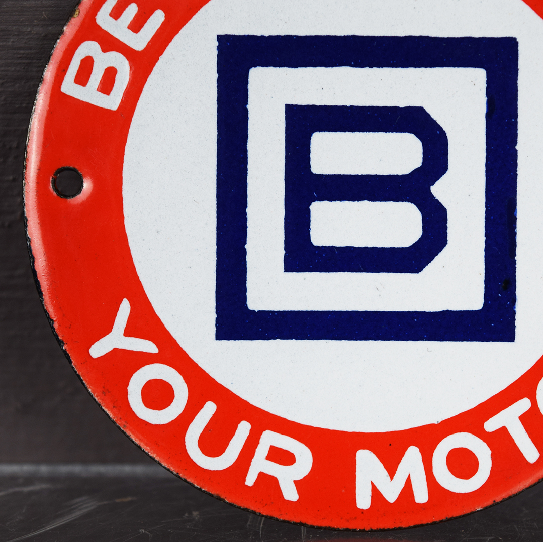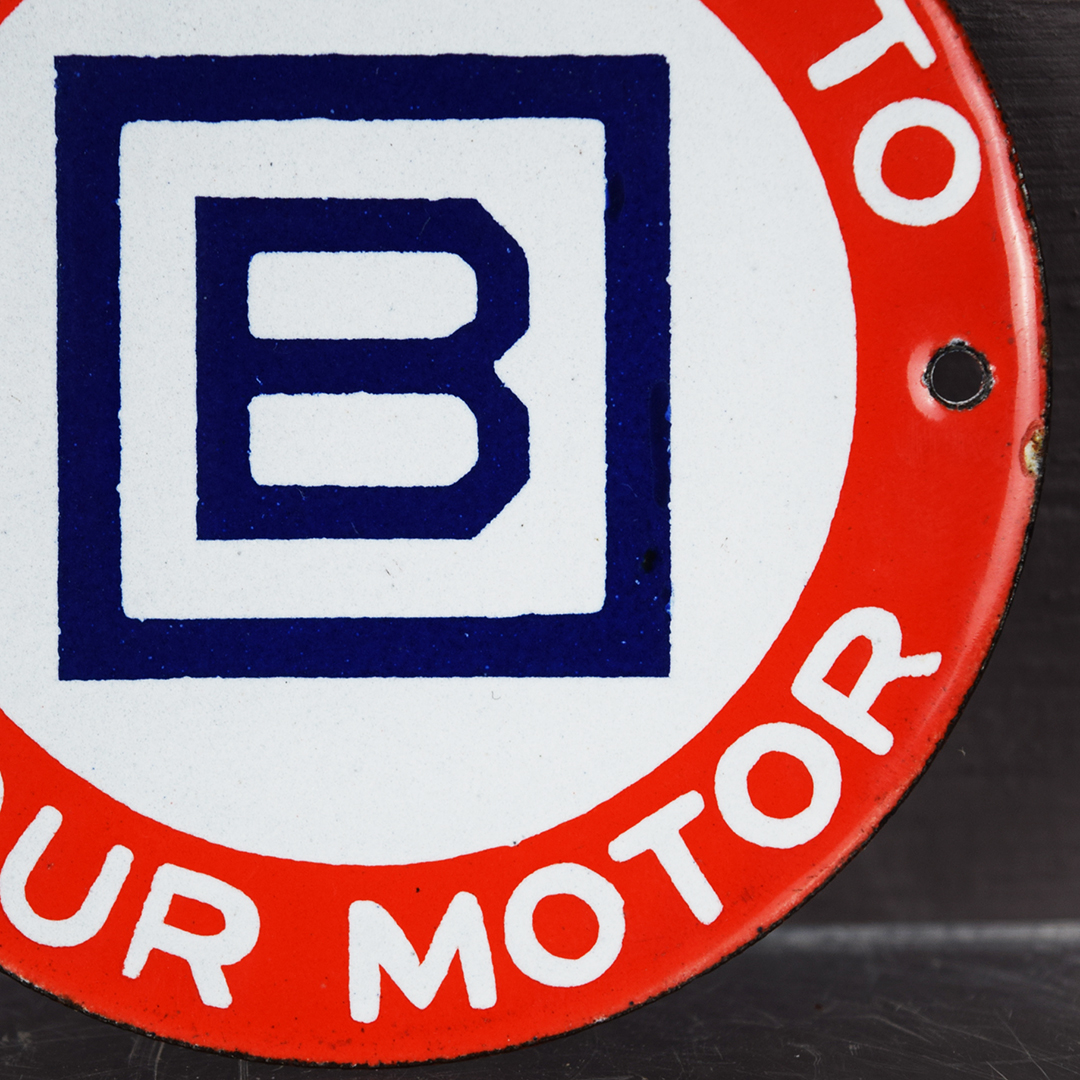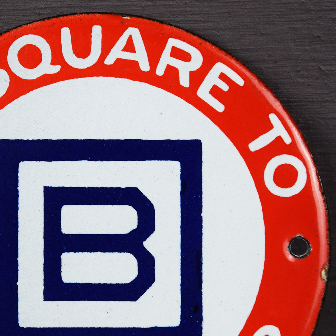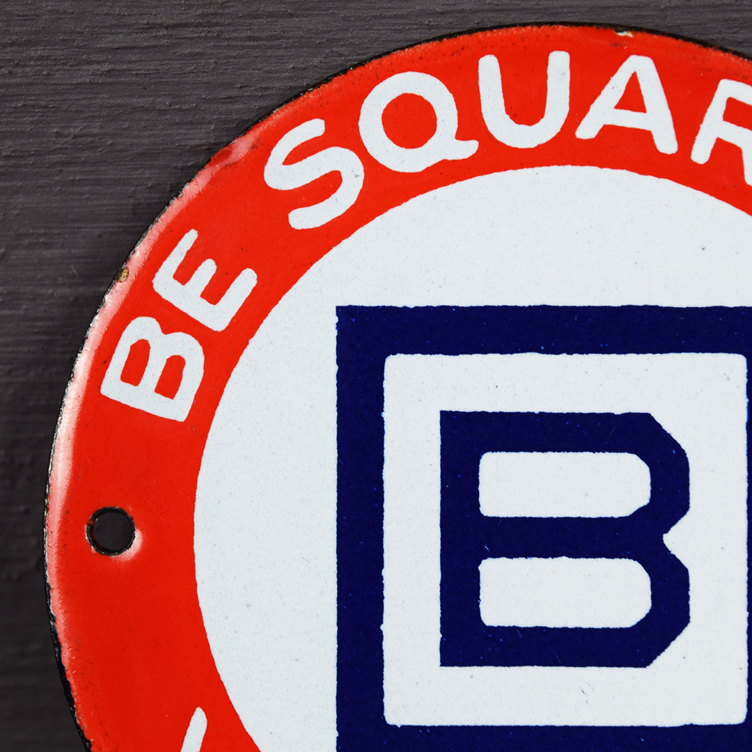 It’s rare to find small signs, like this Barnsdall example, in such superb condition. Measuring 3 inches tall by 3 inches wide and retained in near-perfect shape, it bears only a minor chip along the right edge, just below the mounting hole. This sign, once mounted on a Barnsdall gas pump, displays the slogan “Be Square To Your Motor” and the Barnsdall logo at its center. Vibrant colors and a glossy finish distinguish this sign, which fits comfortably in the palm of your hand. 21458-QPP
