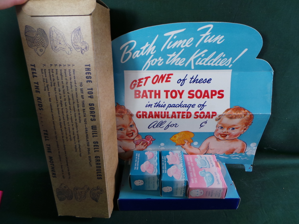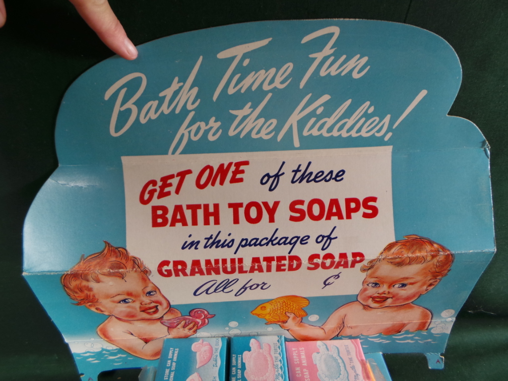 This sweet NOS diecut cardboard counter display dates from the 1940’s and has a super image of two toddlers, in the bath tub, playing with their toy soaps. The display is inscribed “Bath Time Fun for the Kiddies ! Get One of these Bath Toy Soaps in the package of Granulated Soap All for c.” A platform at the base of the sign has cutouts for three soaps, which are included in their original boxes, Frankie the fish, Dubbie the duck, and Freddie the frog. The display comes with its original box which has images of the soaps, instructions for assembling the display, and the inscription “These toy soaps will sell granules, tell the kids …. tell the mothers.” The display measures about 13″ tall by 13 3/4″ wide and the box measures about 14″ long by 3″ tall by 3 3/4″ wide. Both pieces are in excellent condition with some light creases on the right end of the display. 9151-41UT