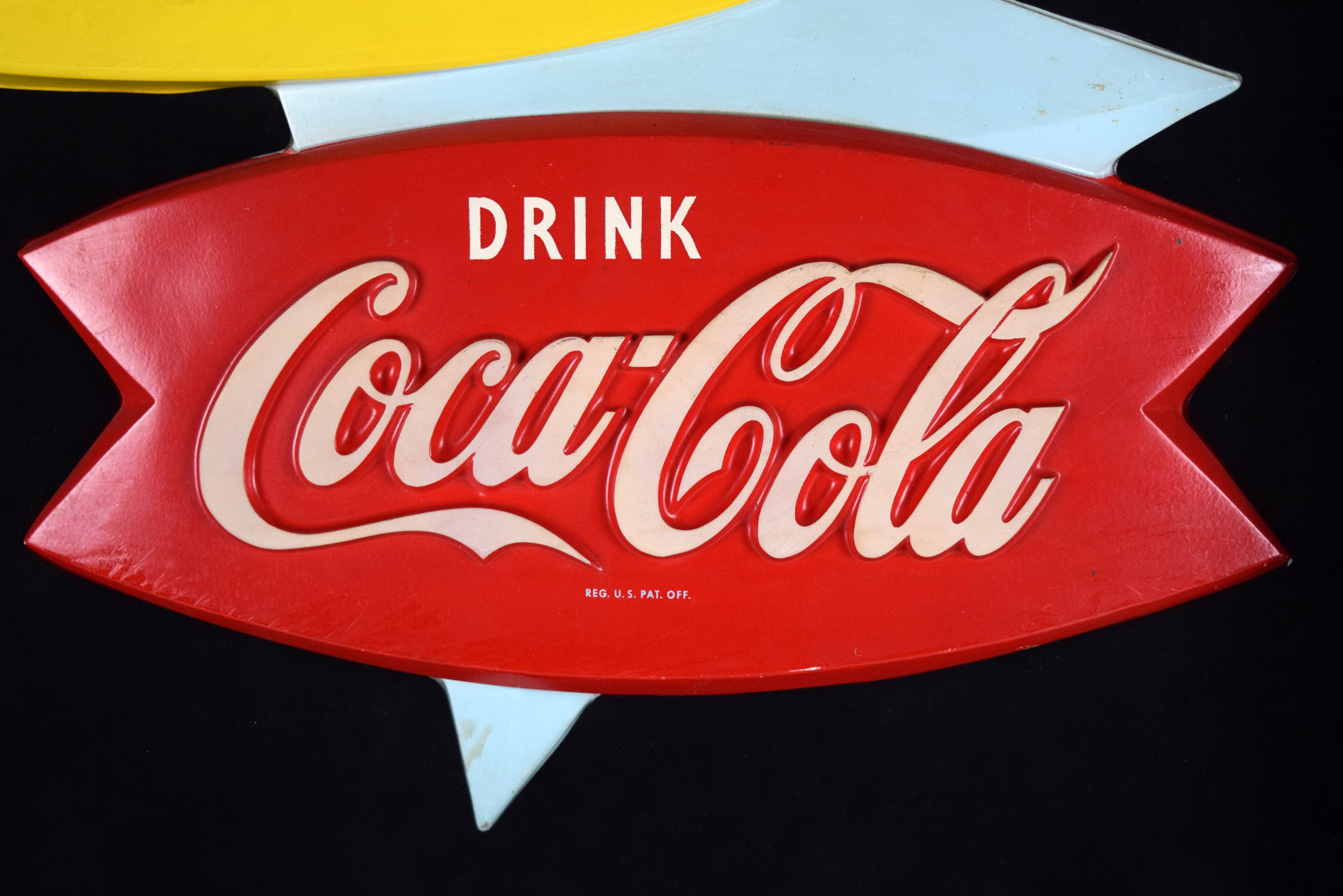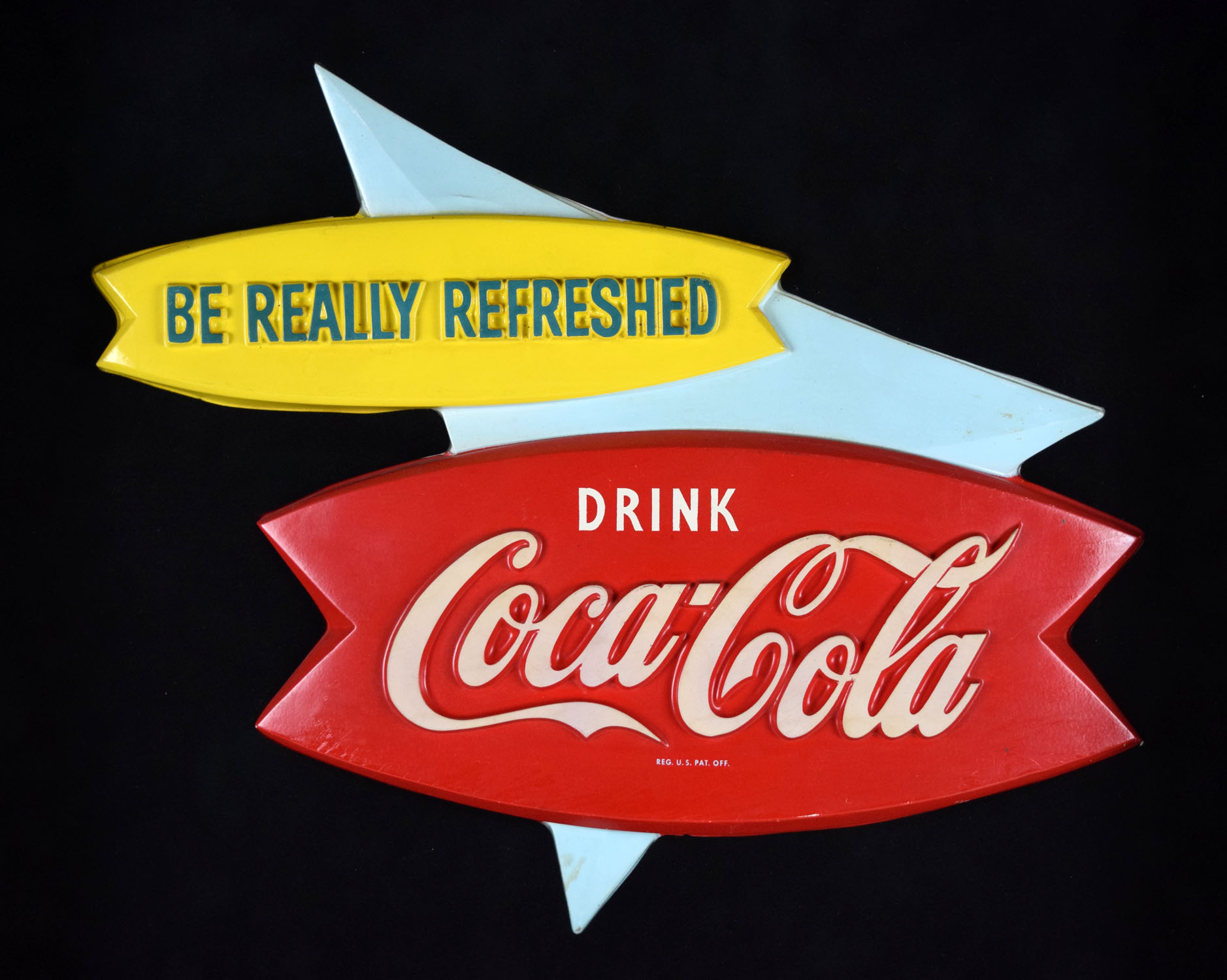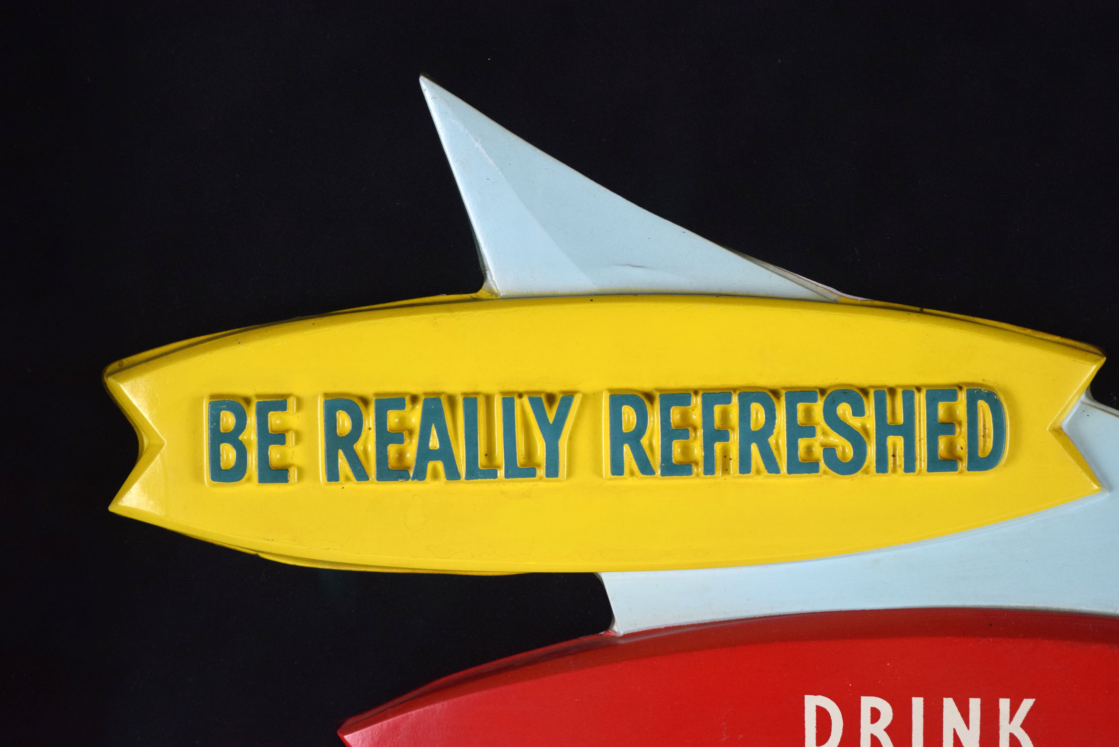 Professionally framed in a beautiful shadow box, this 3D vacuum formed plastic sign has the iconic Coca Cola fishtail logo and dates from the late 1950’s. “Be Really Refreshed” and “Drink Coca Cola” are 3 dimensional from the fishtail logos, with amazing colors. Not many of these signs survived, as they were very lightweight plastic and only used for a short time period. This rare piece displays nicely and with the added shadowbox framing it makes it easy to display and admire. 19821-QPT