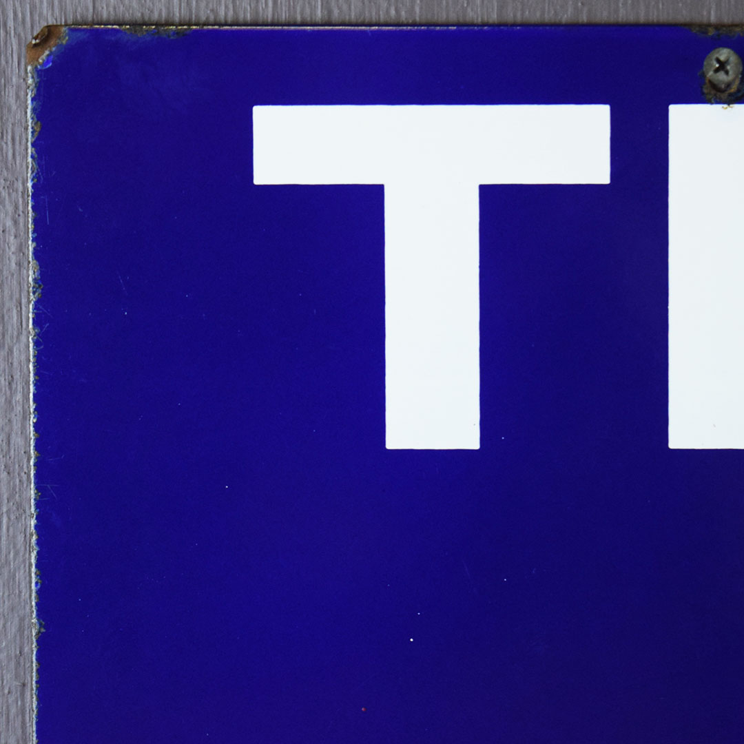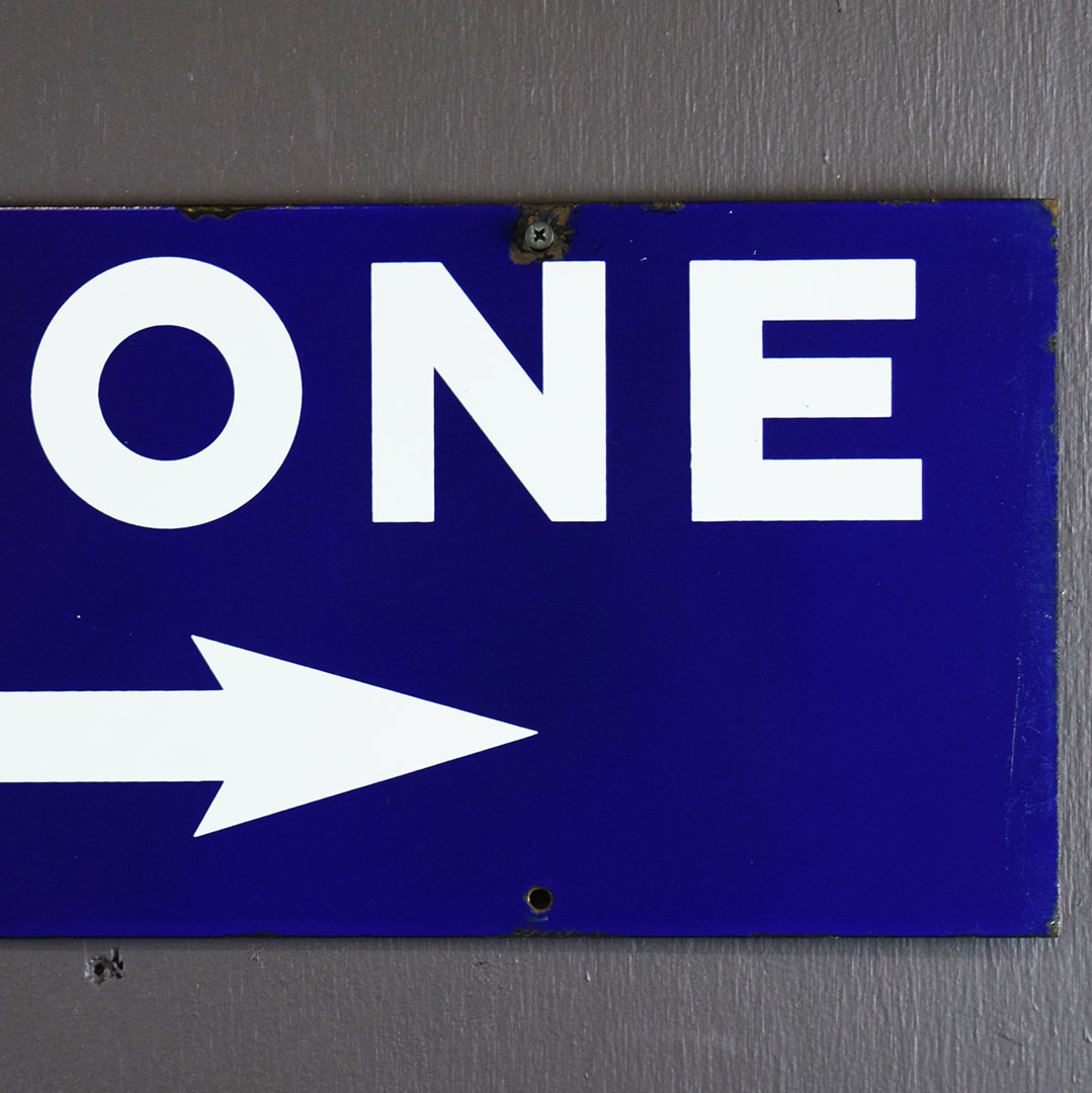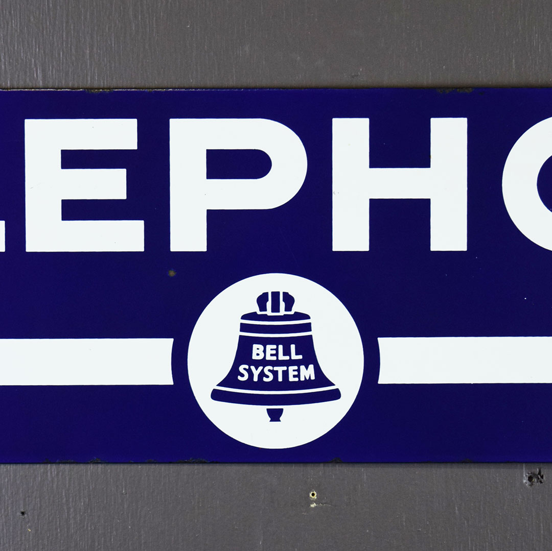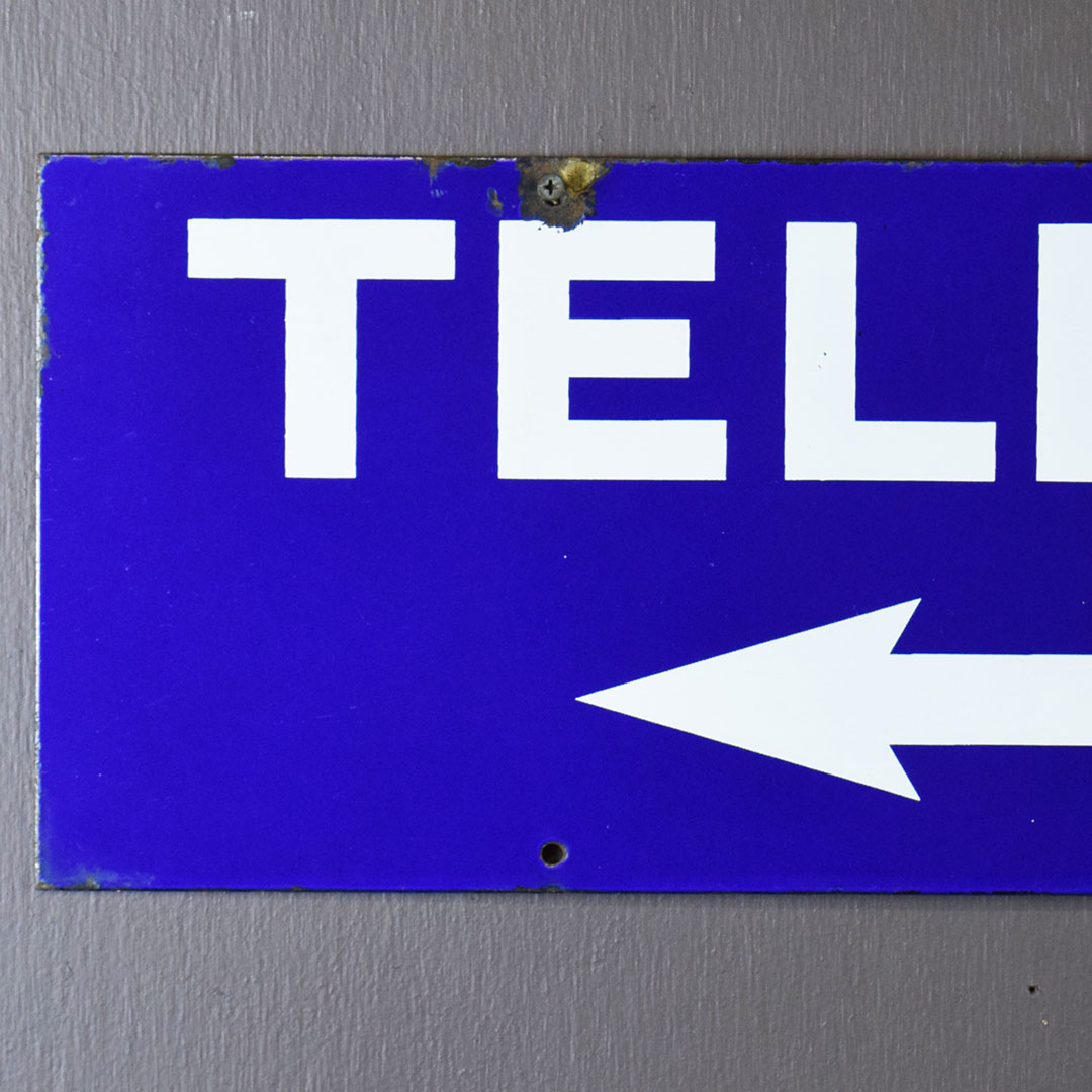 In outstanding condition, this large Bell System Telephone porcelain sign is ready for your collection! It measures 8.5 inches tall by 34.5 inches wide and features a directional arrow on both sides, with the Bell System bell in the middle of the arrow. The top left ring hole has some minor porcelain chips around it and some minor chips along the outer edges. With the arrow pointing to the left, a slight bend is in the upper right corner with porcelain loss. A few minor chips are on the field of this 1940s porcelain sign, which rates it an 8.9. 20987-RWT