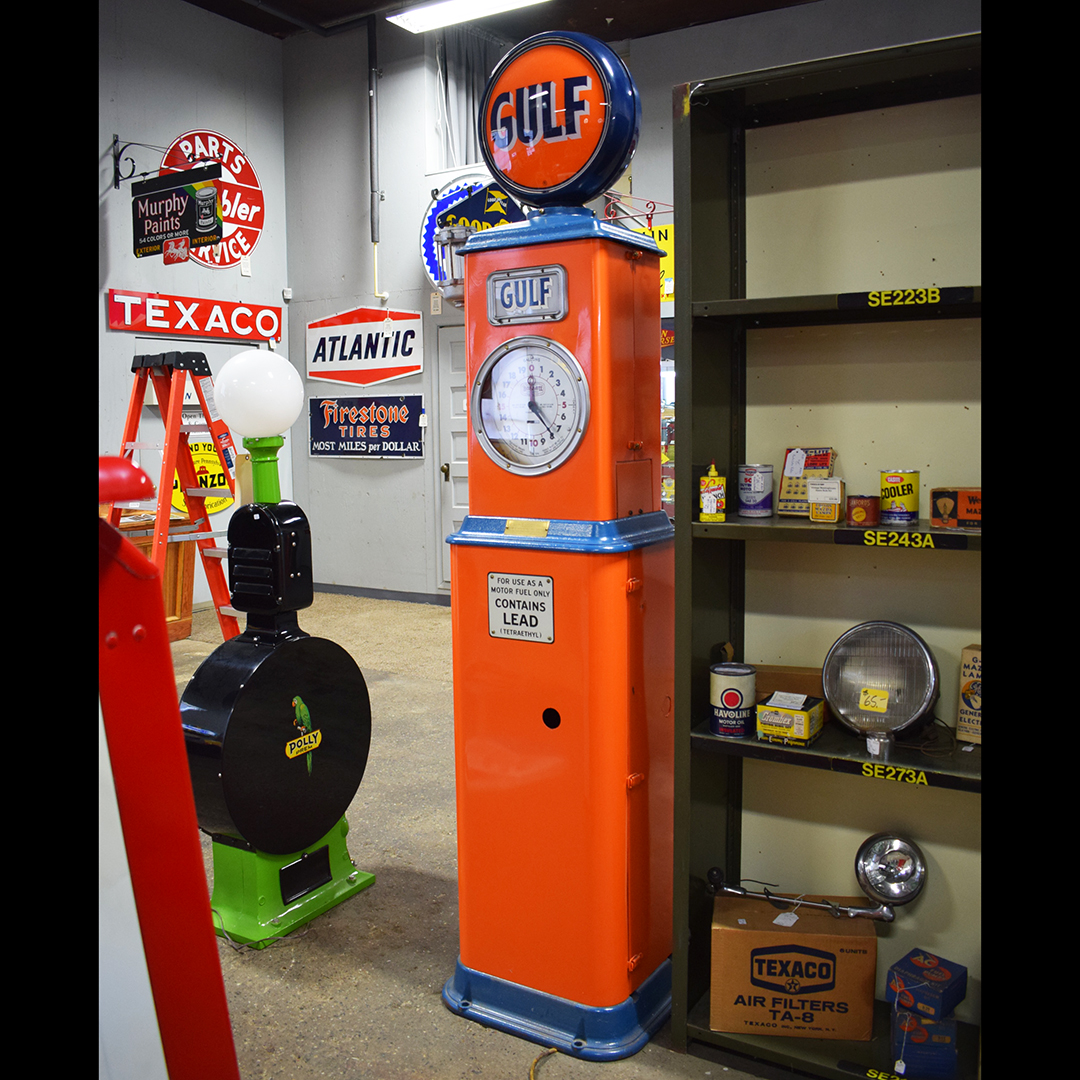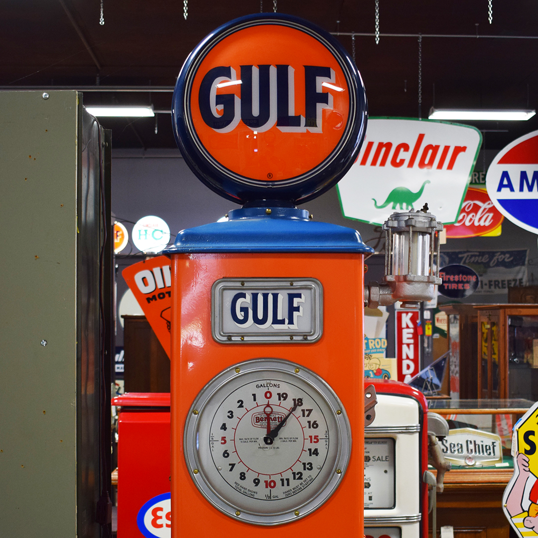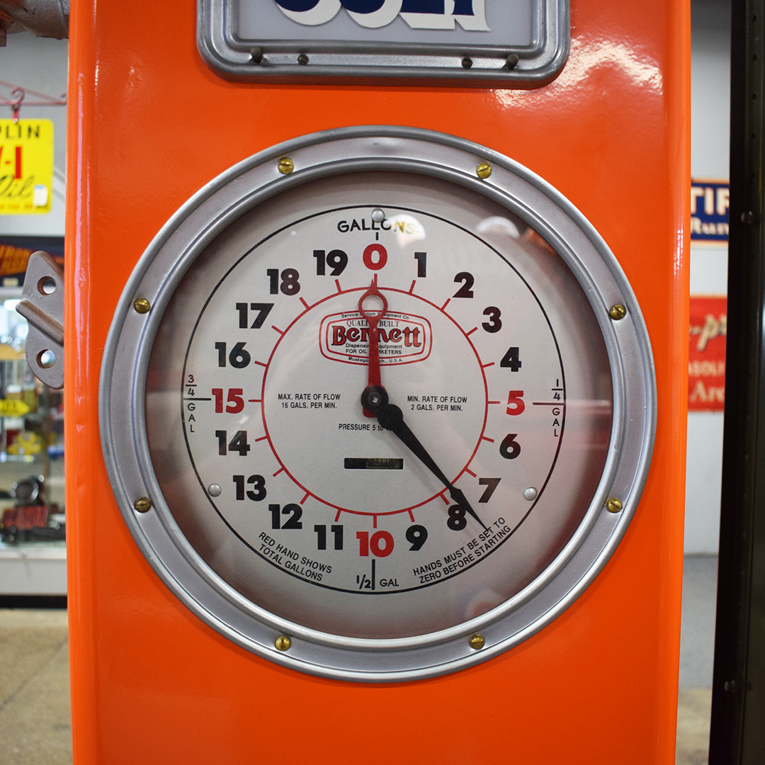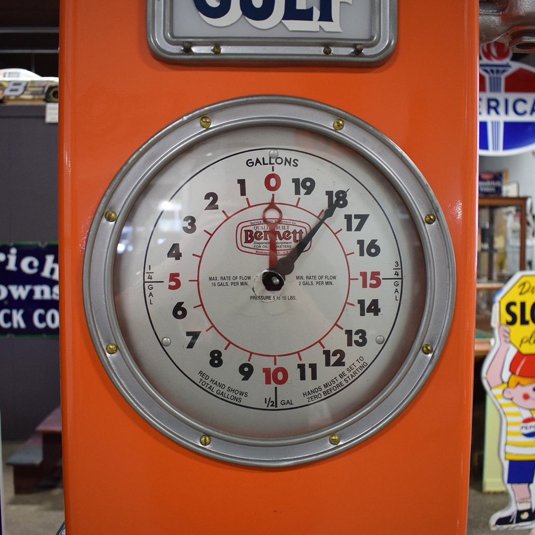As the technology evolved, gravity-fed gas pumps gave way to a more modern approach to fuel dispensing, especially in larger cities. The Bennett 150 gas pump, dating from 1929 to 1935, has been restored in Gulf colors. The Bennett 150 pump was called “Clock Face” due to the center dial resembling a wall clock. This older restoration is in excellent condition, with minor chips and marks that have developed over the years. The pump mechanism is missing inside, so this pump is for display purposes only. Additionally, the metal globe features reproduction lenses dated July 1985. The pump is missing both the gas pump hose and the handle. One of the glass lenses has a hole, as the center shaft protrudes from the clock face. The gas pump faces and brass plaques are replacements. The cast iron base measures 22 inches square, and the pump stands 92 inches tall with the globe attached. This pump is not a shippable item; it will require a third-party shipper or pickup. 21356-EPPP