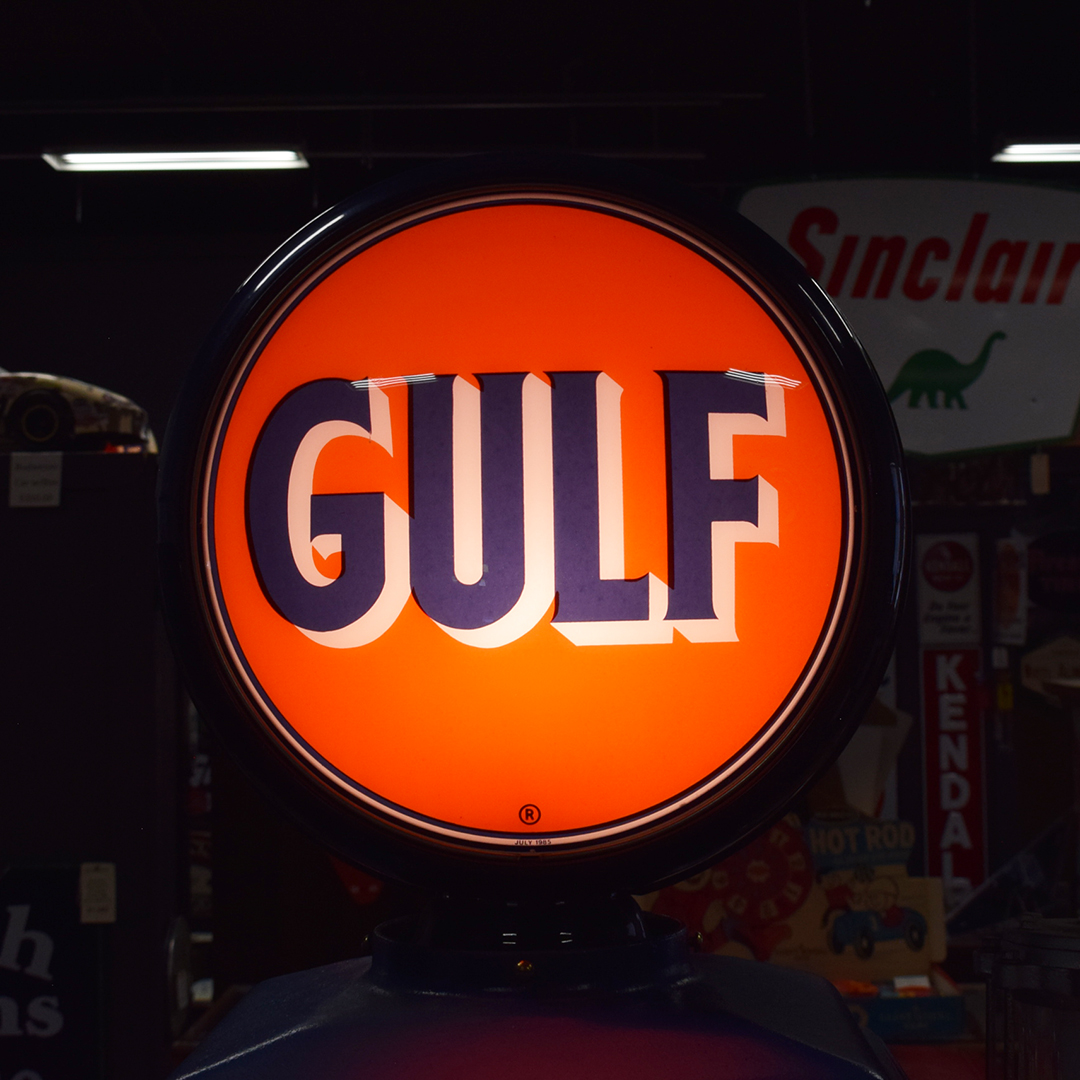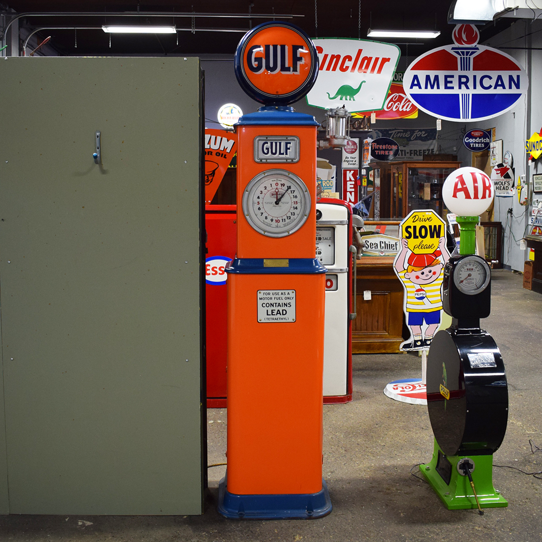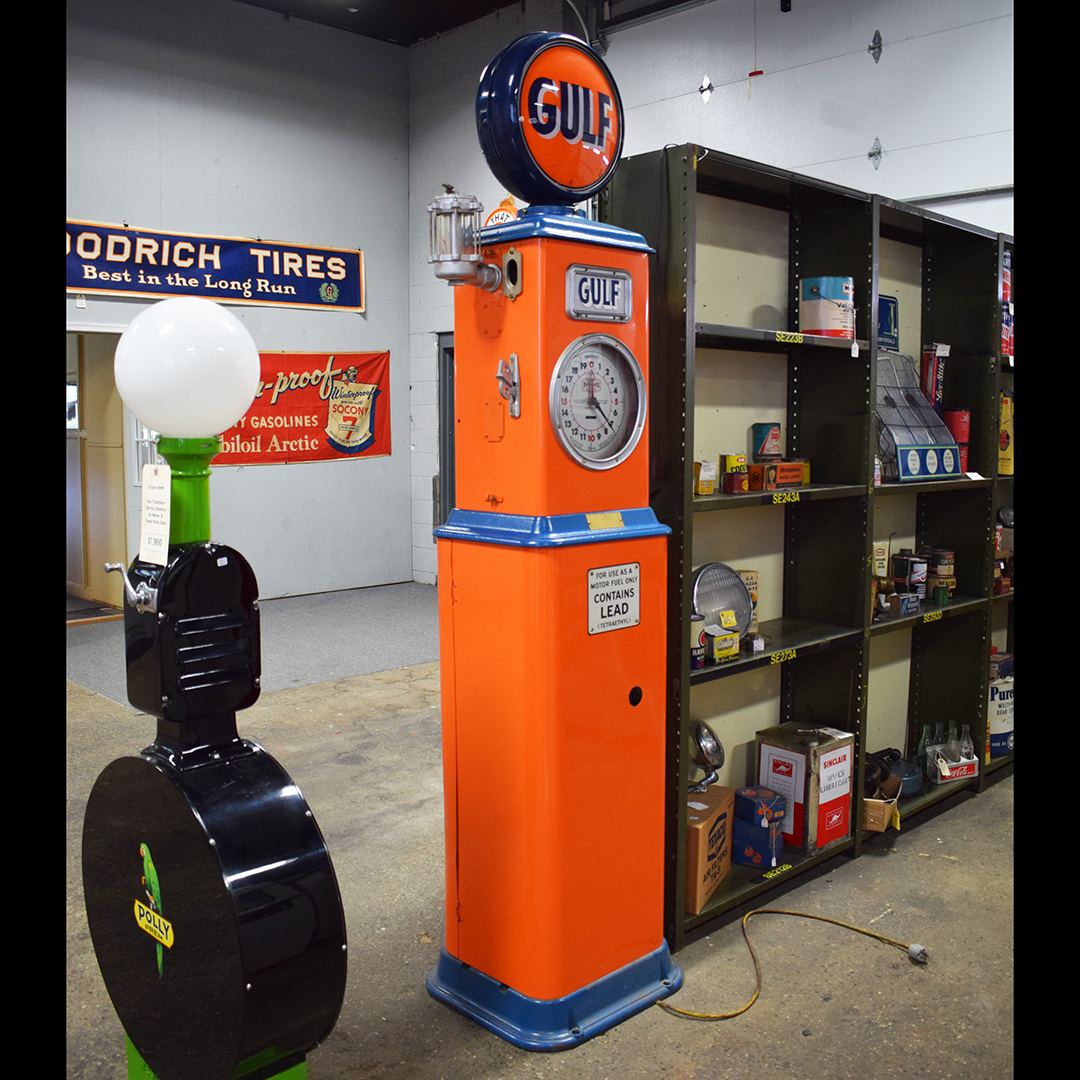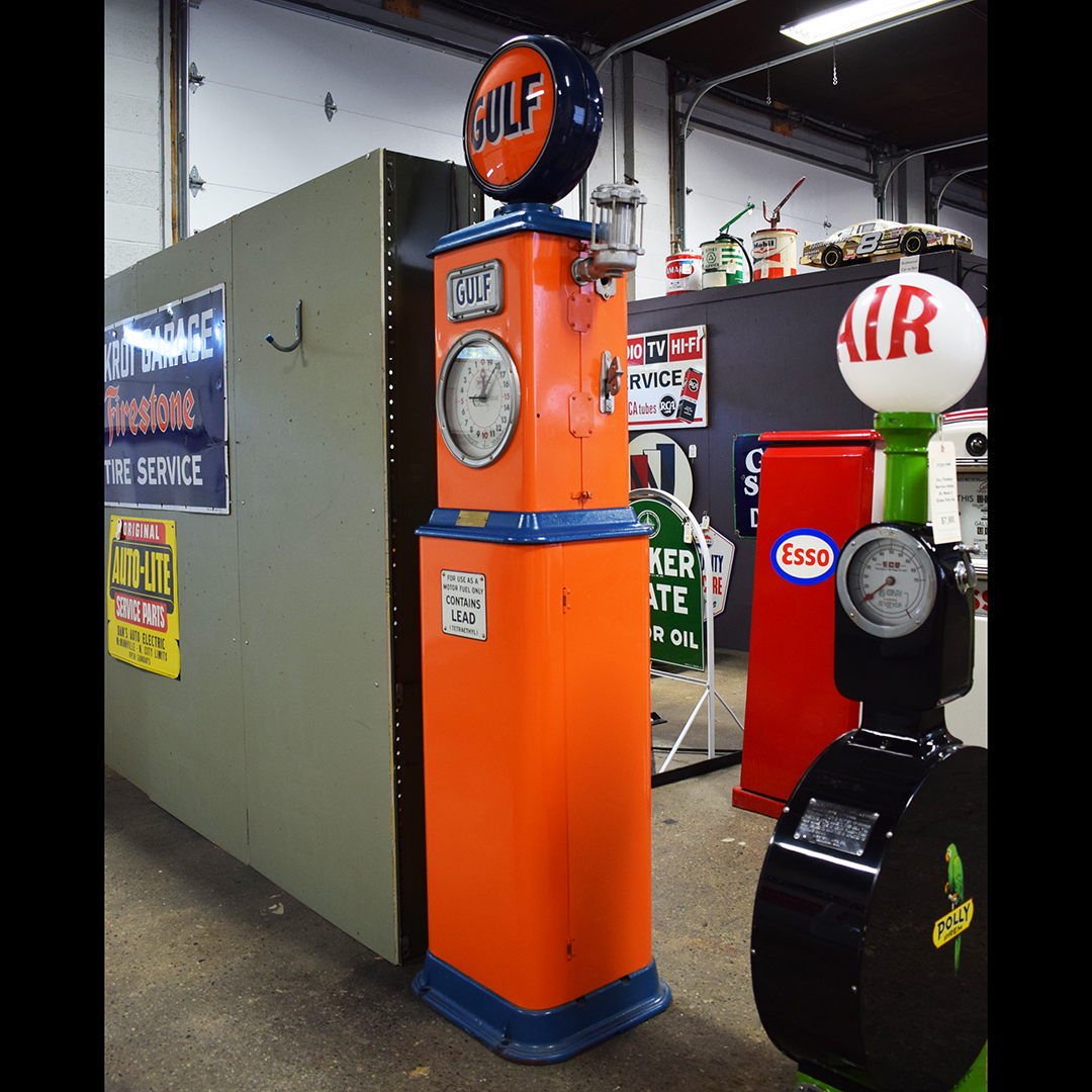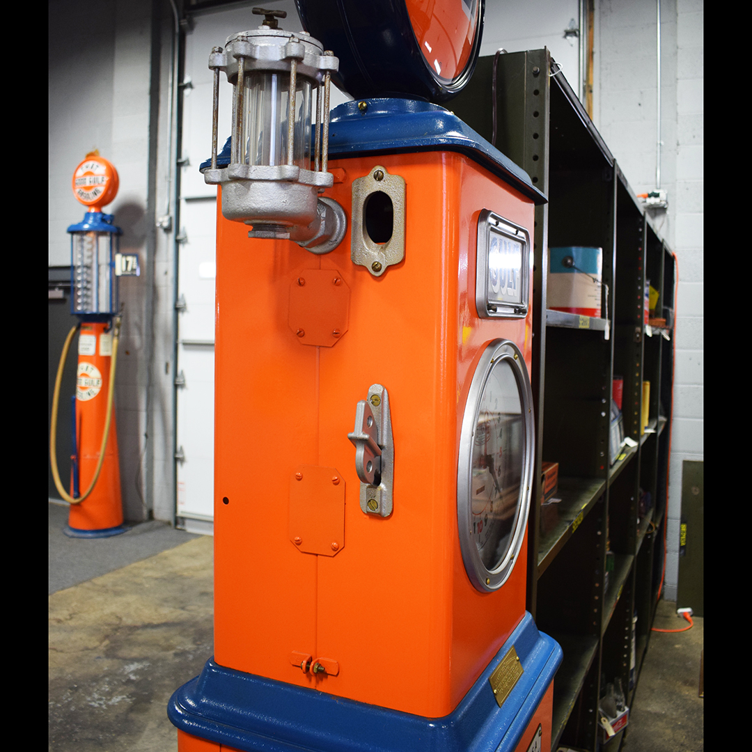 As the technology evolved, gravity-fed gas pumps gave way to a more modern approach to fuel dispensing, especially in larger cities. The Bennett 150 gas pump, dating from 1929 to 1935, has been restored in Gulf colors. The Bennett 150 pump was called “Clock Face” due to the center dial resembling a wall clock. This older restoration is in excellent condition, with minor chips and marks that have developed over the years. The pump mechanism is missing inside, so this pump is for display purposes only. Additionally, the metal globe features reproduction lenses dated July 1985. The pump is missing both the gas pump hose and the handle. One of the glass lenses has a hole, as the center shaft protrudes from the clock face. The gas pump faces and brass plaques are replacements. The cast iron base measures 22 inches square, and the pump stands 92 inches tall with the globe attached. This pump is not a shippable item; it will require a third-party shipper or pickup. 21356-EPPP