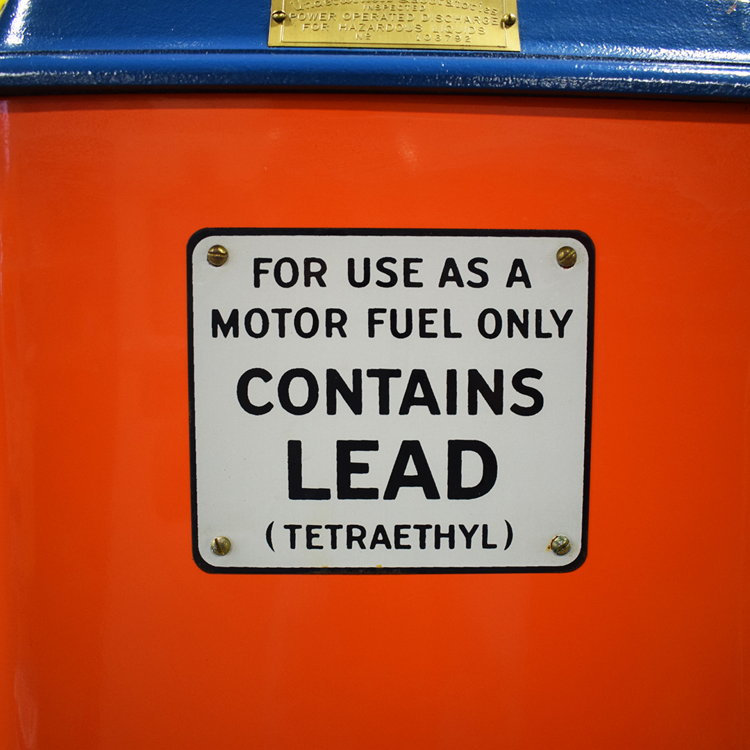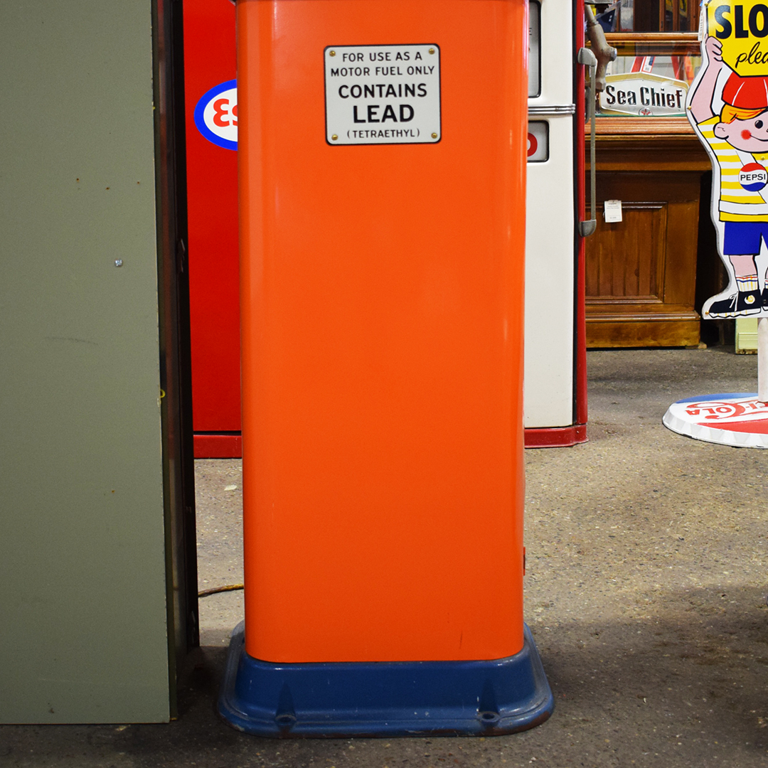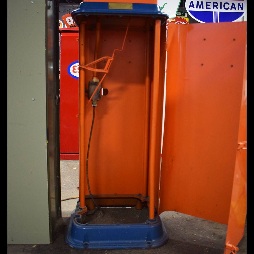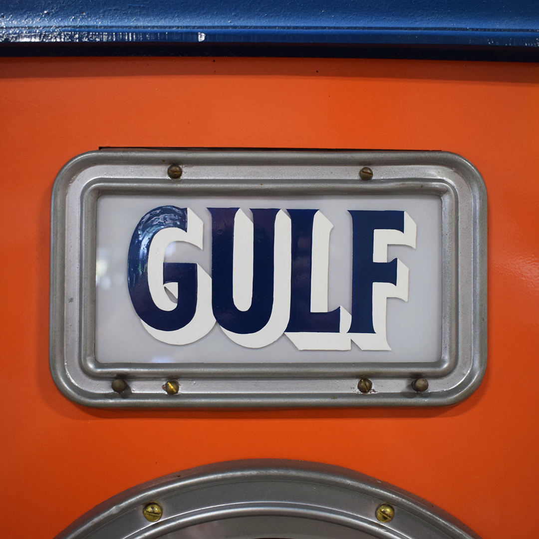 As the technology evolved, gravity-fed gas pumps gave way to a more modern approach to fuel dispensing, especially in larger cities. The Bennett 150 gas pump, dating from 1929 to 1935, has been restored in Gulf colors. The Bennett 150 pump was called “Clock Face” due to the center dial resembling a wall clock. This older restoration is in excellent condition, with minor chips and marks that have developed over the years. The pump mechanism is missing inside, so this pump is for display purposes only. Additionally, the metal globe features reproduction lenses dated July 1985. The pump is missing both the gas pump hose and the handle. One of the glass lenses has a hole, as the center shaft protrudes from the clock face. The gas pump faces and brass plaques are replacements. The cast iron base measures 22 inches square, and the pump stands 92 inches tall with the globe attached. This pump is not a shippable item; it will require a third-party shipper or pickup. 21356-EPPP