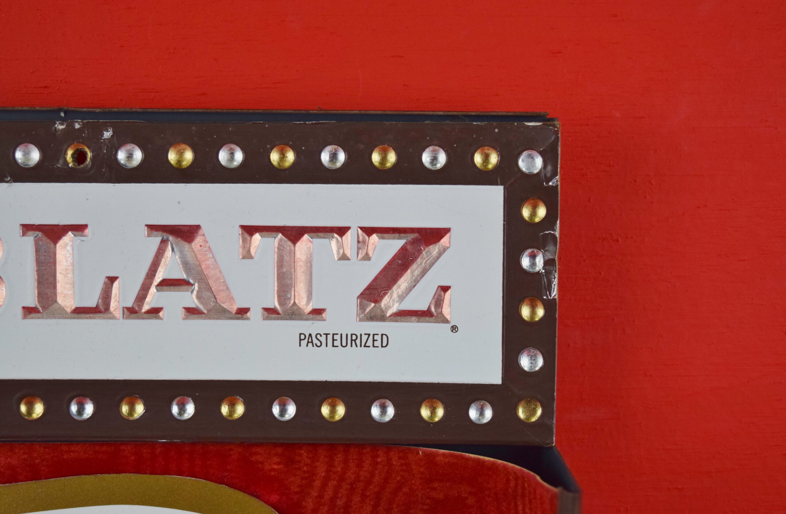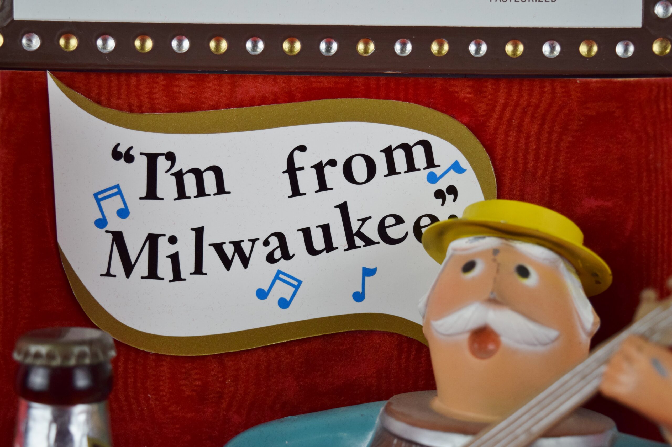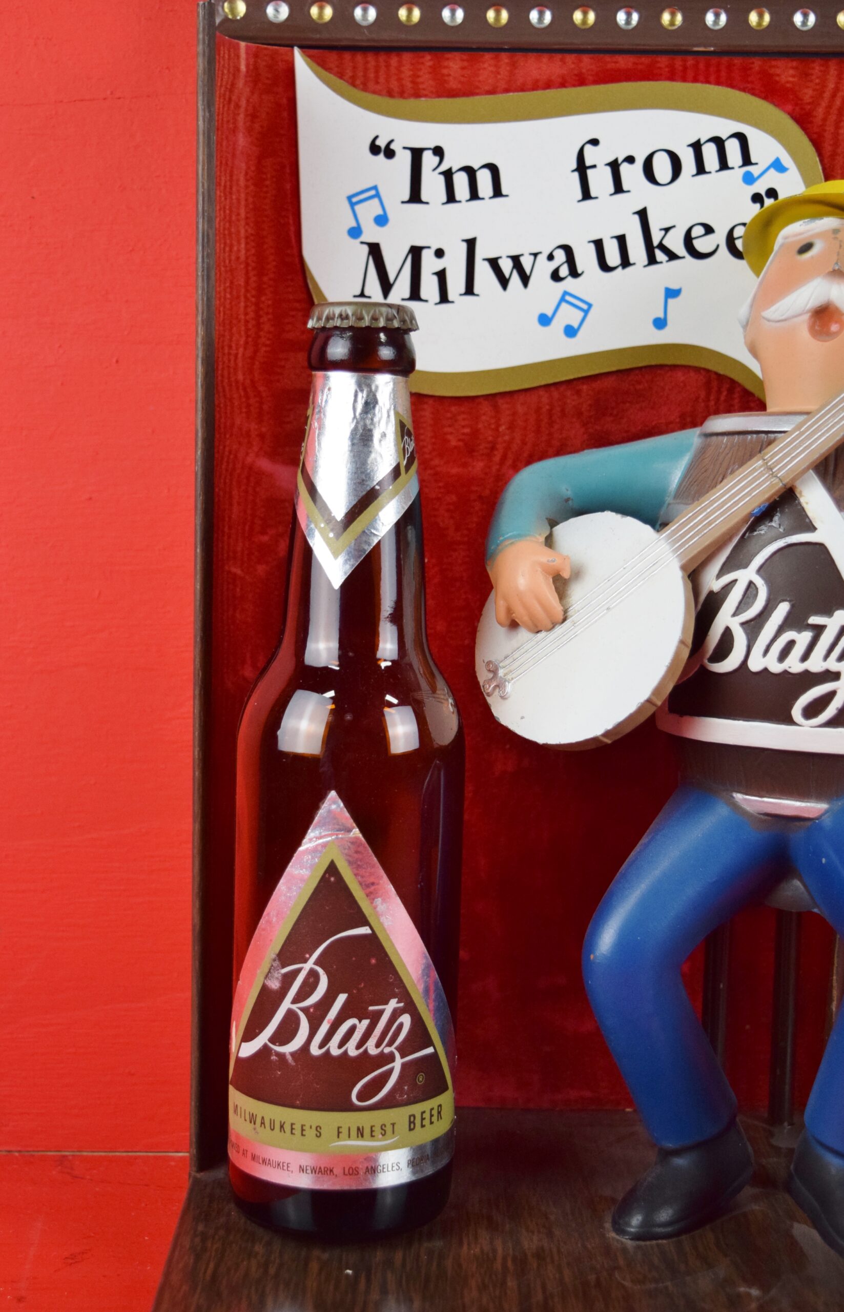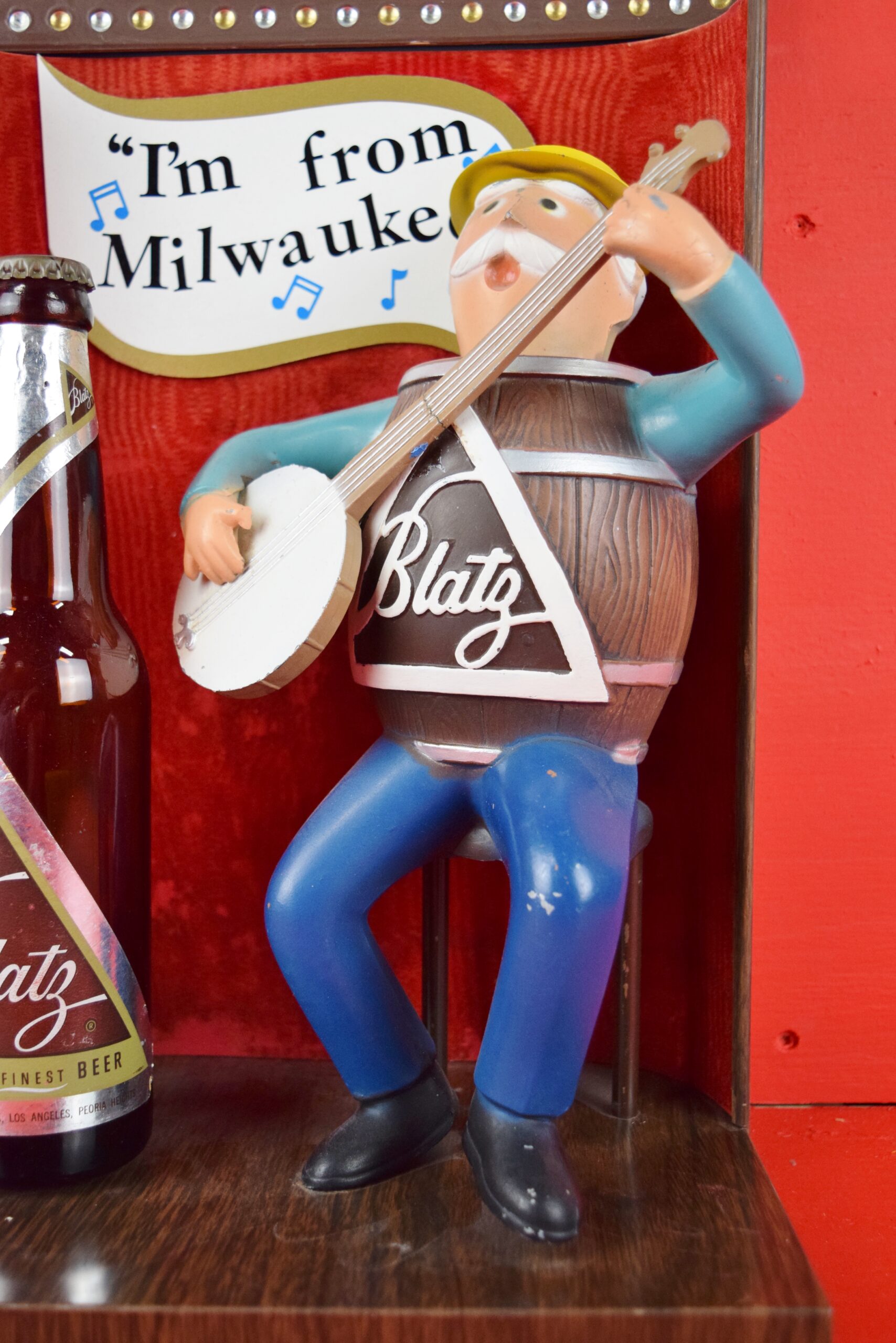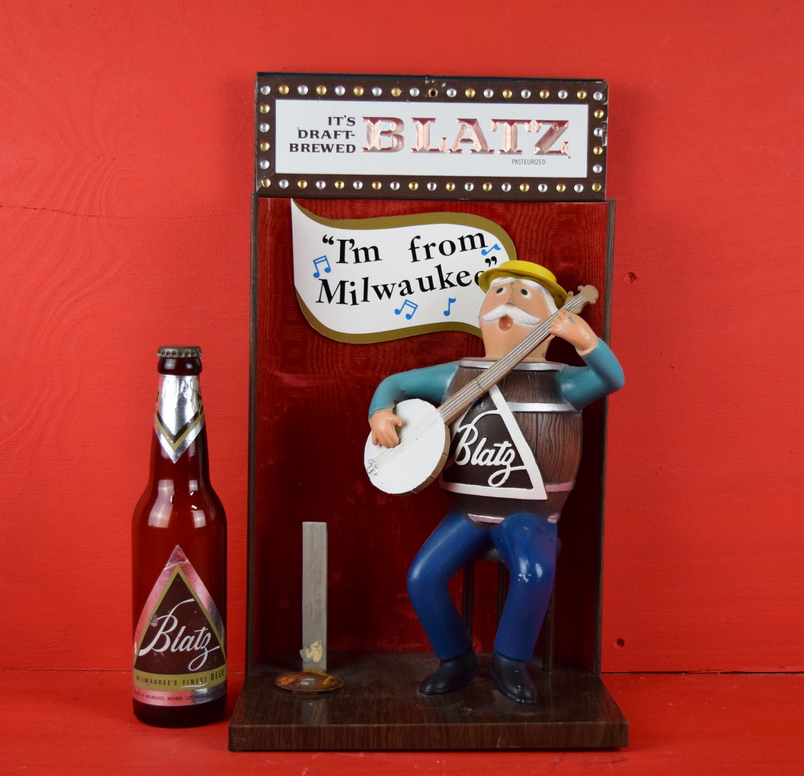 The Blatz Brewing Company was one of Milwaukee’s industrial brewing giants. In 1875, Blatz was the first Milwaukee brewery to have a bottling department to package beer and ship nationally. The company operated from 1851 to 1959, when it was purchased by Pabst Brewing Company. This all metal (aside from glass bottle) sign is from the 1950’s and features Blatz’s beer barrel man singing and playing the banjo. Behind him is a fabric curtain with the words “I’m from Milwaukee…” and a sign with gold and silver faux lights that reads “It’s Draft Brewed Blatz” above him. To his right is a display bottle of Blatz beer. The bottle was glued to the display at one time, but is now loose. The sign on top of the display has a hole drilled in the middle where it was hung from a wall, along with some peeling on the right side. The barrel man has some chips on his pant leg, along with a rub mark on his nose and hands. His banjo has a crack in the neck that has been glued. These beer displays are getting harder to find everyday, so don’t miss your chance! 19337-WUP
