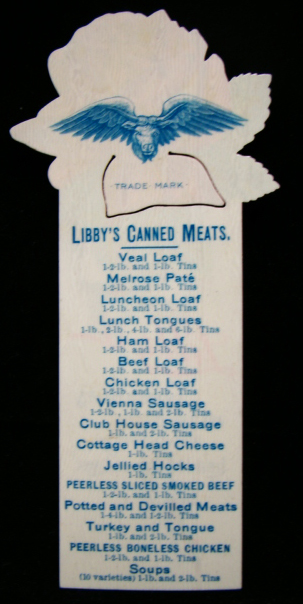 If I had a personal collection these old bookmarks would be the thing I would collect. The colors and graphics are wonderful and were special things for people back in the early 1900’s. There were not many books back then and normally the only book that a family had was a Bible. This colorful celluloid bookmark with a wonderful image of a red rose and the inscription “Libby’s canned meats are the best, manufactured by Libby, McNeill, & Libby, Chicago.” The back of the bookmark has an image of a winged longhorn steer at the top and lists the Libby’s Canned Meats products below. It is in excellent condition with a slight crease on a rose pedal and light soiling in a couple of spots. 7116-11WU
