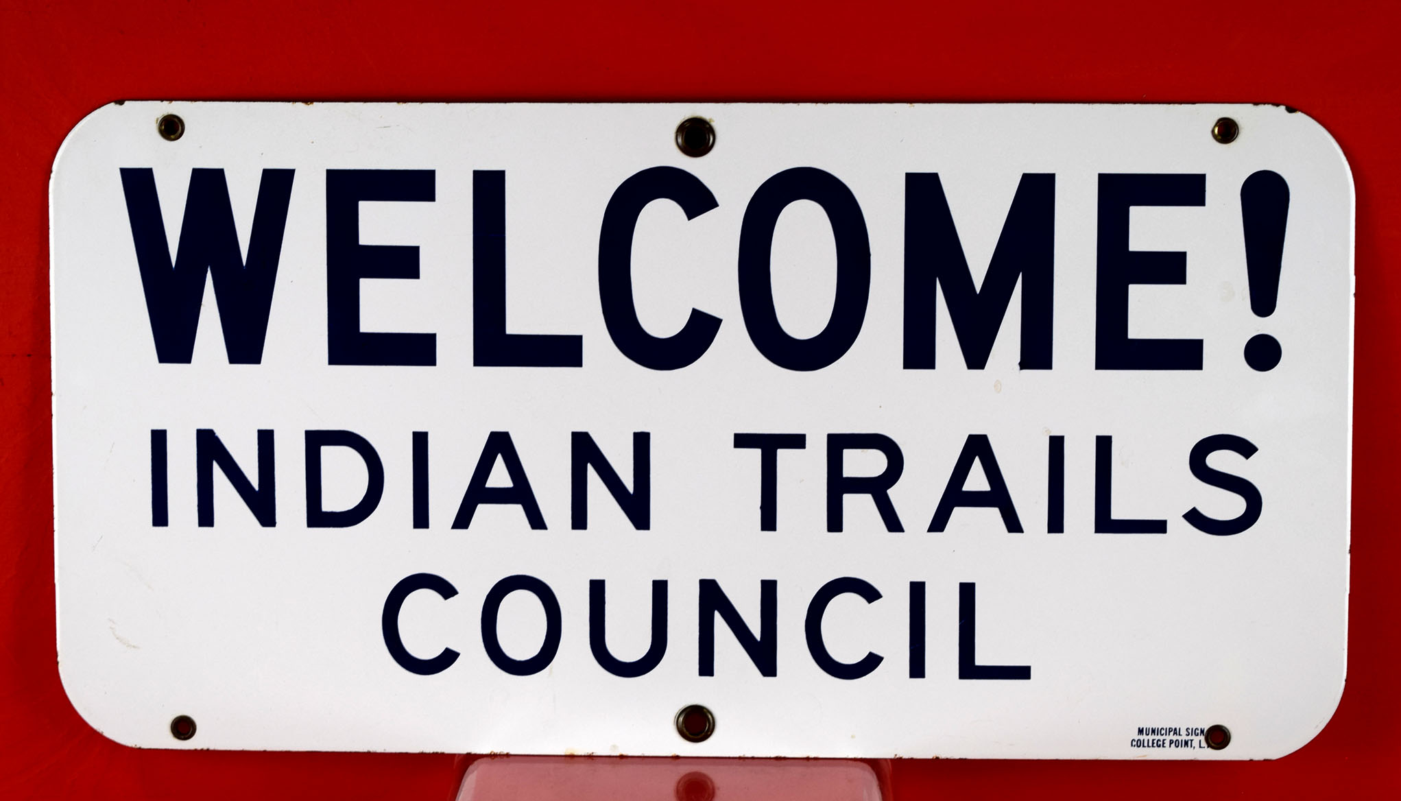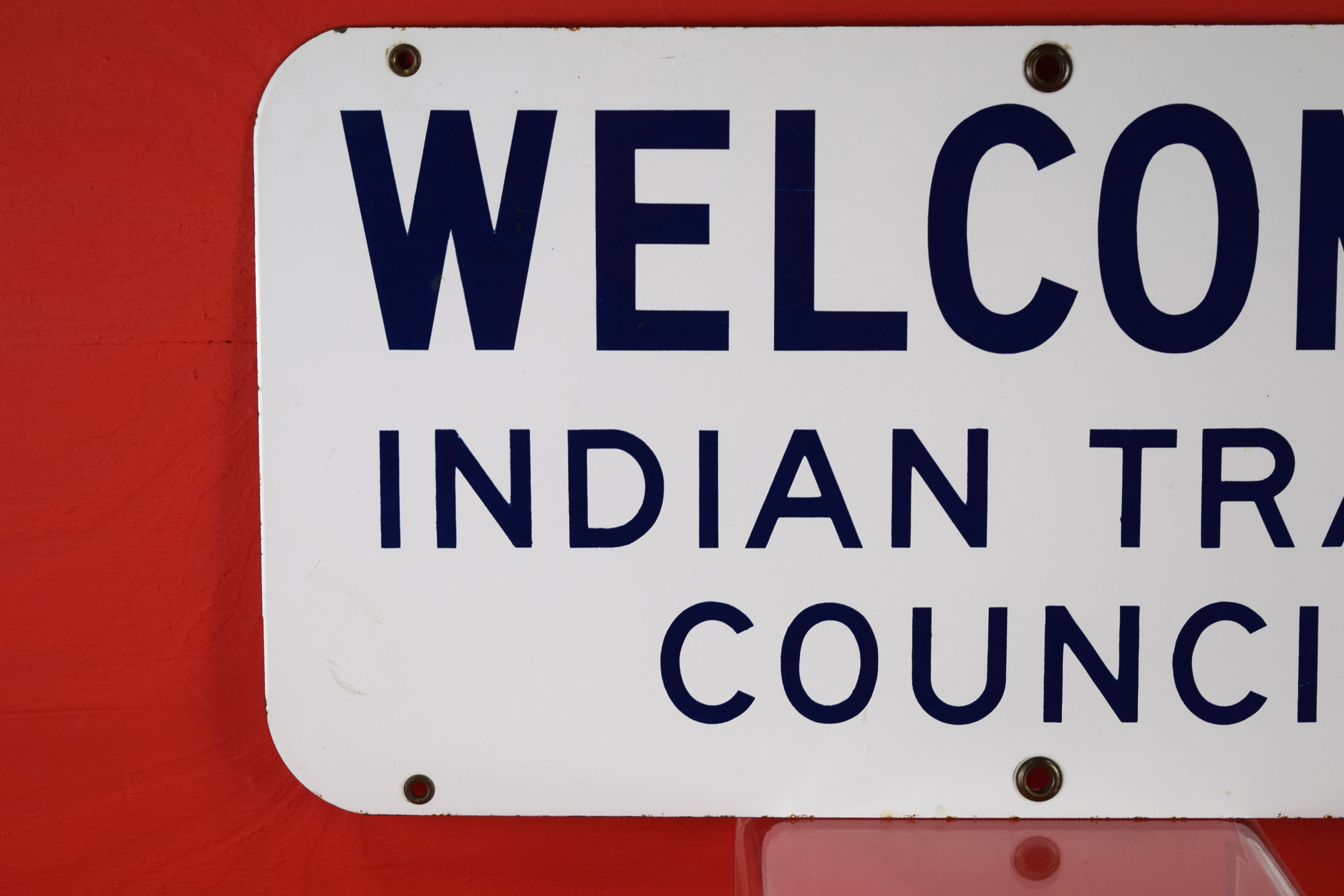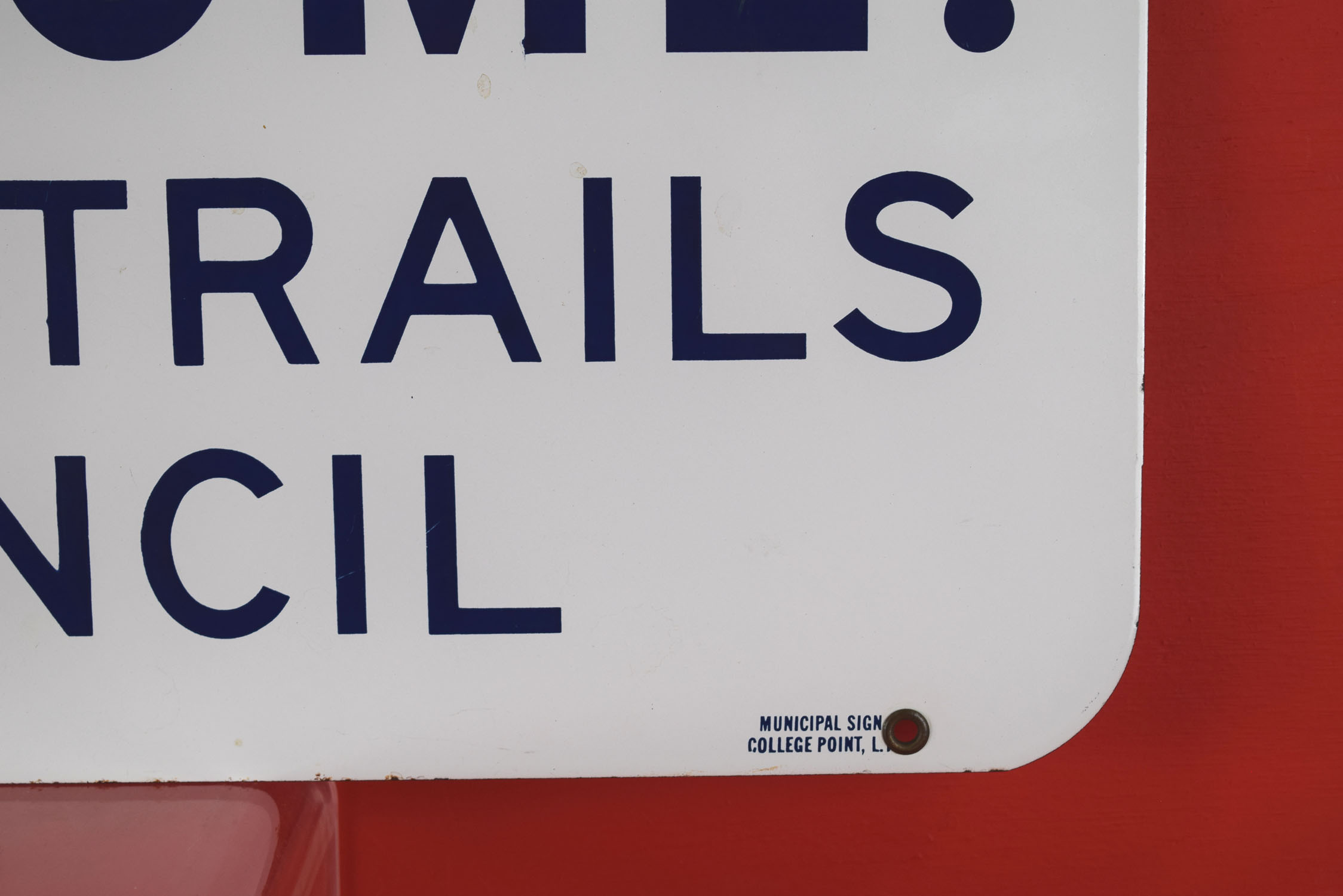 The colors are sharp as the gloss on this beautiful ten by twenty inch sign that is ready for your collection! We believe this to be from a Boy Scout Camp from the 1960’s, and it reads “Welcome! Indian Trails Council” in large bold blue letters that read nicely against the white background. The outer edges are round, with six original brass grommets. Some minor chipping around the outer lip can be seen, but the center field is very nice without any damage. The sign was produced by “Municipal Sign Co. in College Point”, as marked in the lower right corner. 19606-EPP