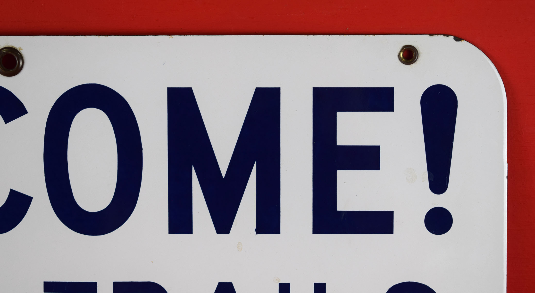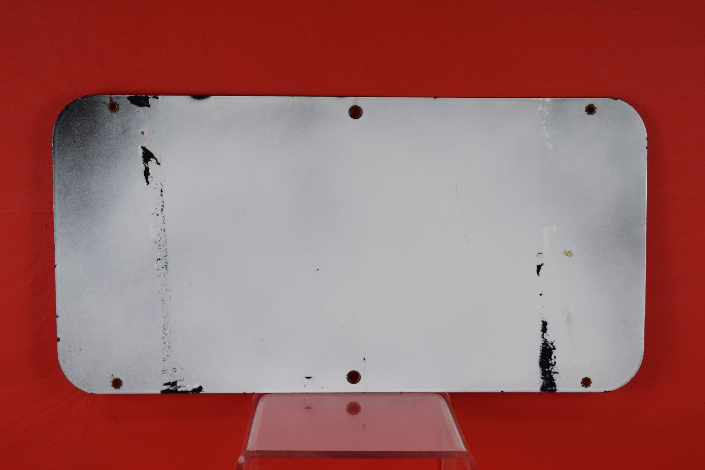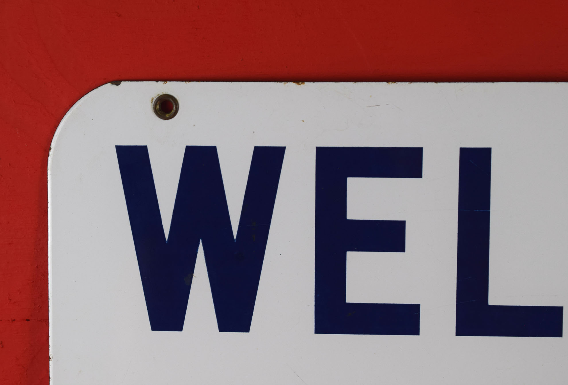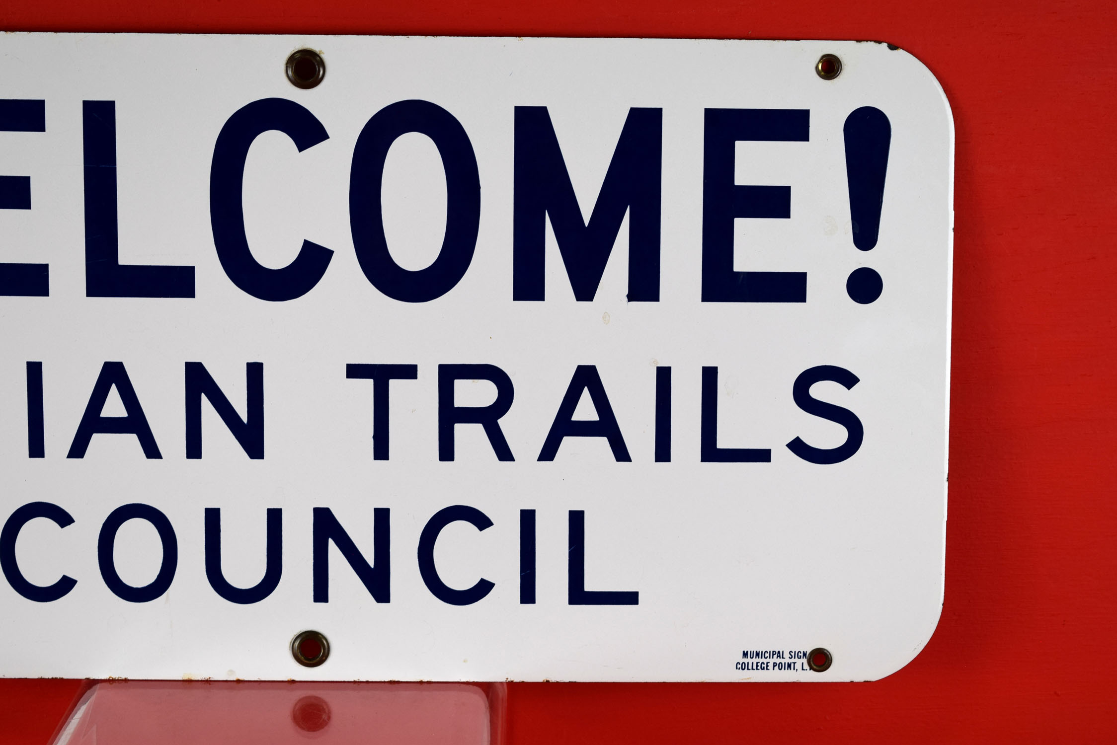The colors are sharp as the gloss on this beautiful ten by twenty inch sign that is ready for your collection! We believe this to be from a Boy Scout Camp from the 1960’s, and it reads “Welcome! Indian Trails Council” in large bold blue letters that read nicely against the white background. The outer edges are round, with six original brass grommets. Some minor chipping around the outer lip can be seen, but the center field is very nice without any damage. The sign was produced by “Municipal Sign Co. in College Point”, as marked in the lower right corner. 19606-EPP