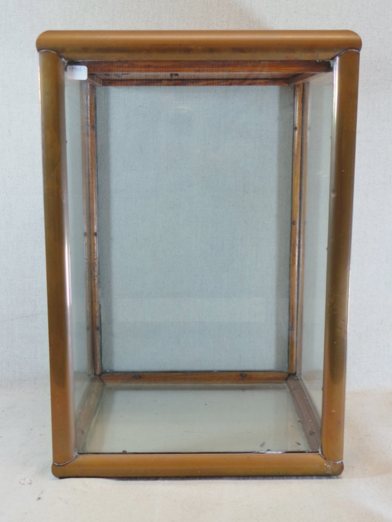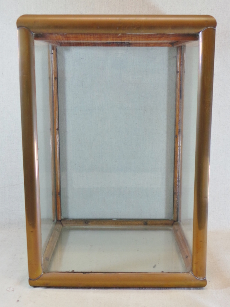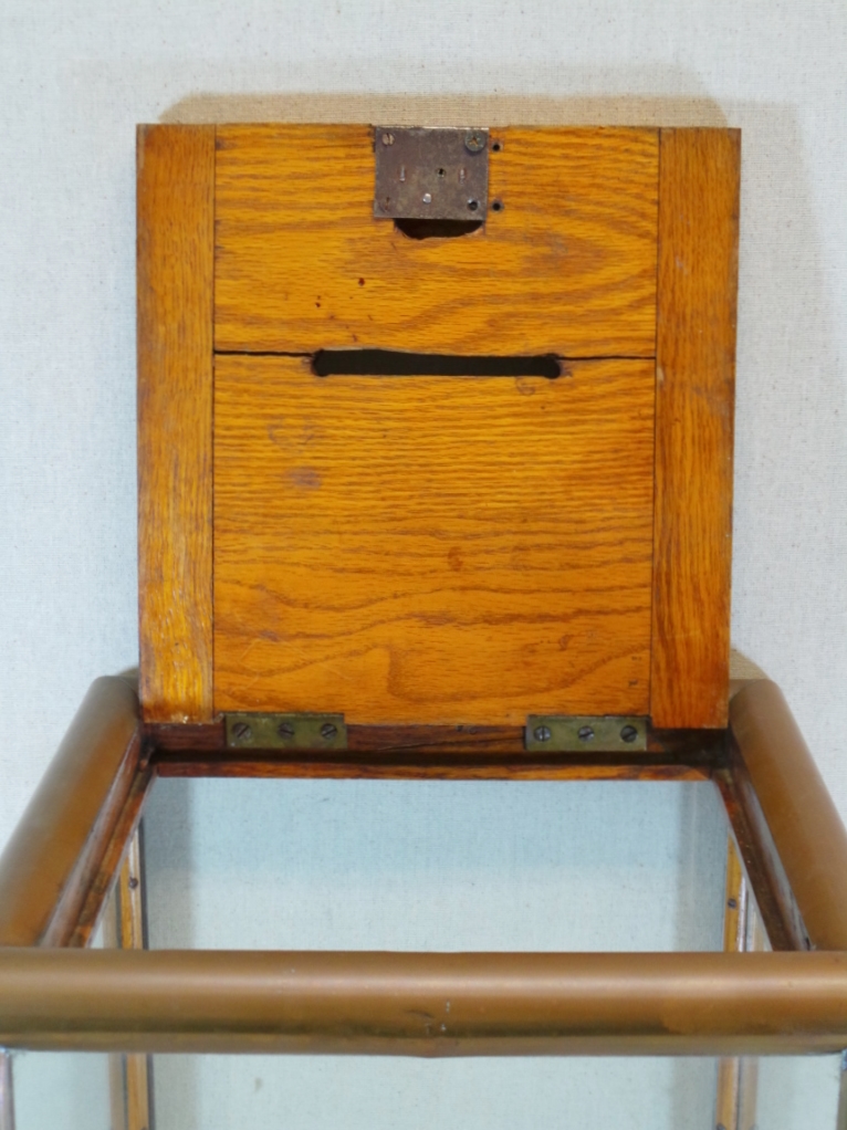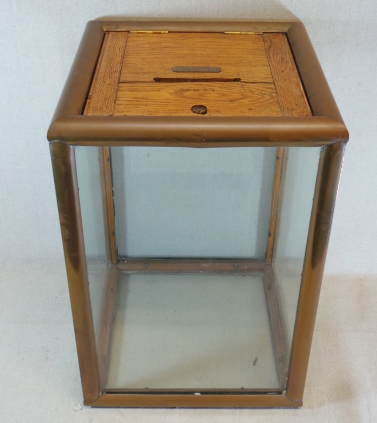 This neat glass sided visible ballot box would make a nice addition to your home or office! It has glass on five sides (including the bottom), brass edging, and a wooden lid. A plate on the lid is stamped “Reine-Salmon Co. Store & Office Fixtures Baltimore – – Md.”. We do not have the key to the lock, but fortunately it is unlocked and you should be able to get a new lock very easily. Think of the possibilities of having this cool ballot box in your home! You could have the kids vote for vacation destinations, or even who does the dishes that week! That brings a new meaning to “stuffing the ballot box”! Either way, a neat piece from much simpler times! 9911-WWT