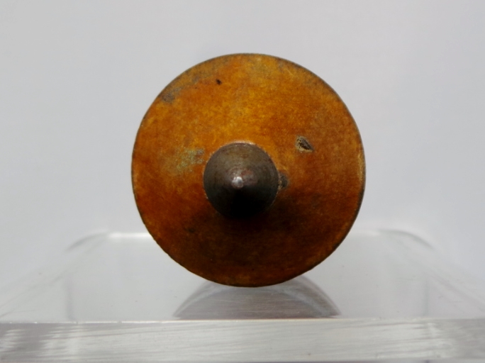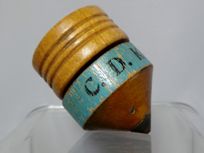 This rare little wooden top dates from the late 19th or early 20th century and was a free premium, given to customers, by C. D. Kenny Company, a Baltimore, MD. grocer. The top is inscribed “C. D. Kenny Co.” on a blue band around the center and is attached to a spring loaded wooden launcher. With the launcher it measures 2 1/2 inches tall by 1 1/2 inches in diameter and is in excellent working condition with some surface wear and paint loss from being played with. Came out of my personal collection. 3725-TP
