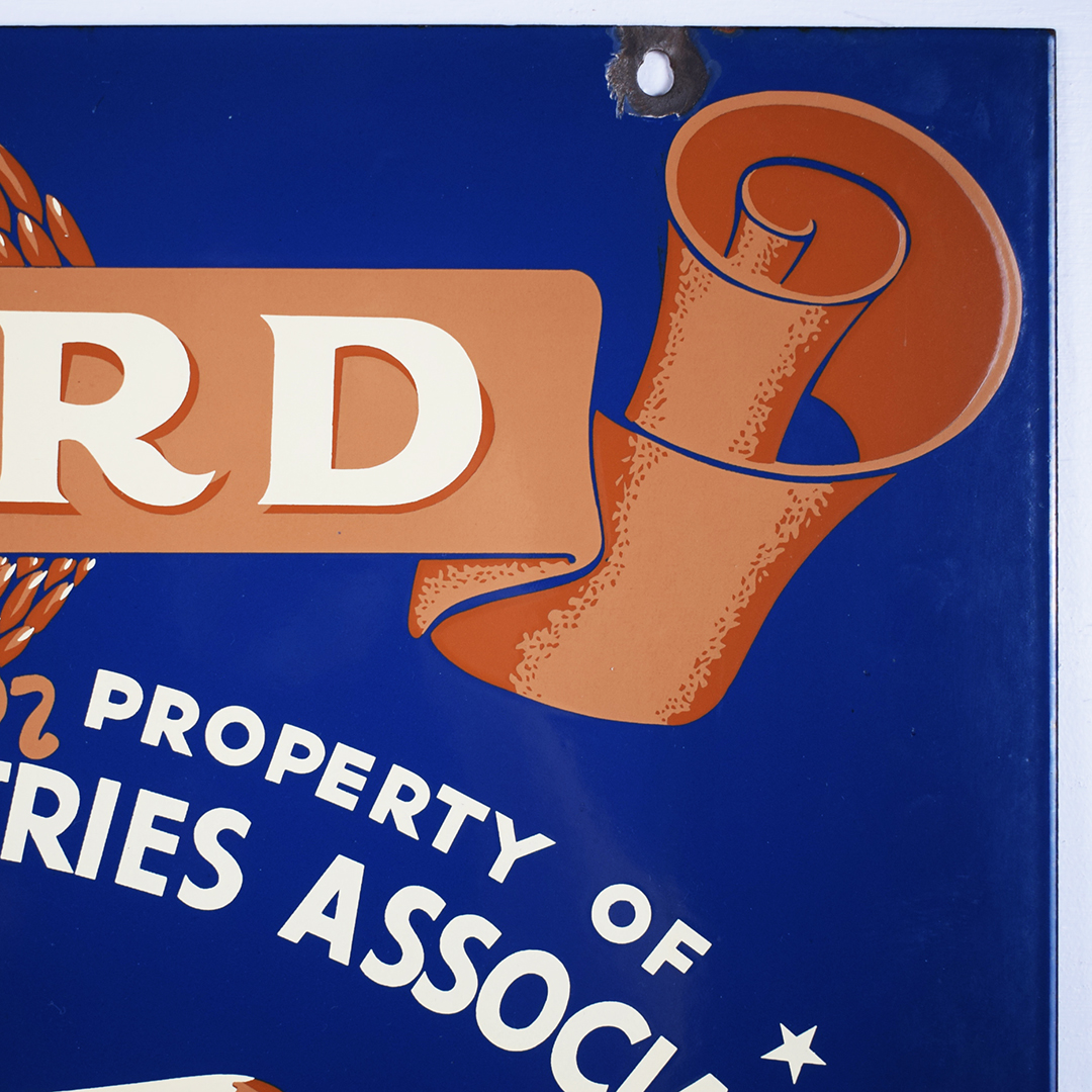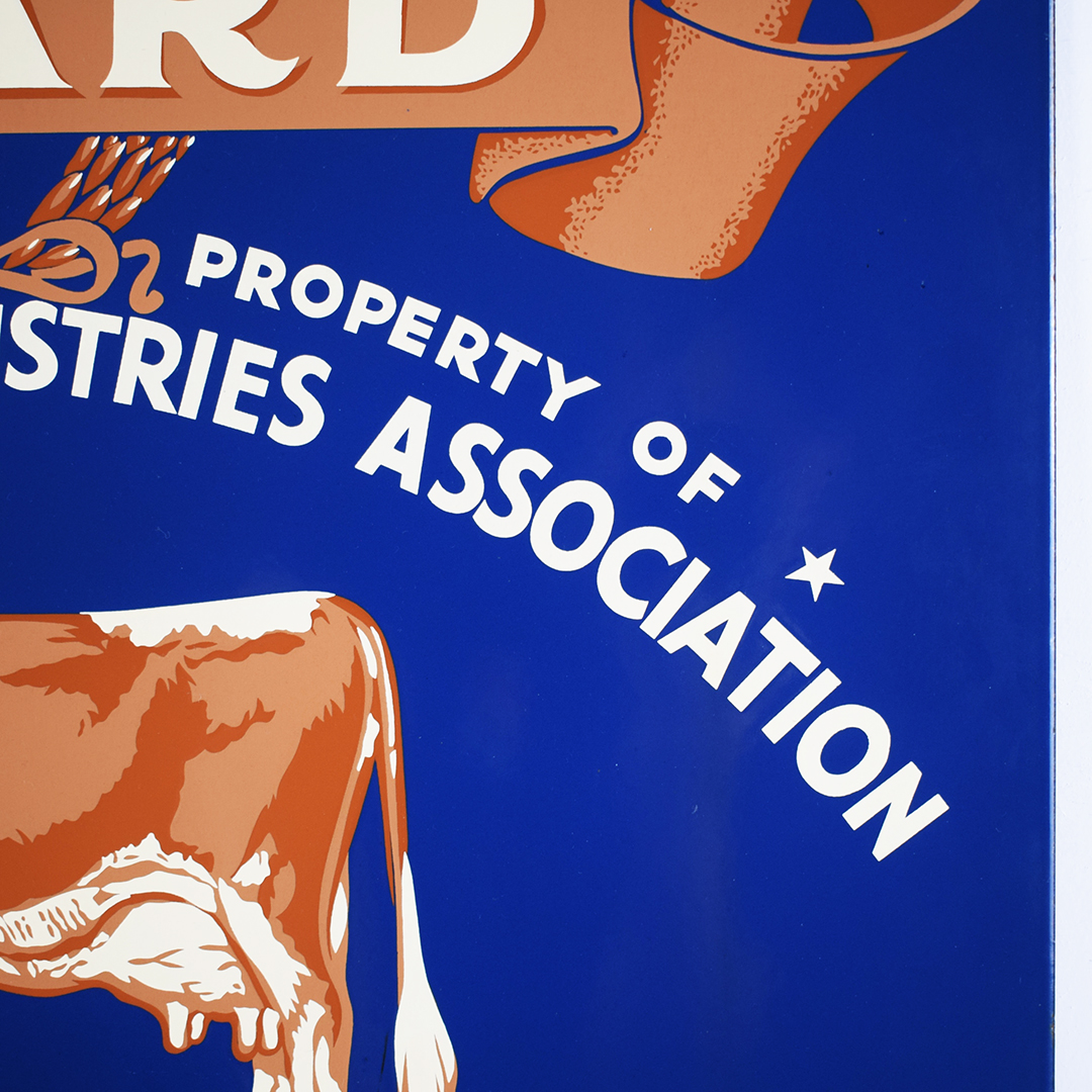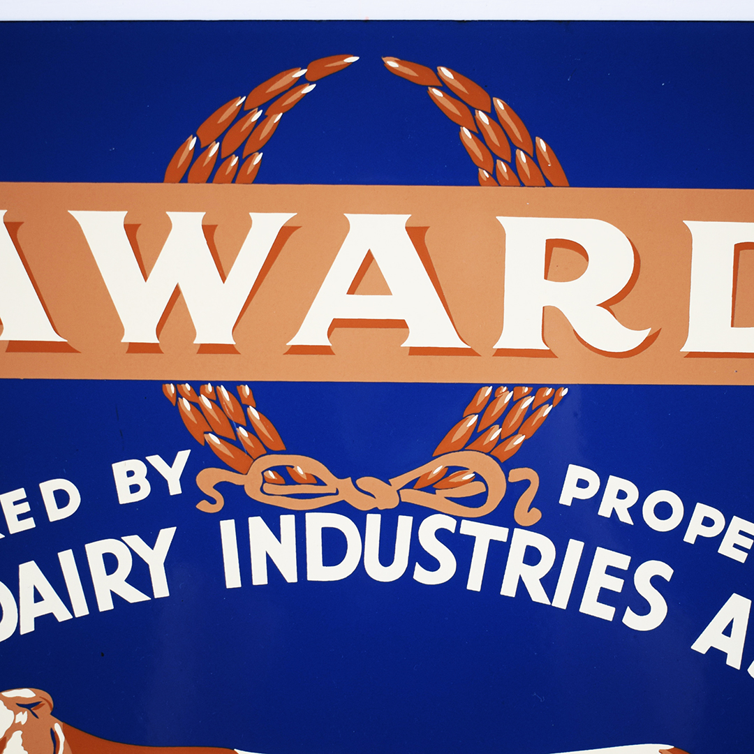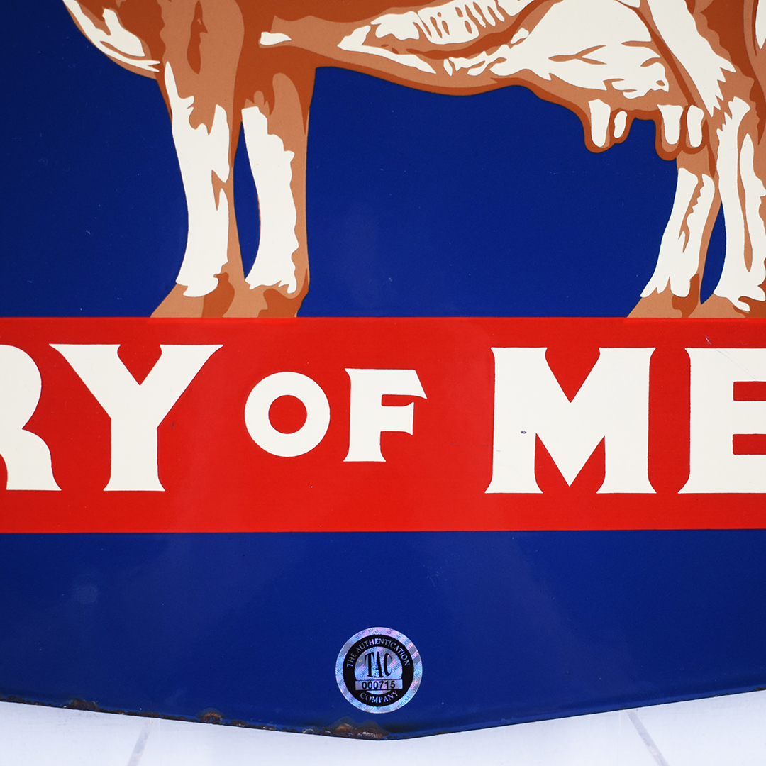 Agriculture signs hold a special place in collections, as they are rarer to find compared to soda signs or gasoline signs. This one, in particular, is an award sign from the California Dairy Industries Association, which was awarded to a Dairy of Merit. It is double-sided, featuring a sleek porcelain finish, and measures 25 inches wide by 22 inches tall at its longest point. The field of this 1940s-era sign features great colors and is free of chips/scratches. Looking around the outer edge, you will find some minor chips with small areas of porcelain loss, particularly around the upper mounting holes. It has been graded a 9.0 by The Authentication Company, carrying TAC# 000715. Signs like this one do not show up for sale often, so do not miss your chance to add this beauty to your collection! 21412-QOPP