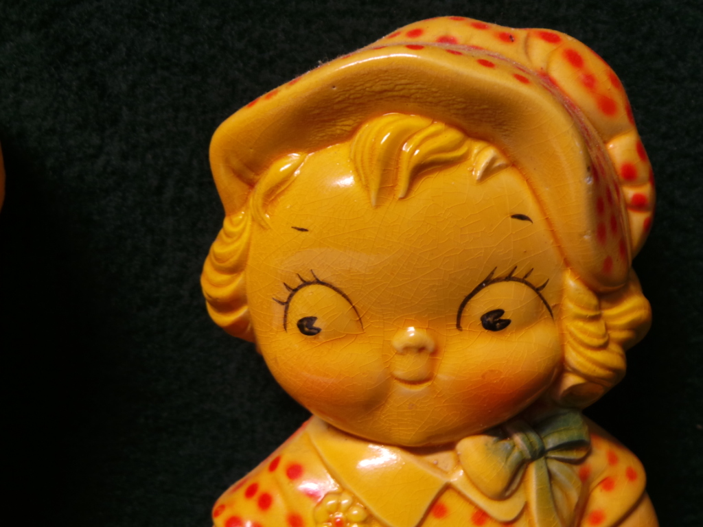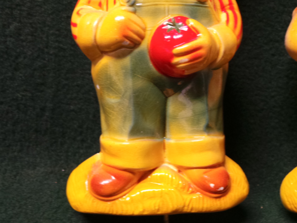 You will find one of the chaulkware pot holders but never as a pair. These have been in my country store and in my kitchen for over 25 years and now time for them to find a new home. They are completely mint and perfectly colored with no touch ups. Little boy is holding a fresh tomato while having eyes for the little girl. The little girl is holding some flowers looking back at the Campbell’s boy. He has a straw hat and she a lovely polka dot bonnet. Two tiny rubs on one of his shoes and a tiny one on his finger. Pot holder hangers are there for your use. 5545