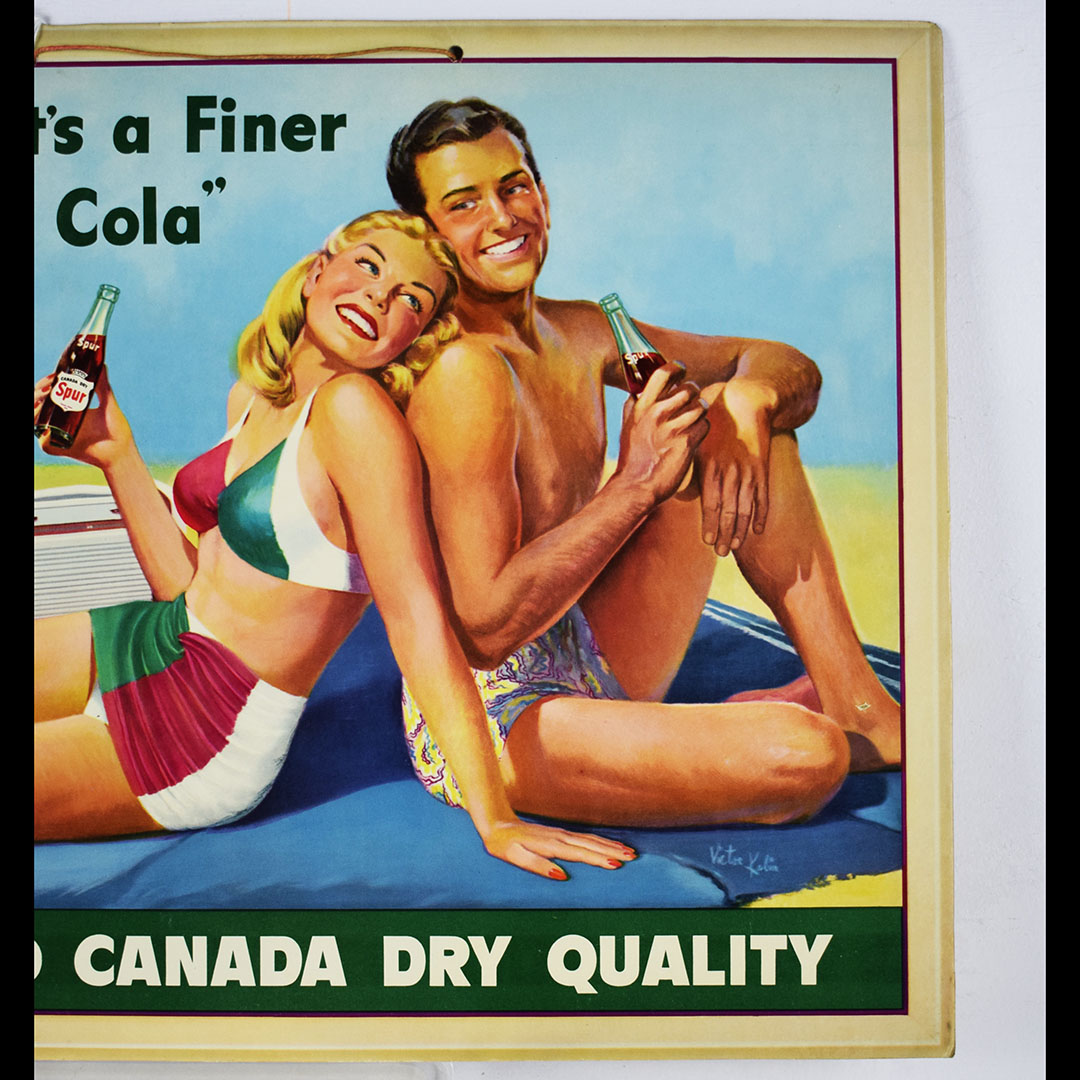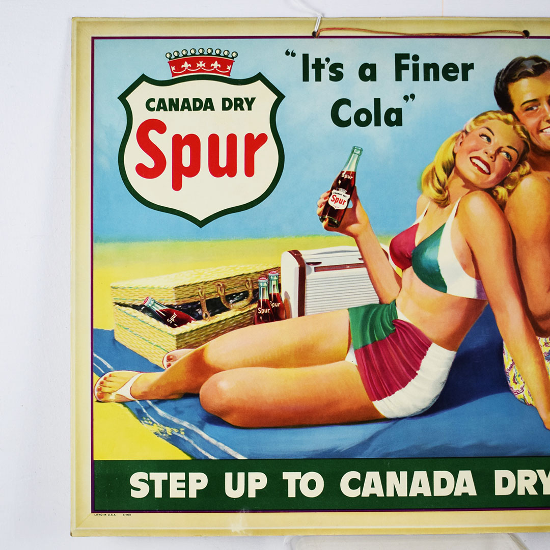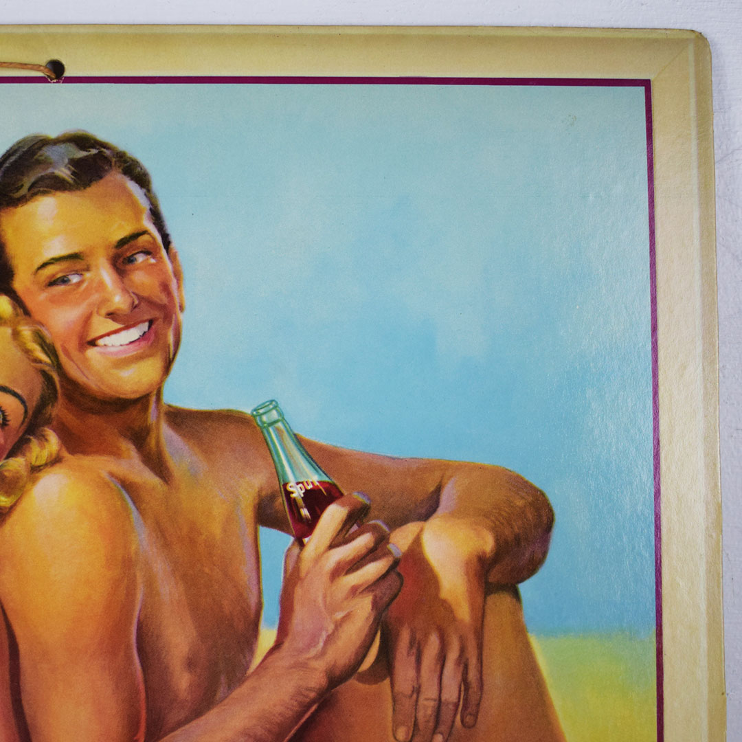 It is always summer with this Spur Cola lithograph in your collection! Dating from the 1950s, this Victor Kalin-designed painting features a young couple sitting on the beach enjoying Canada Dry Spur Cola. The cardboard sign features an easel back and the original hanging string at the top. The litho quality of this piece is excellent, with sharp colors and terrific gloss throughout. A small mark is on the face of the cardboard on the gentleman’s ankle, which measures less than a quarter-inch. Typical chips around the outer edge, with the outer corners showing wear. It is marked “Litho In U.S.A.” and “5-165” in the lower left corner. It is scarce to find this Spur Cola litho in this fantastic shape these days! 21099-QRT