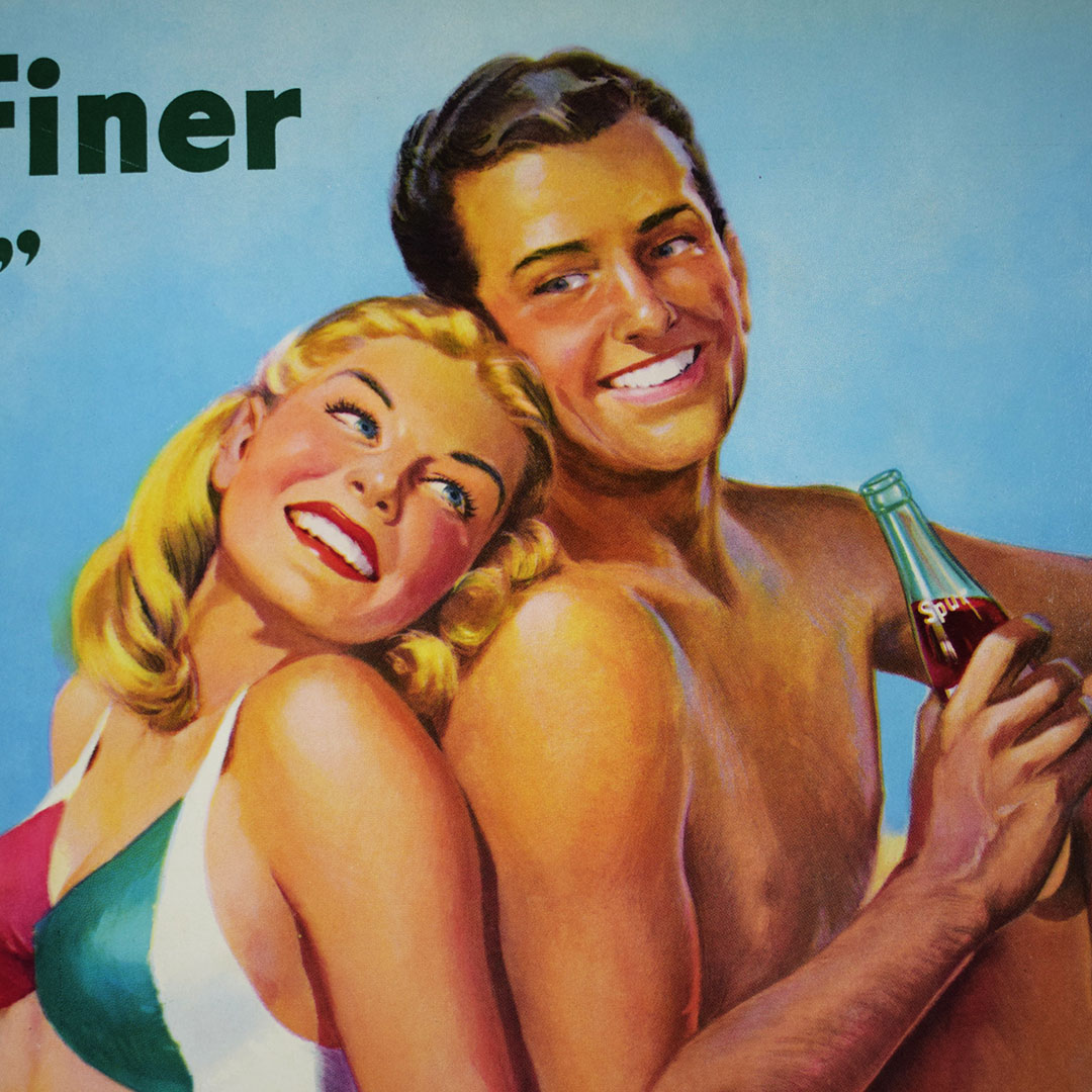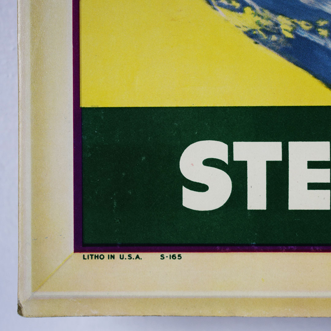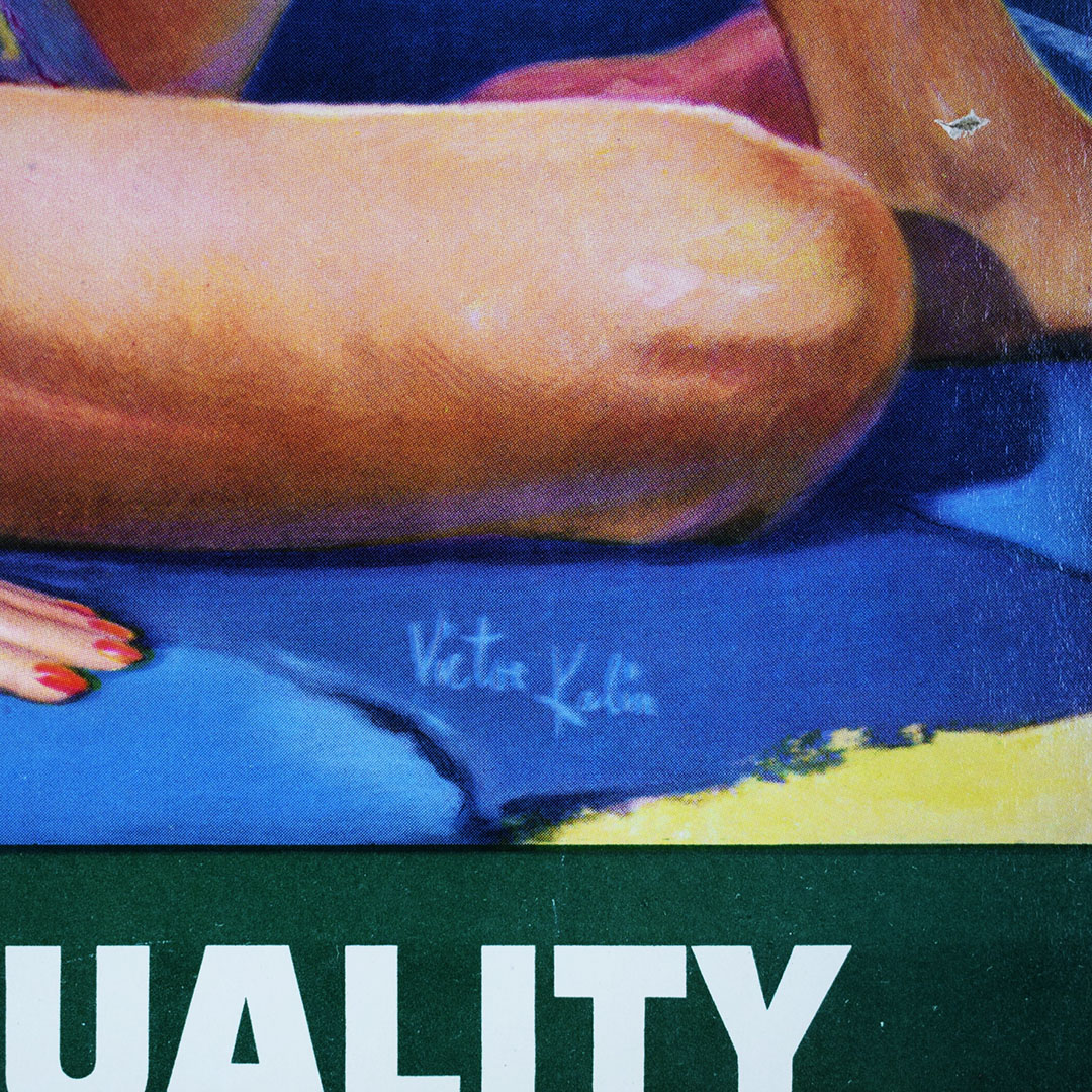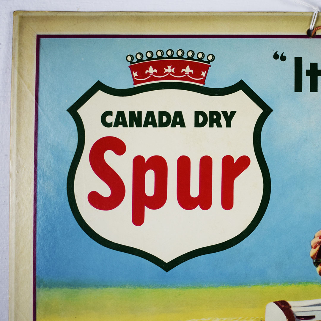 It is always summer with this Spur Cola lithograph in your collection! Dating from the 1950s, this Victor Kalin-designed painting features a young couple sitting on the beach enjoying Canada Dry Spur Cola. The cardboard sign features an easel back and the original hanging string at the top. The litho quality of this piece is excellent, with sharp colors and terrific gloss throughout. A small mark is on the face of the cardboard on the gentleman’s ankle, which measures less than a quarter-inch. Typical chips around the outer edge, with the outer corners showing wear. It is marked “Litho In U.S.A.” and “5-165” in the lower left corner. It is scarce to find this Spur Cola litho in this fantastic shape these days! 21099-QRT