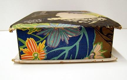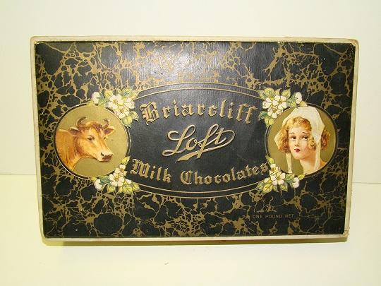 This unusual lid and design has a marbled background with an image of a cow on one side and a milk maid on the other. Each are framed in dogwood style flowers. Lining paper inside is embossed as shown in the photos. Candy box that once held one pound of Briarcliff Loft Milk Chocolate.8350-11WE