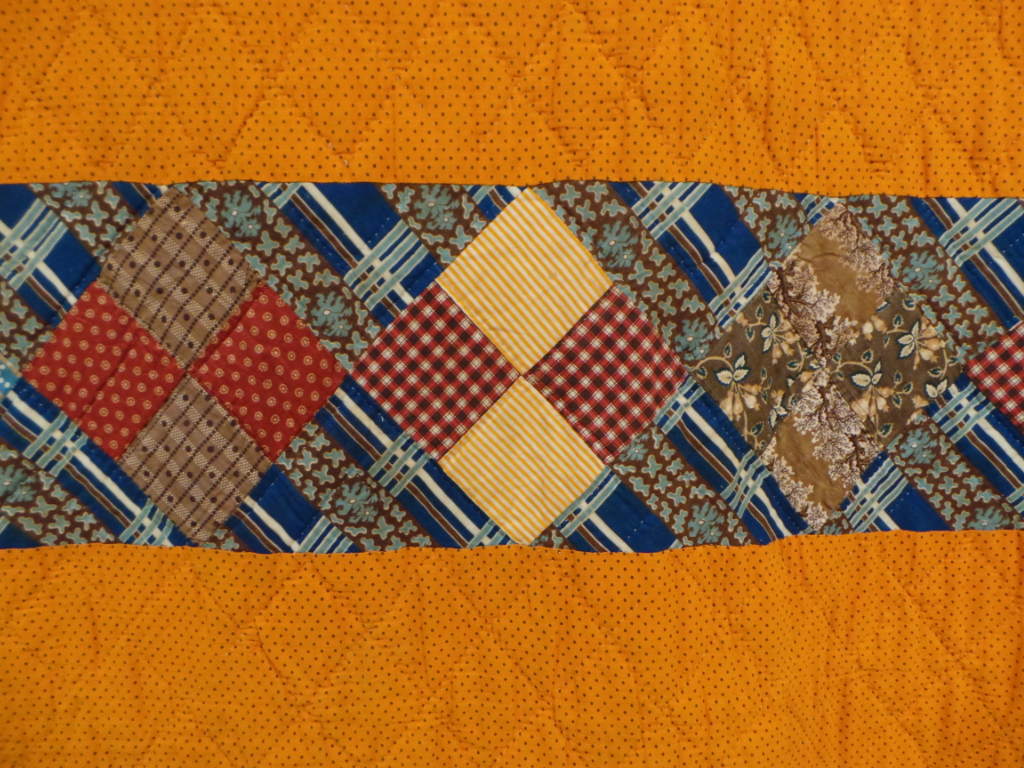 Pattern is Four-block. This is a Four Block on point, set in strips alternating with chrome orange, blue, red , and muted browns. It has horizontal color strips/blocks with predominately prints of blue, brown and green, with varied size prints. This quilt is backed with print fabric (four hand-pieced sections). It is binded from back to front and is stitched in crossed -hatched diamond quilting. This quilt is in good condition. Some of the brown prints have dye damage. The origin of this quilt is Carolina’s, dating between 1845 to 1865. Interesting fact, that the quilters never made a perfect quit, they felt that only God was perfect. Great piece for a wall hanging or on your bed. . 8546-053