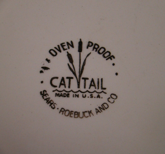 Serving dish with cat tail design distributed by Sears Roebuck and Co. Image of cat tails in center of bowl printed in black and orange. Bowl is cream with orange trim around the rim. Oven Proof and logo printed in gold on bottom. These have such a country feel and look to them with the cream, orange and black. I have several of these including plates over my cabinets and just love the look. Circa 1950’s. 9333-80QP