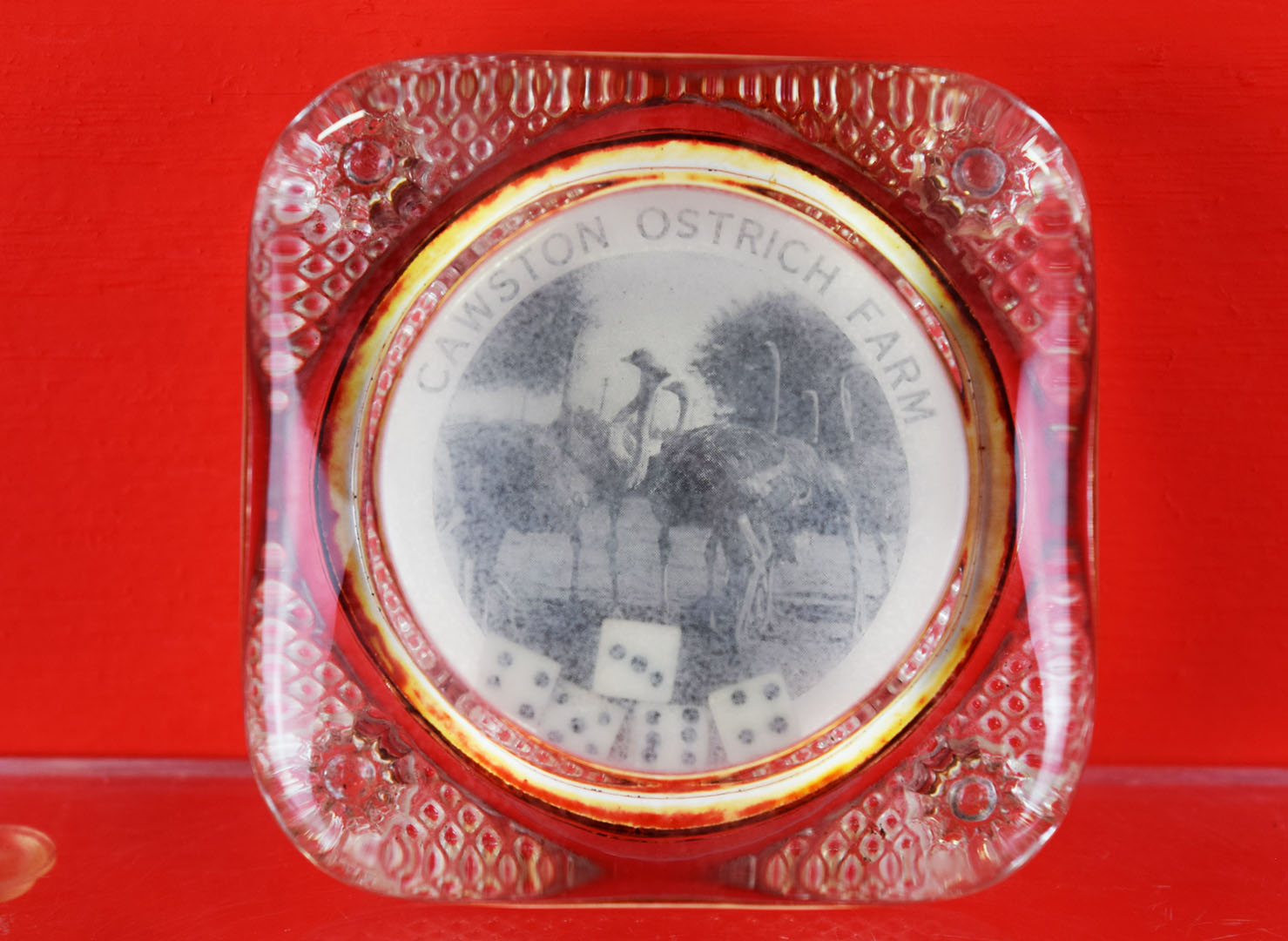 Opened in 1886 by Edwin Cawston, Cawston Ostrich Farm was America’s first Ostrich farm and continued in operation until 1935. Currently it is a South Pasadena Cultural Landmark, but this glass paperweight was a great advertising piece used to keep your paperwork attached to your desk while your fan was trying to keep things cool in your office. “Cawston Ostrich Farm” is in an arc across the top, with “California” in an arc across the bottom. It has a picture of a flock of ostriches in the middle, and has a sight haze on the inside of the glass, which is from the five dice rolling around! The glass top is smooth and crack/chip free, and the bottom is textured glass with a metal cap that has some slight oxidation. We date this from the late 1920’s to early 1930’s. We have other types of these paperweights, please search our inventory! 18981-OW
