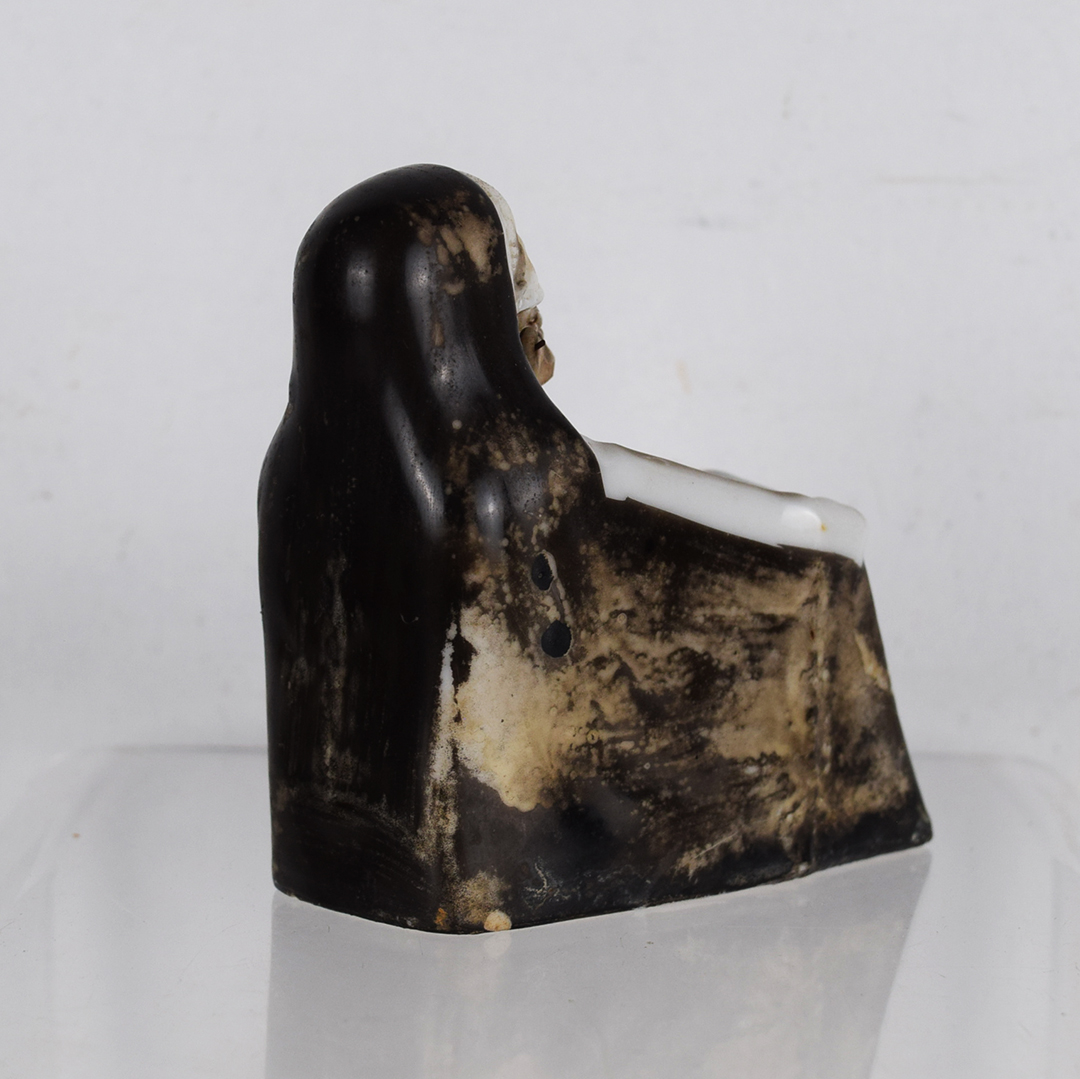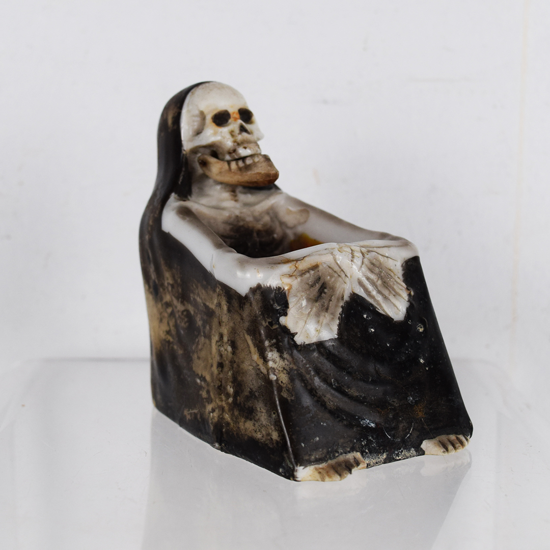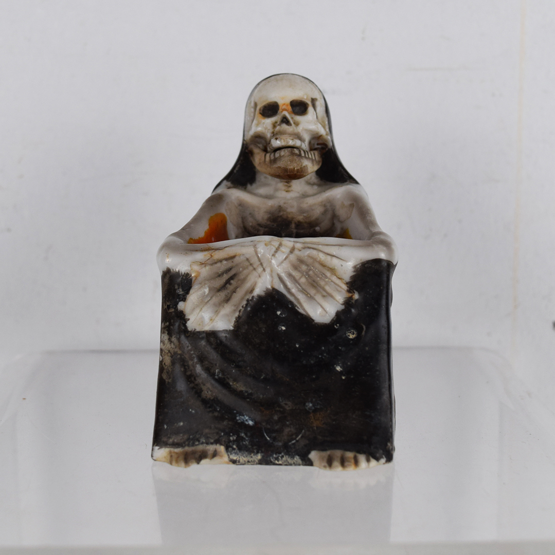 Add a spine-chilling touch to your collection with this 1950s skeleton ashtray, perfect for Halloween or a spooky conversation starter. It measures 3.5 inches tall, 2.5 inches wide, and 3.5 inches deep. The material is ceramic and painted in black and orange colors. The neat feature about this ashtray is that the jaw actually nods with movement and has the original wire that holds the jaw to the skull. It is marked “Made In Japan” on the bottom, with two casting holes. Some paint has faded over the years on the sides, and one foot is chipped slightly. 21443-EQI