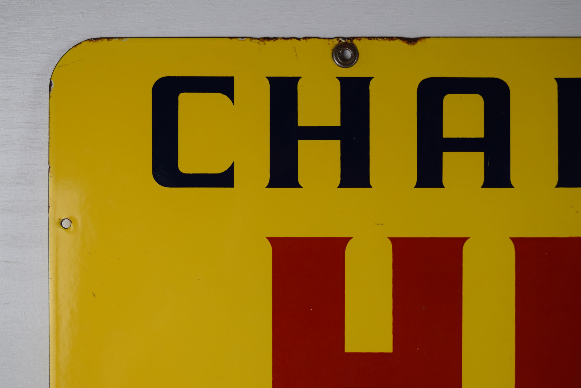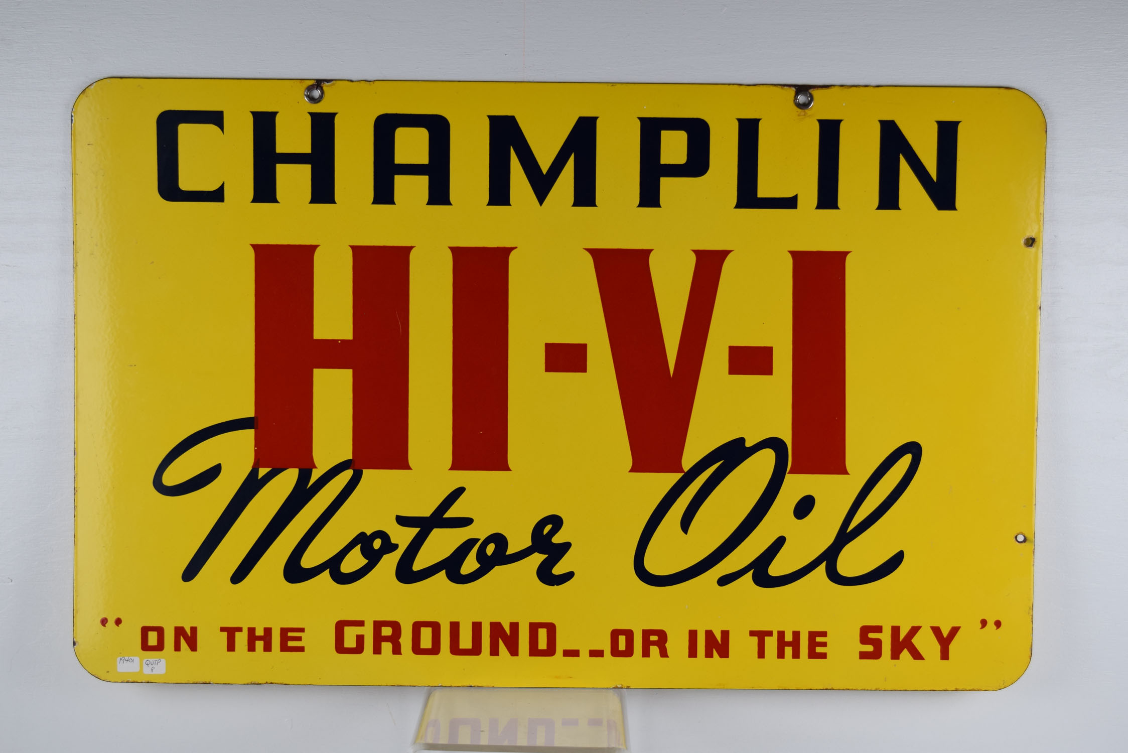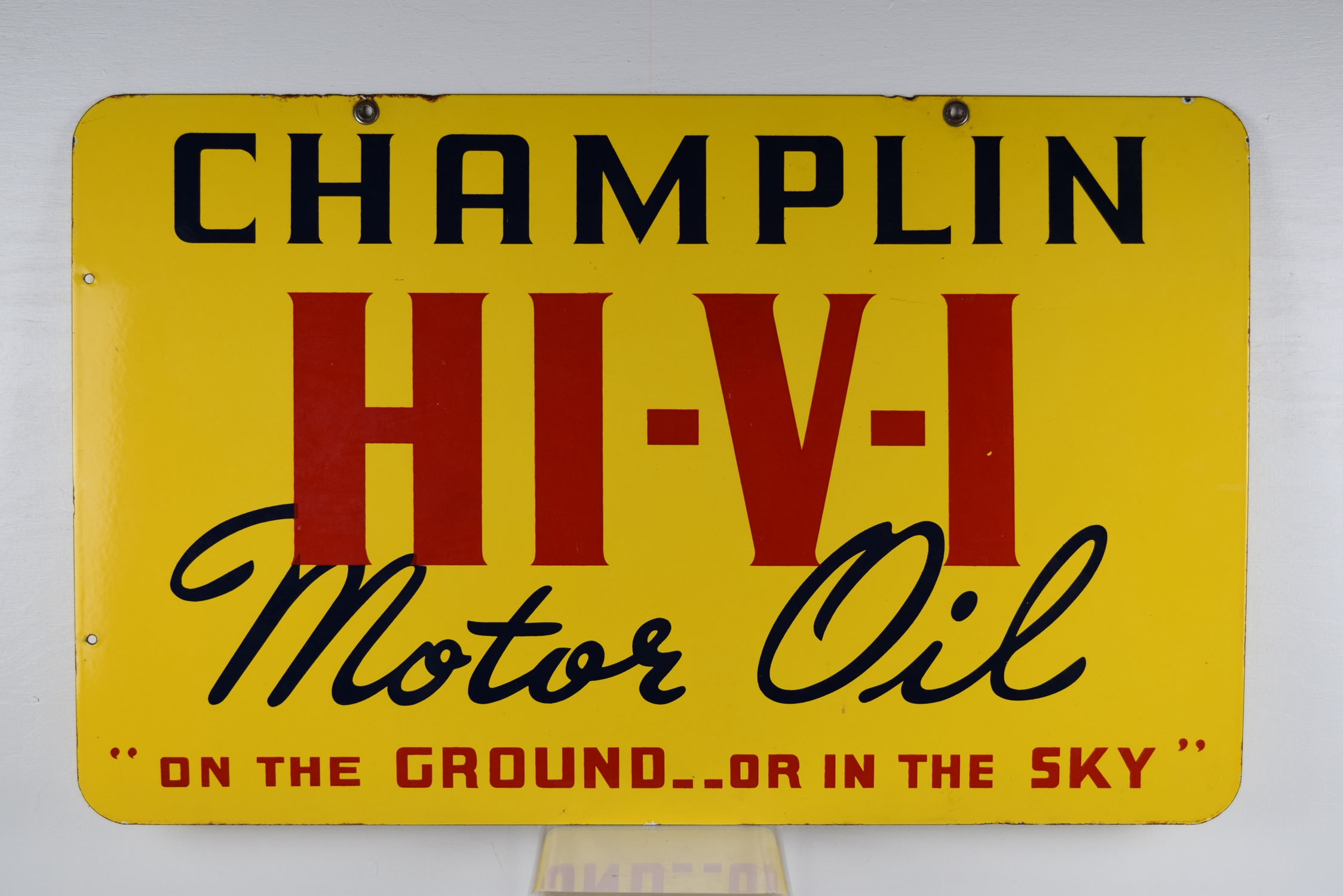 Dating from the 1930’s, this super colorful double sided porcelain sign demanded your attention, and probably got it with these colors! Advertising Champlin HI-V-I Motor Oil, this beautiful sign is hung from the top with a large red bracket, which would have attached to the side of your local service station. Around the outer edge of the rounded corner sign, you can see some small chips in the porcelain, with a few bite marks along the top edge. The center field of the sign just has one small chip in the red “I” on one side. On the other side a small scratch can be seen in the red “H”, along with the same chips on the outer edge. This amazing sign measures thirty-two inches long by twenty inches wide and will make all the other signs in your collection jealous with the beautiful colors on the glossy finish. 19401-QUTP