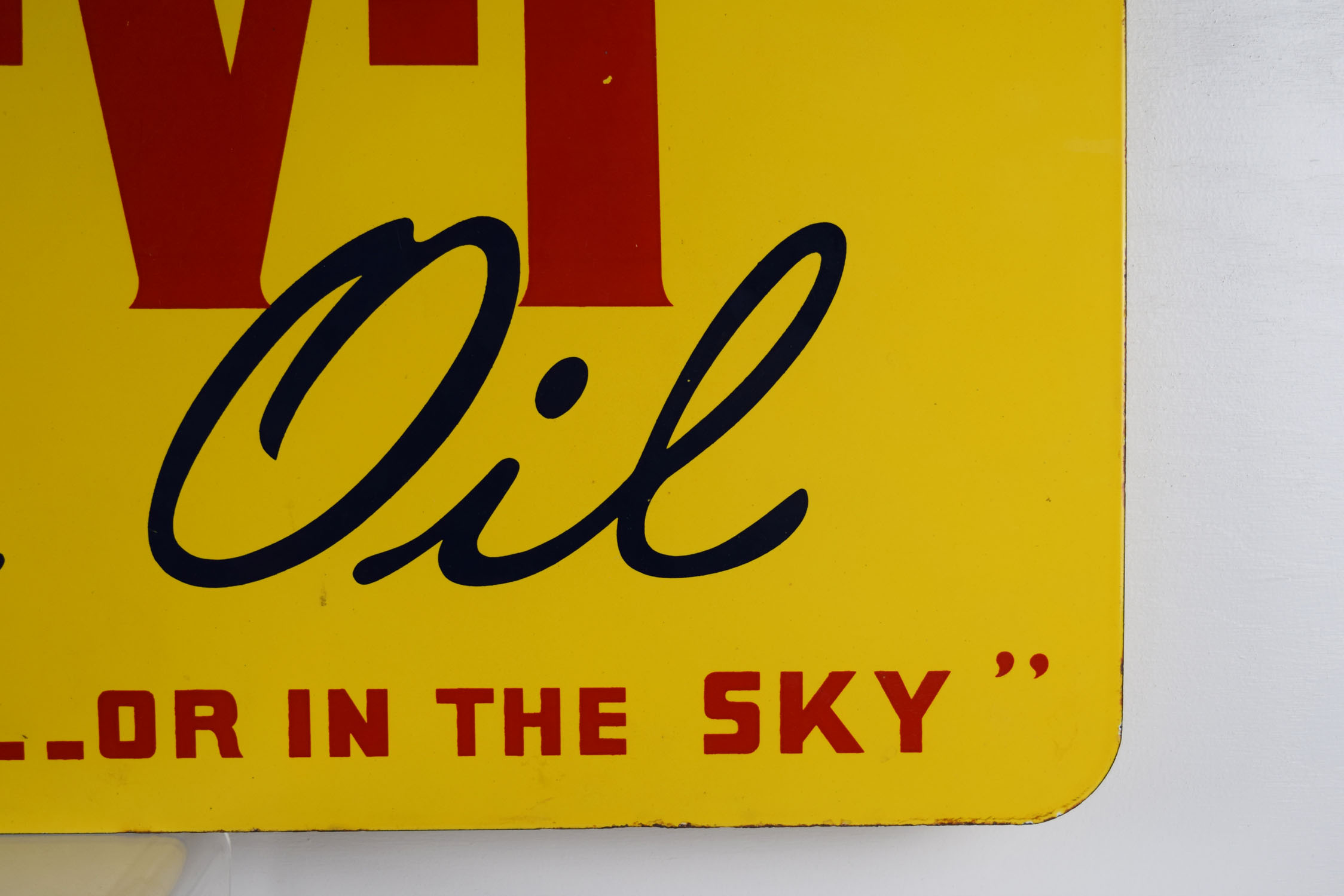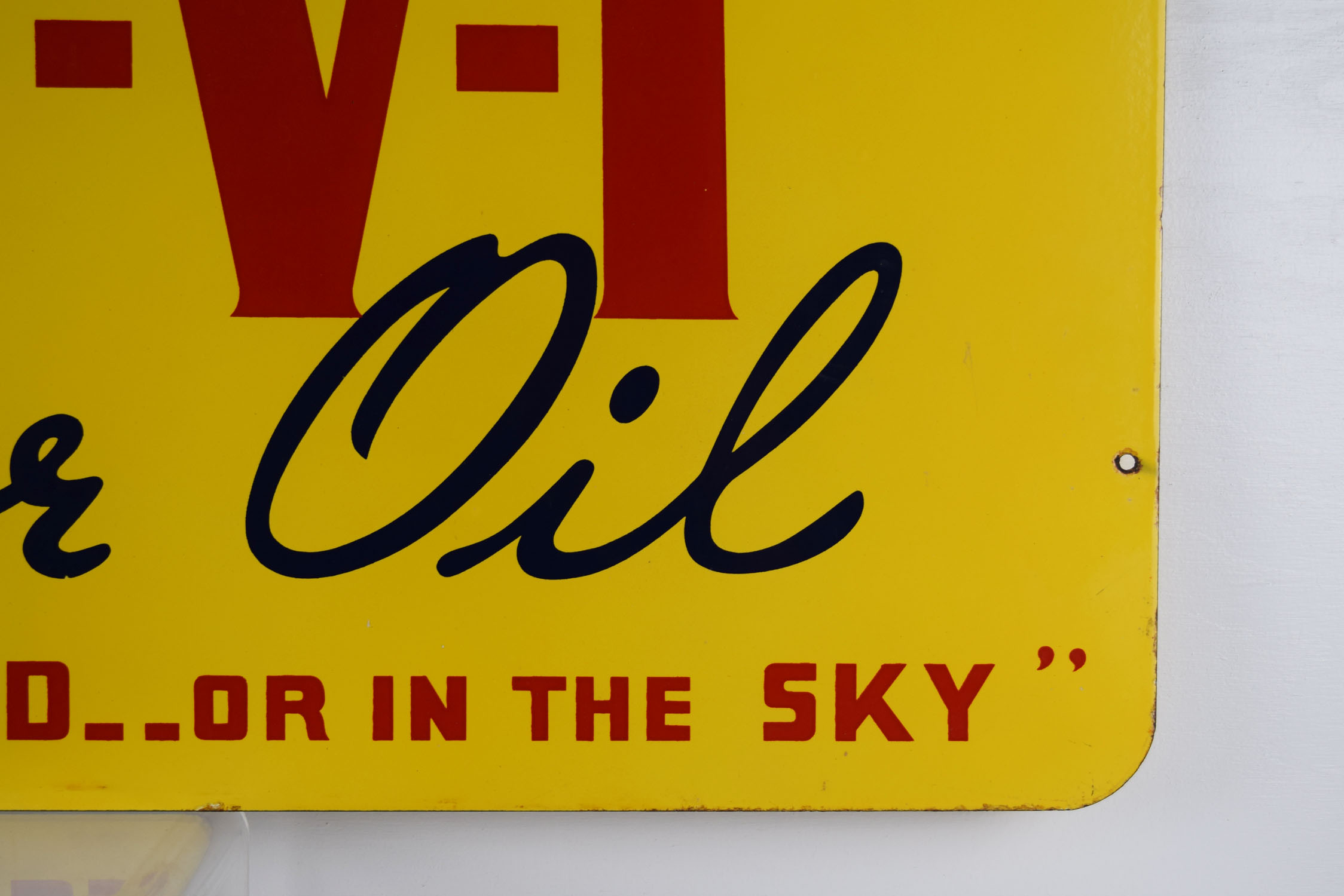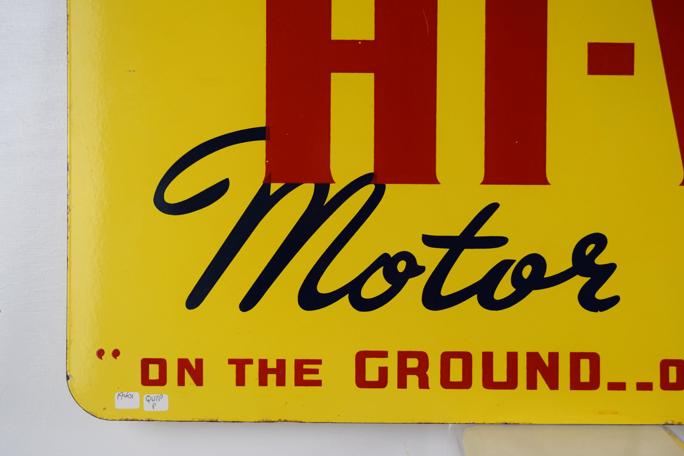 Dating from the 1930’s, this super colorful double sided porcelain sign demanded your attention, and probably got it with these colors! Advertising Champlin HI-V-I Motor Oil, this beautiful sign is hung from the top with a large red bracket, which would have attached to the side of your local service station. Around the outer edge of the rounded corner sign, you can see some small chips in the porcelain, with a few bite marks along the top edge. The center field of the sign just has one small chip in the red “I” on one side. On the other side a small scratch can be seen in the red “H”, along with the same chips on the outer edge. This amazing sign measures thirty-two inches long by twenty inches wide and will make all the other signs in your collection jealous with the beautiful colors on the glossy finish. 19401-QUTP