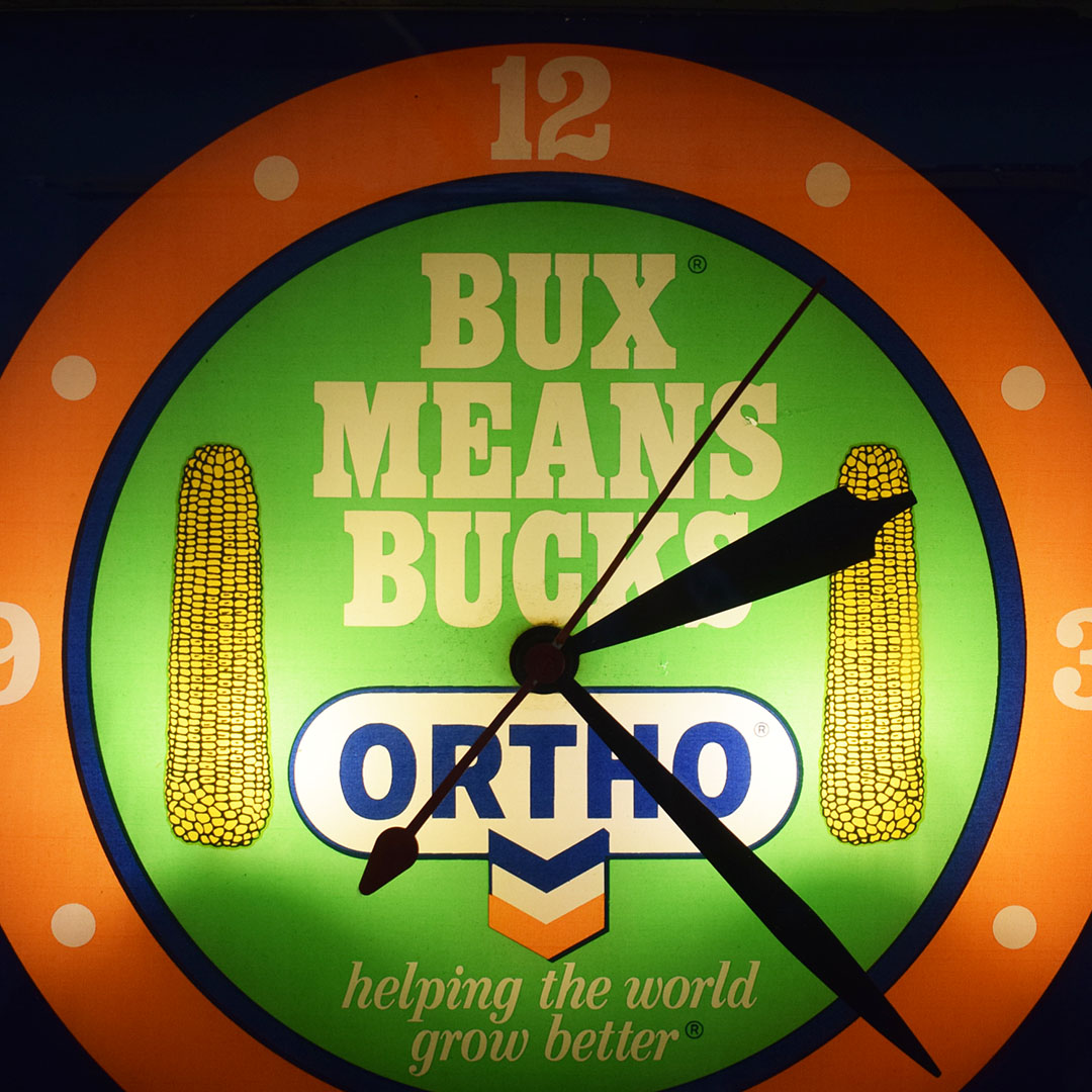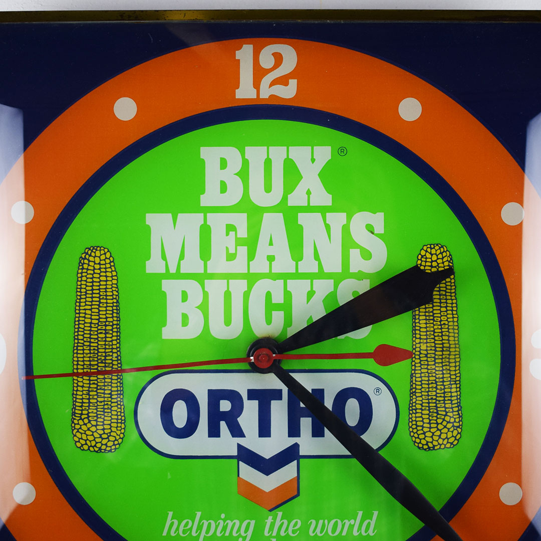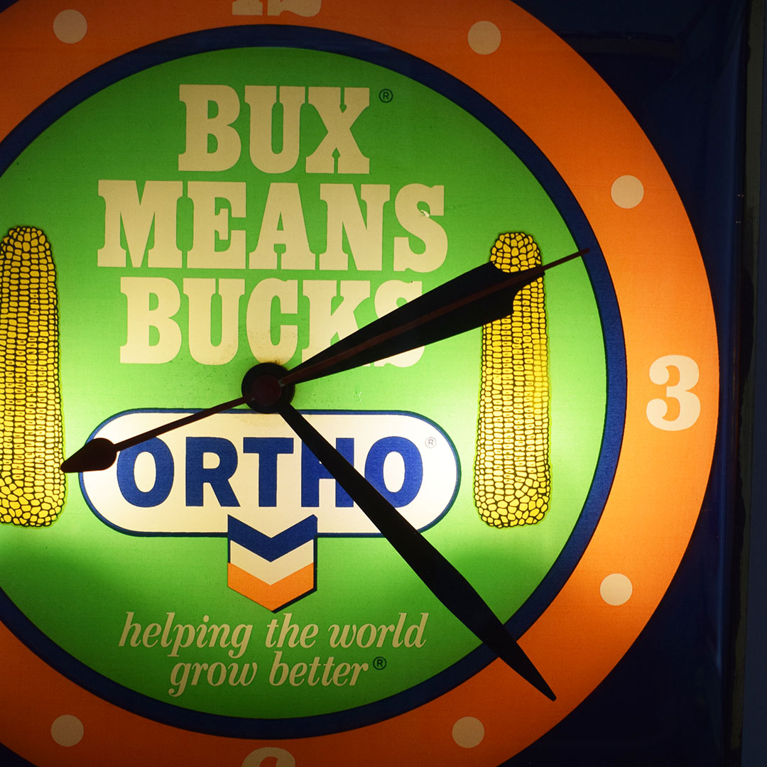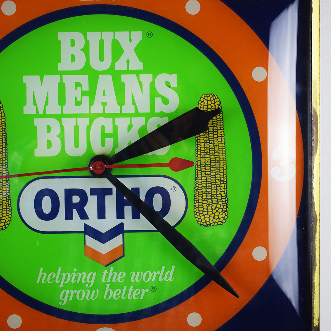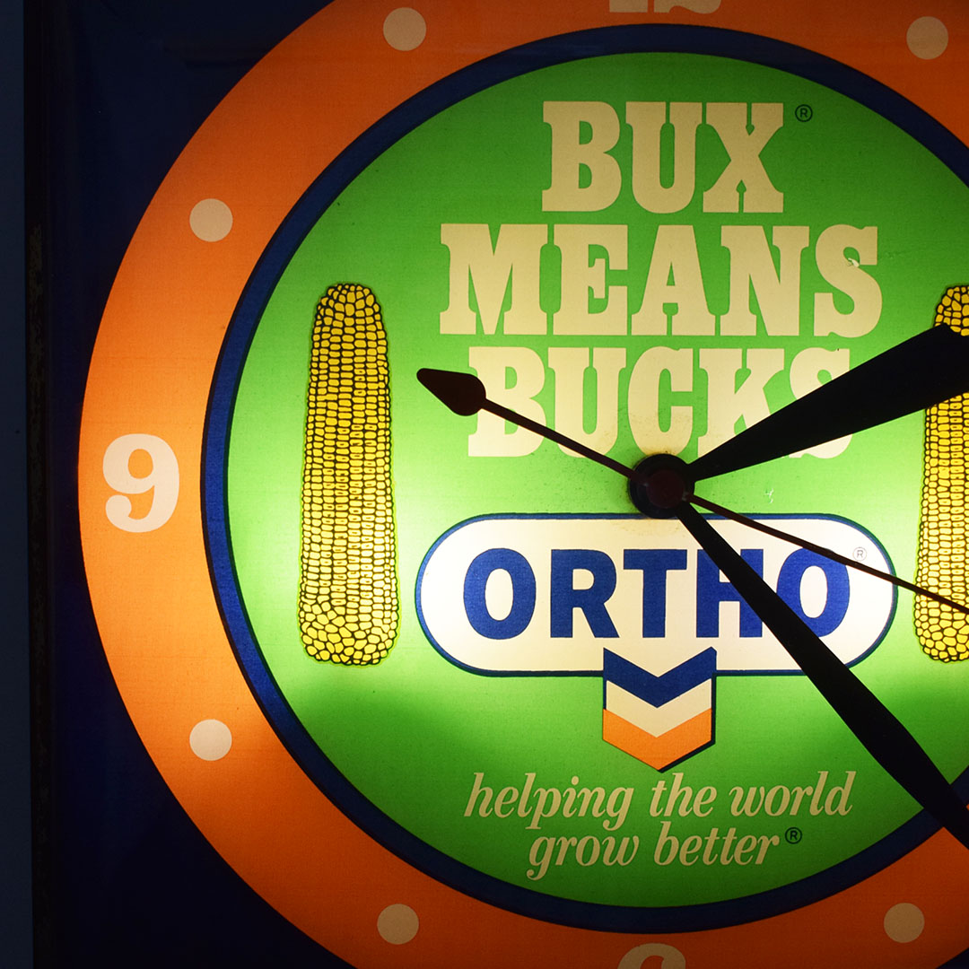 Farming and agriculture advertising are seldom seen in today’s market. This Pam Clock, from the 1960s, features bubble glass on the square housing. The reverse glass face features two ears of corn with “Bux Means Bucks” and an Ortho and Chevron logo at the bottom. Once you plug this clock in, it lights up easily and works as it should. Once it is running, some slight noise is heard from the clock motor. Around the outer edge, the finish on the gold trim has worn off slightly, along with some spots on the top of the metal housing. The original Pam Clock Company sticker is still attached on the back, albeit curled and torn from age. 21298-UUP