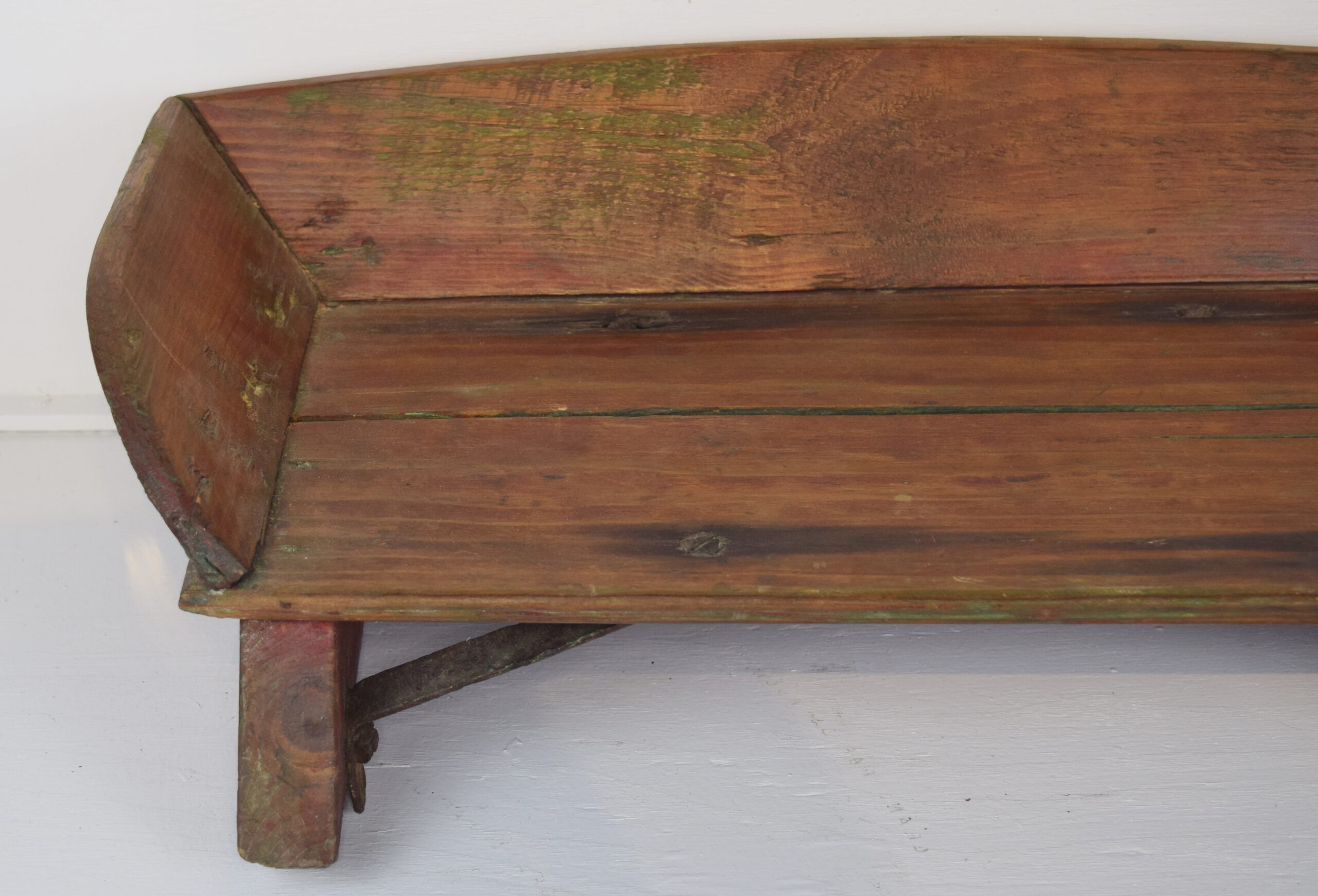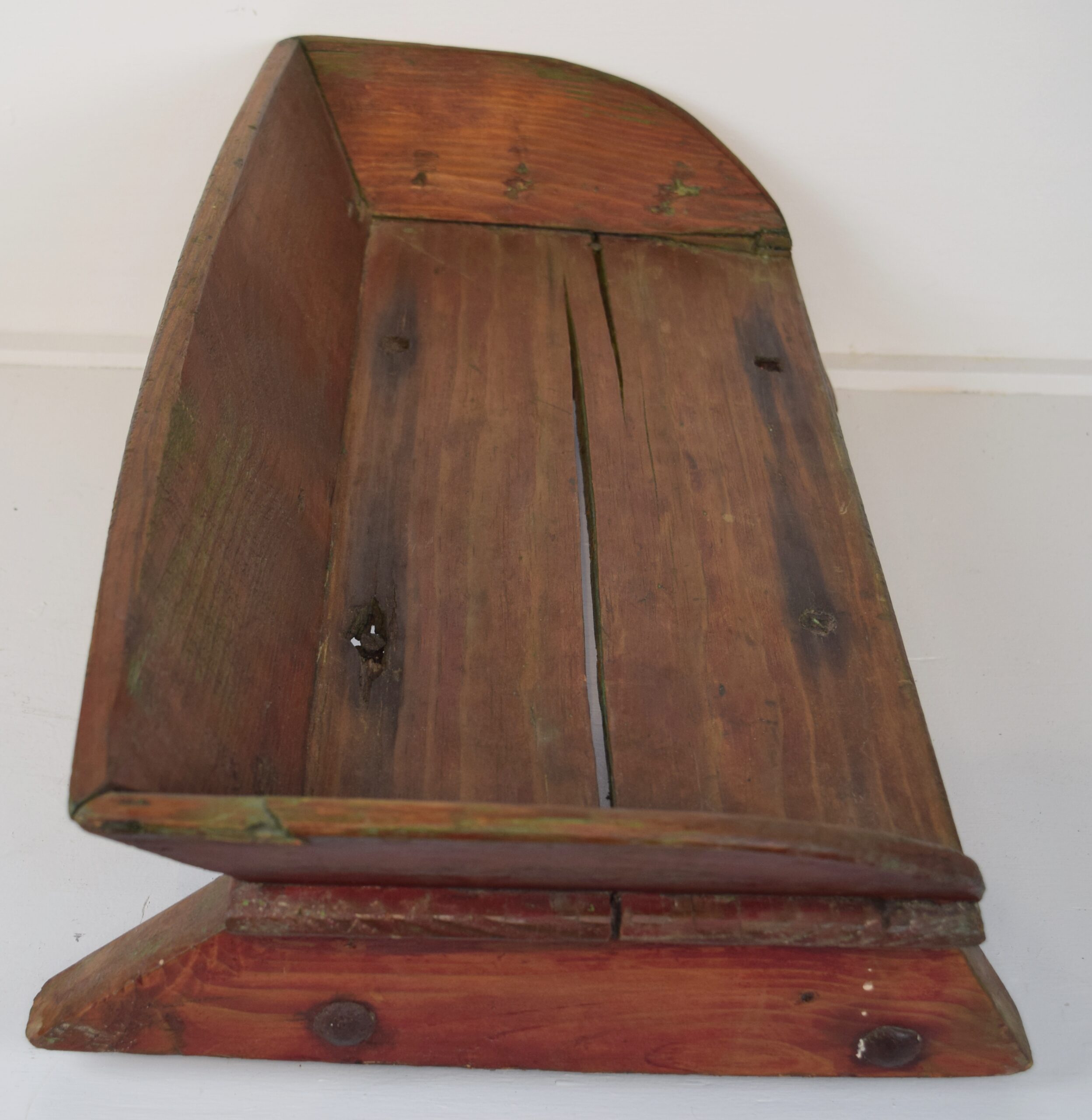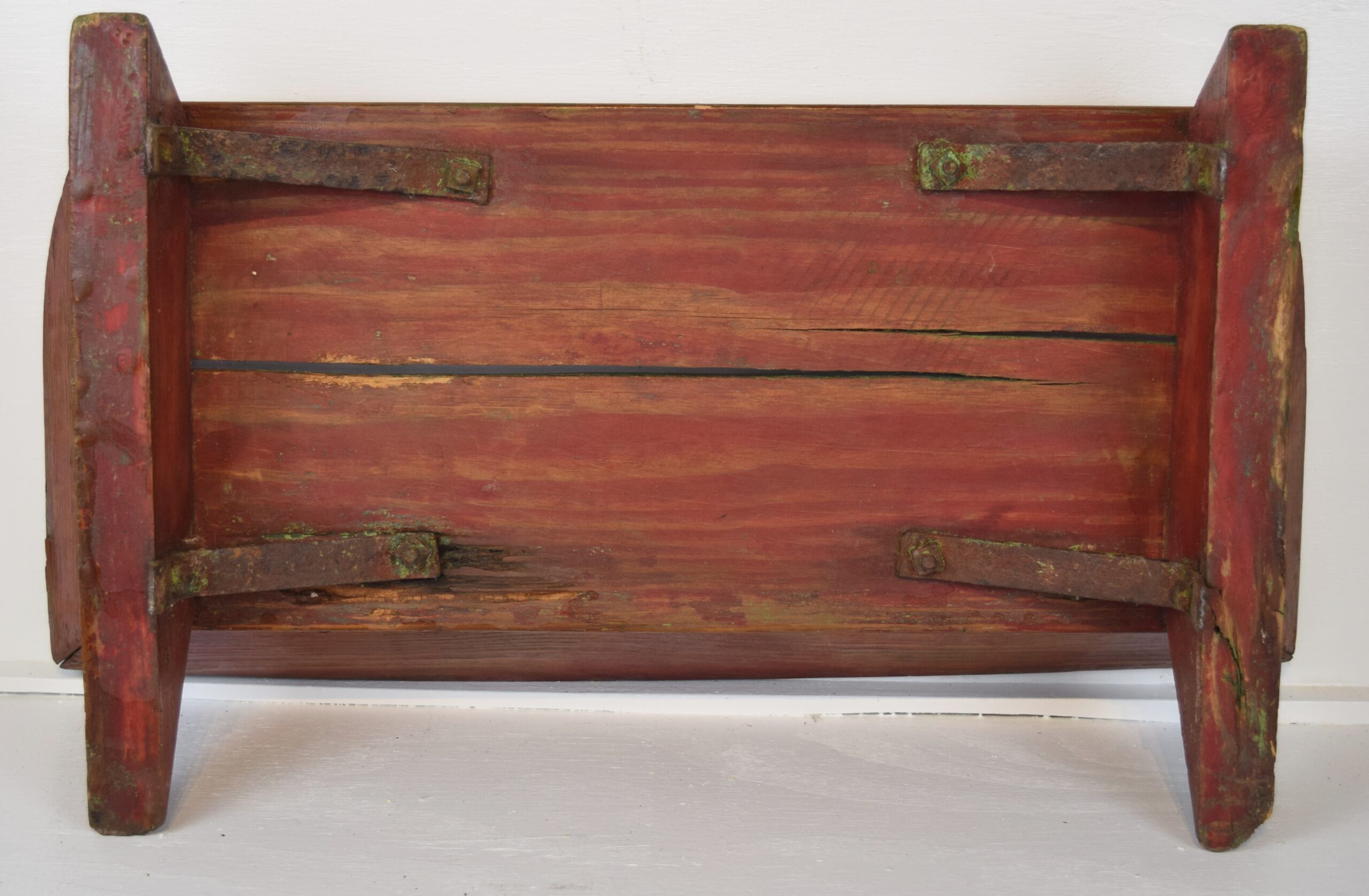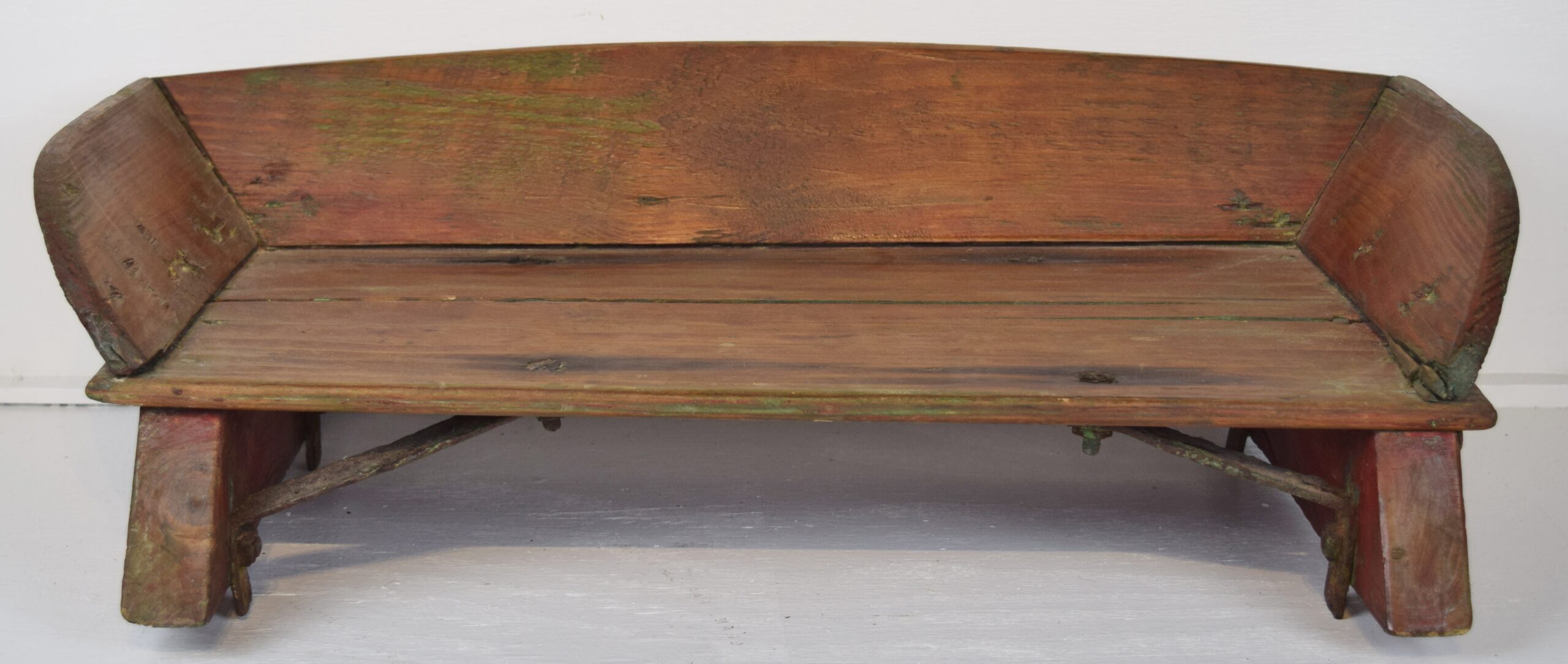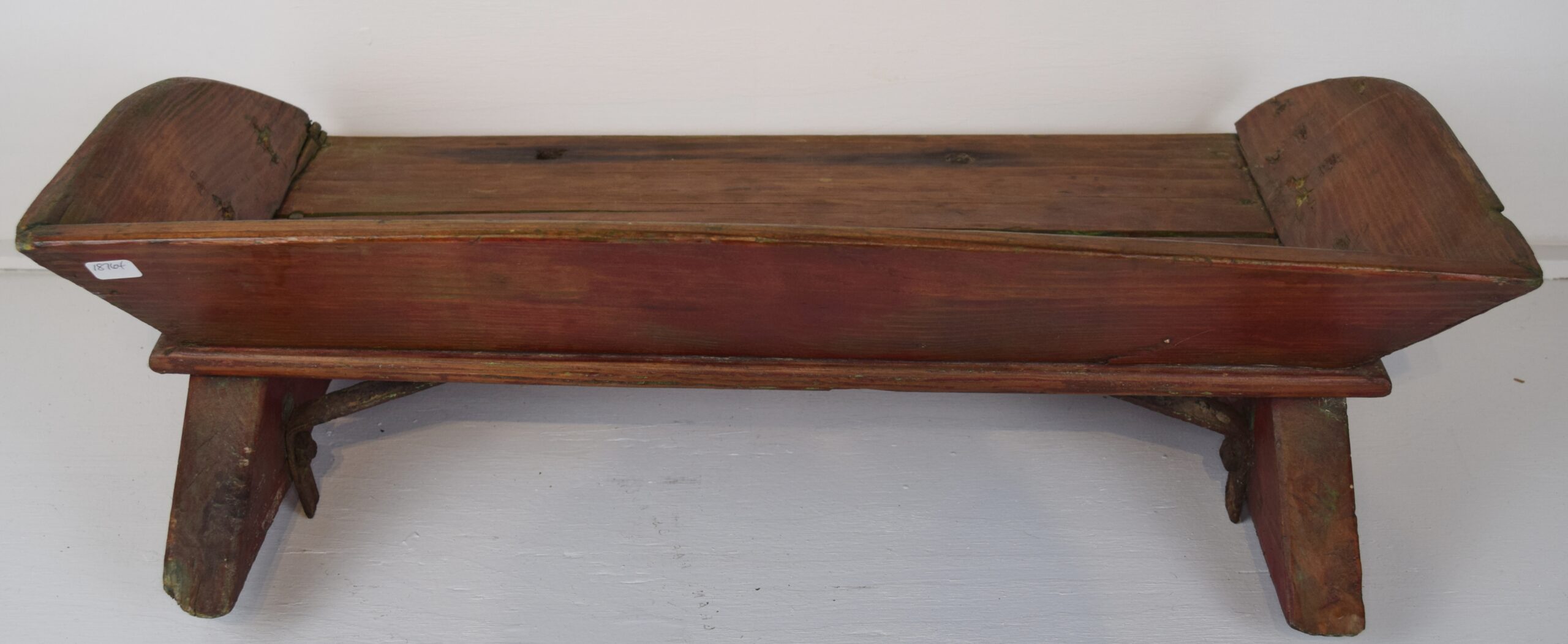 Are you looking for a neat addition to your den? This antique wooden bench is just the right size for a child and will look great in your home. We are unsure of the manufacturer of this neat horse buggy seat, but it seems to be well made. The seat wood has split in a couple of places, and the left rear mount has come loose from the seat board. The metal brackets under the seat are aged and look very authentic and period correct. The right wooden foot has some cracking in the wood also, but does not affect the seat. It has been refinished in the seating area, with the back and sides painted red. It measures 23 inches long, 13 inches deep, and just under 7 inches tall. The metal brackets stick out from the bottom of the seat about 3/4 of an inch. Have dolls or need a cute place for your dog to sit, this is it. 18764-UT