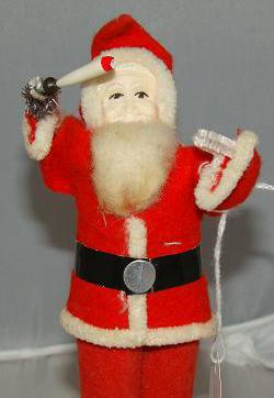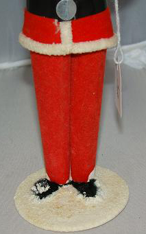 Extremely tall, thin Santa has a pale face with a cotton beard. Black belt with silver buckle. No markings. This unique circa 1930’s Santa would look great in any Christmas collection. 6010-01ET
