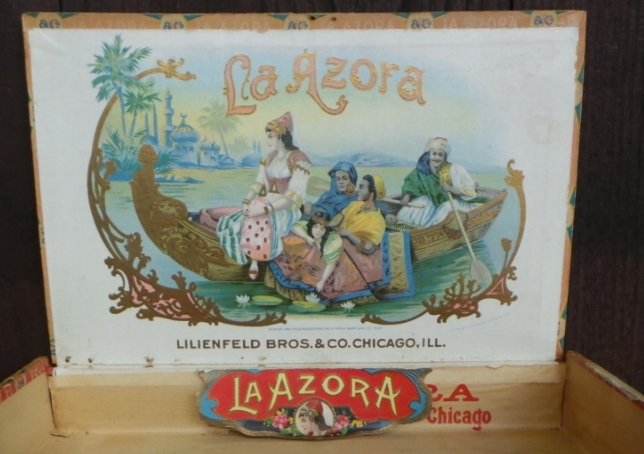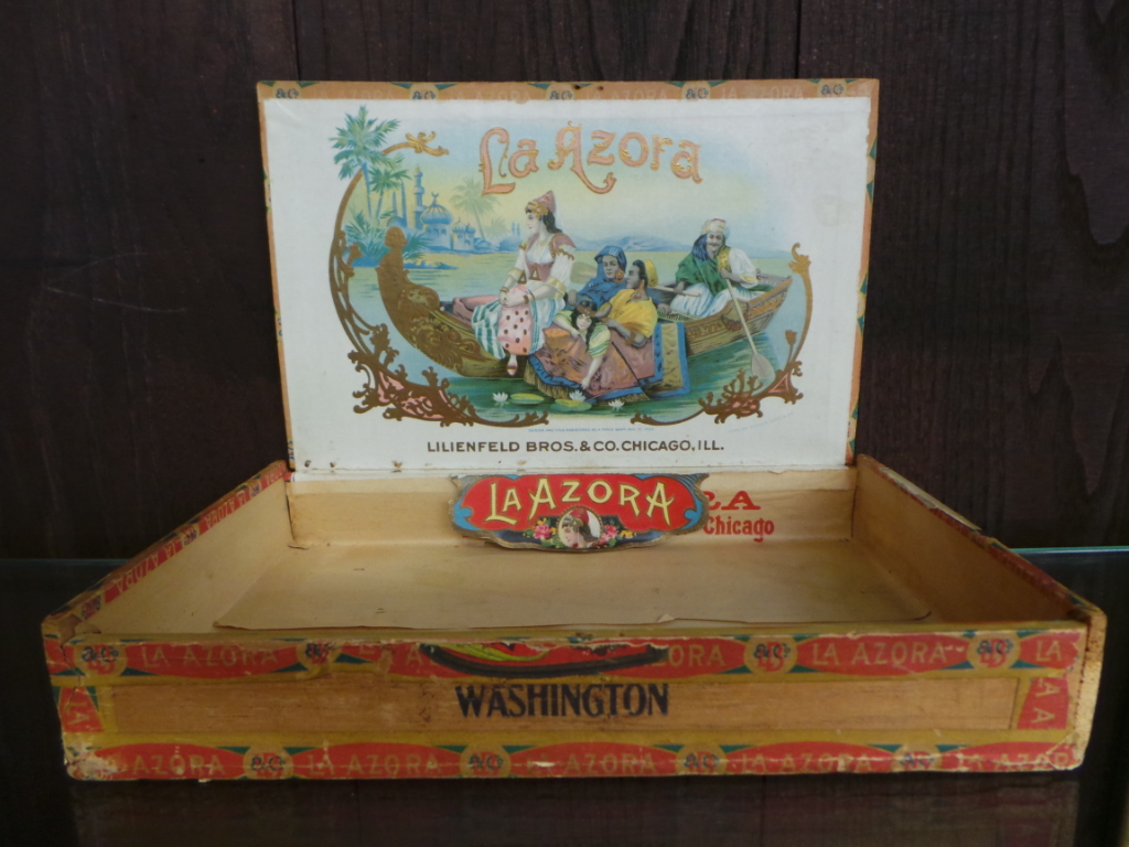 My grandfather kept screws, nuts, and bolts in his cigar boxes, who knew they would be so collectible? This rare cedar cigar box dates from the early 1900’s and once held La Azora Cigars, which were boxed and shipped by Lilenfeld Bros. & Company in Chicago, Illinois. The top of the lid is inscribed “La Azora Washington Q.M.C. $1.50 Box”, and the underside is decorated with a great lithograph of a group of explorers rowing the Nile river. Palm trees and minarets can be seen in the colorful background. The box is in good condition with minor wear and staining on the outside, with minor discoloration inside. 12288-QWT