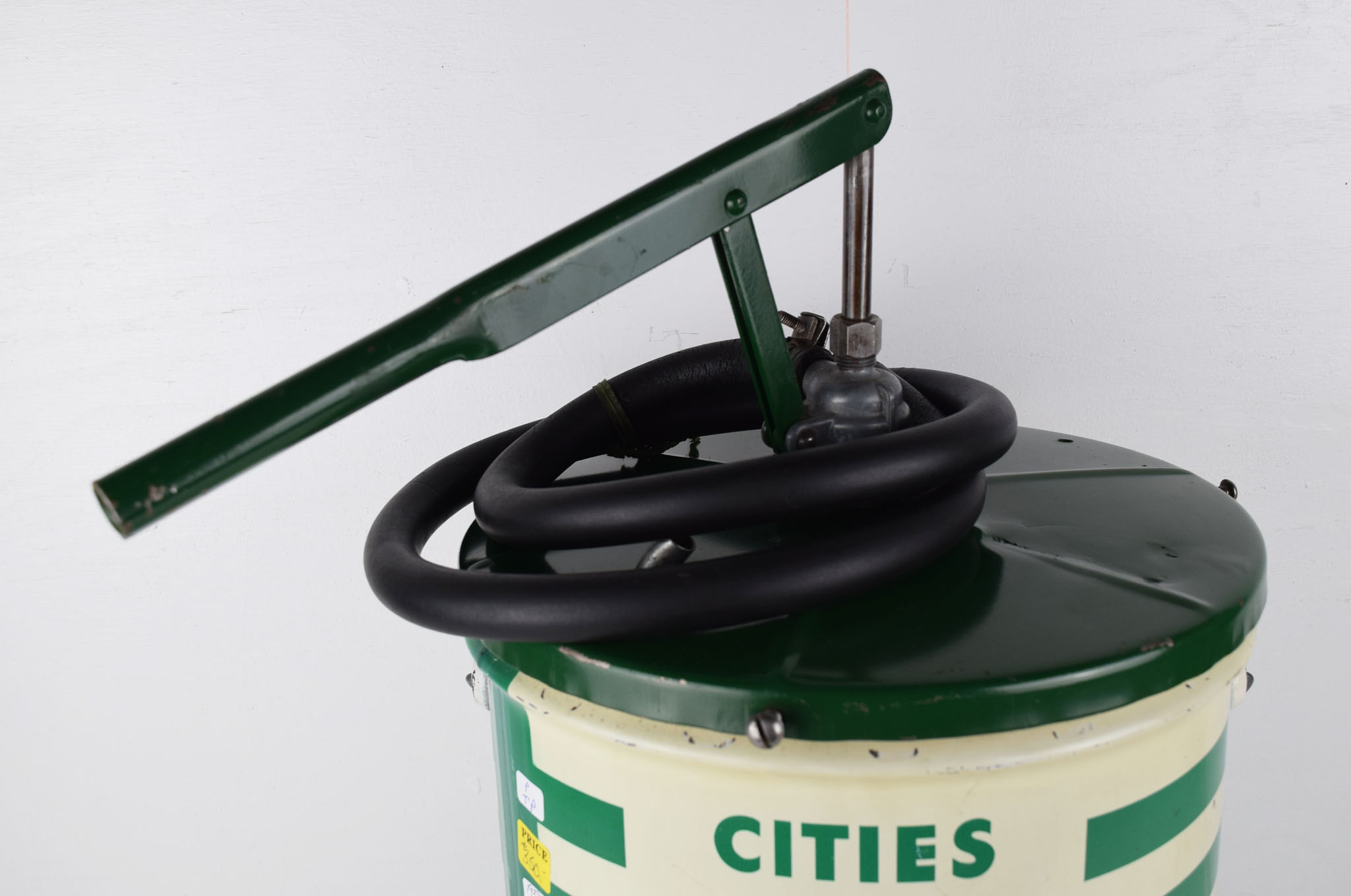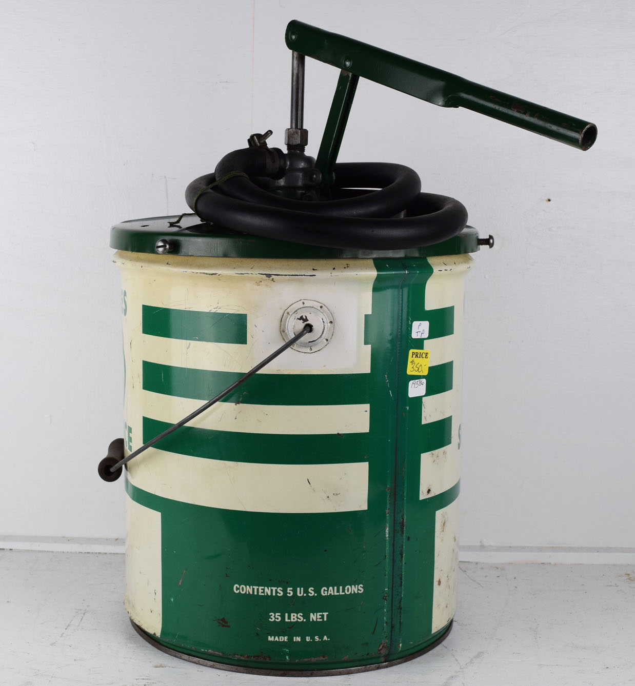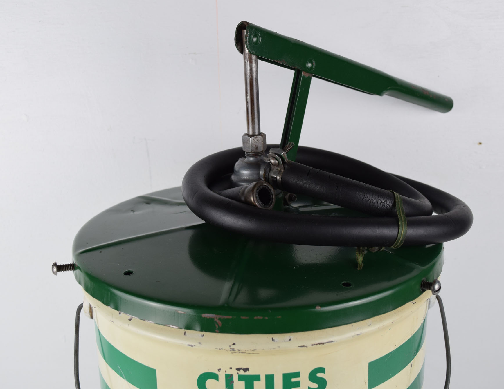 If you remember the way service stations were back in the day, you knew they took care of everything! From pumping your gas, to checking the air in your tires, to washing the windshield, to checking the oil, and it was all free! This Cities Service grease can is from that era and is in amazing shape for the age. It comes complete with the original top with the hand pump. These pumps were transferred from empty to full cans at the service station, so it is rare to see the original green top and pump with this can. Some minor scratches with paint loss can be seen on the round sides of the can, along with a ding here and there. The can is not stamped with a grease type, only “Contents 5 U. S. Gallons” and “35 Lbs Net” below. Great piece to add to your man cave or your service station collection. 19386-TP