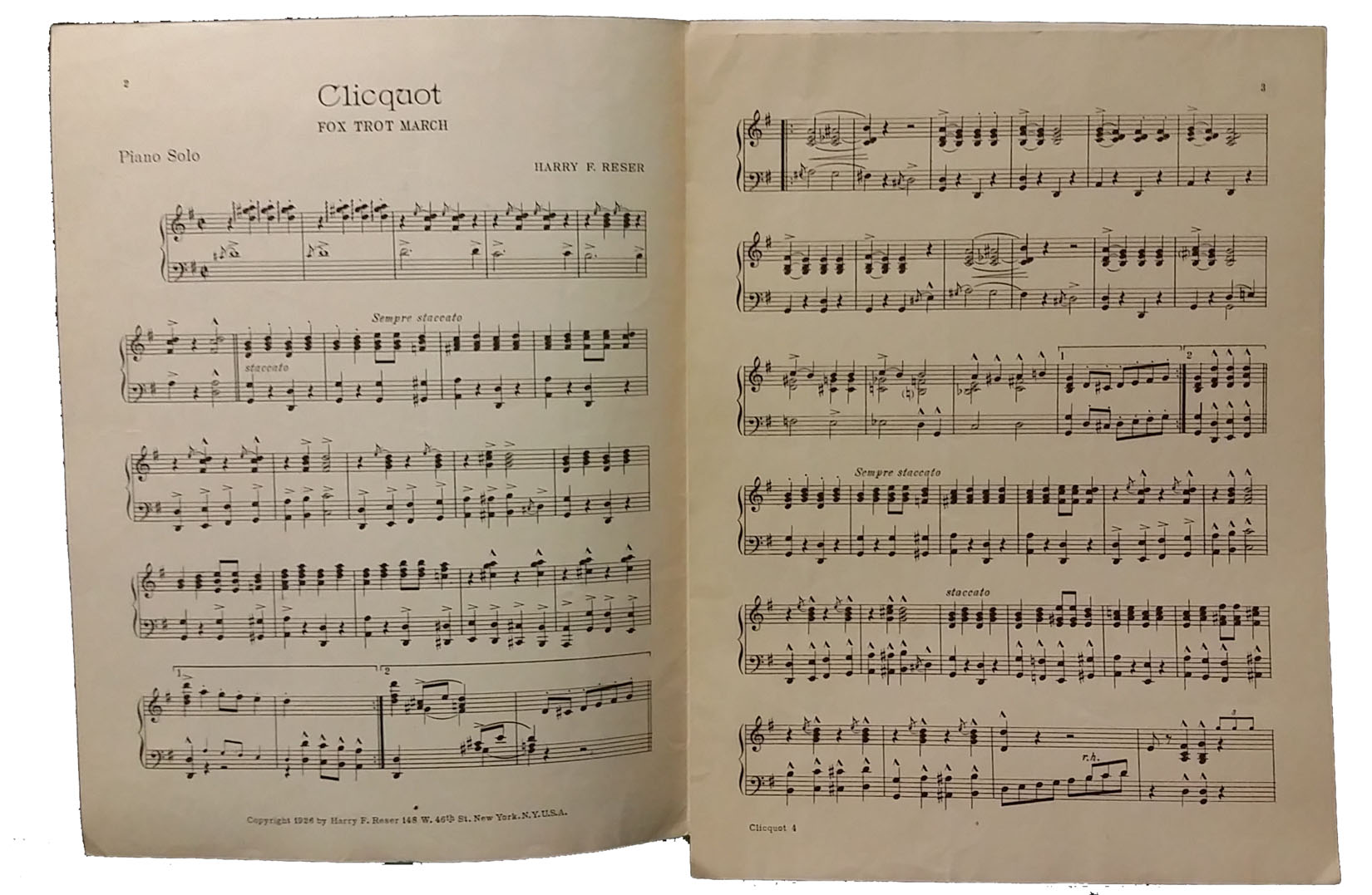 This unusual piece of sheet music was printed in 1926 as an advertisement for Clicquot Club soft drinks. Inscribed “Clicquot Fox Trot March featured by The Clicquot Club Eskimos under direction of Harry F. Reser Clicquot Club Company Millis, Massachusetts,” the cover has an image of the nine member banjo band, dressed in fur snow suits and black boots, sitting in the snow with their instruments. The “Clicquot Kid” mascot is standing in the foreground holding a bottle of the soft drink. On the back of the six page piece of music is an advertisement for William L. Lange, manufacturer of the Paramount Banjos played by the group. The sheet measures 12 1/4 inches tall by 9 1/8 inches wide and is in excellent condition with minor edge wear. It has been framed for you to put on the wall and enjoy! 3490-71WY