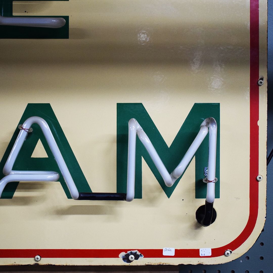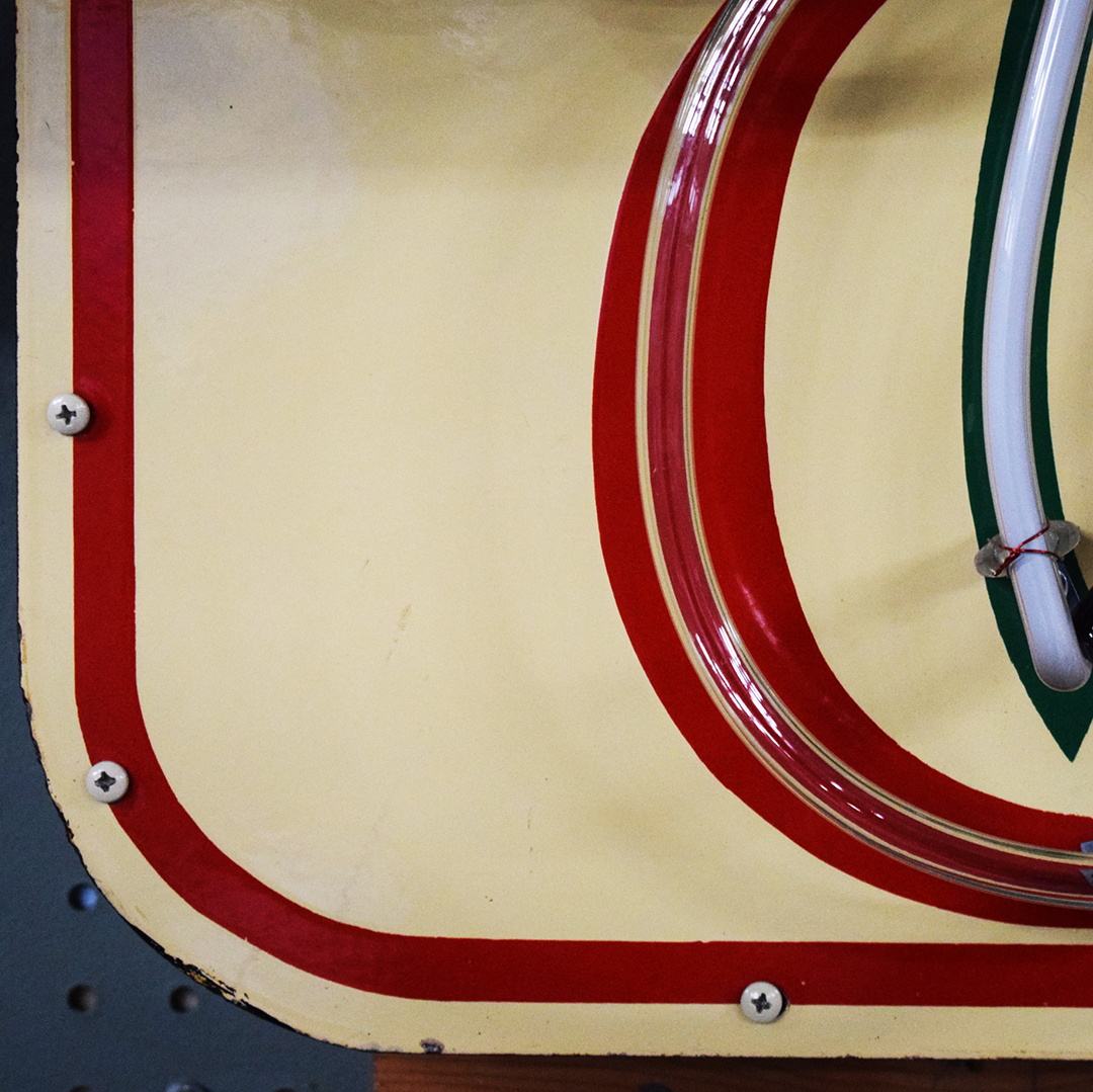 Everyone loves ice cream signs! Check out this excellent Clover Ice Cream porcelain sign that measures 24 inches tall by 69 inches long. The porcelain sign has rounded corners and is an original neon sign! The replacement two-color neon perfectly complements this sign and looks sharp against the glossy porcelain finish. A metal cabinet houses the neon transformers, allowing the sign to sit 4.25 inches away from the wall. Minor chips are present around the outer edge of the sign, with two larger ones located along the bottom edge near the mounting holes. The porcelain finish is glossy, with about a dozen tiny chips on the finish. This sign is not a shippable item, but we can meet you at one of our shows, or you can pick up at our Tasley, Virginia, location. 21401-WWPP