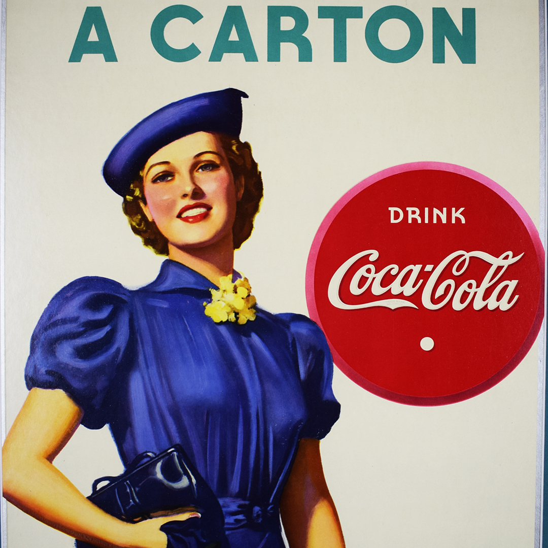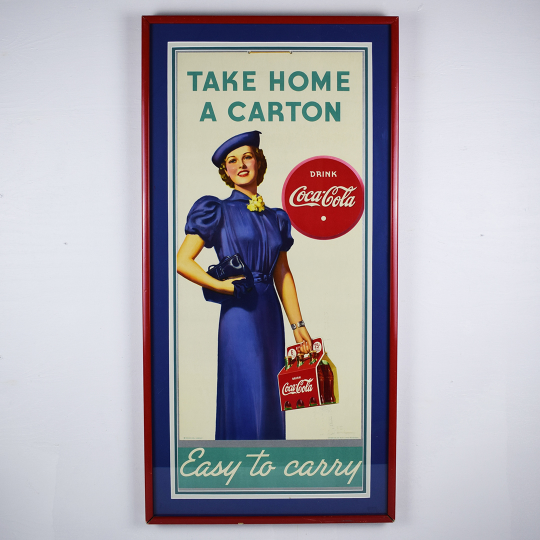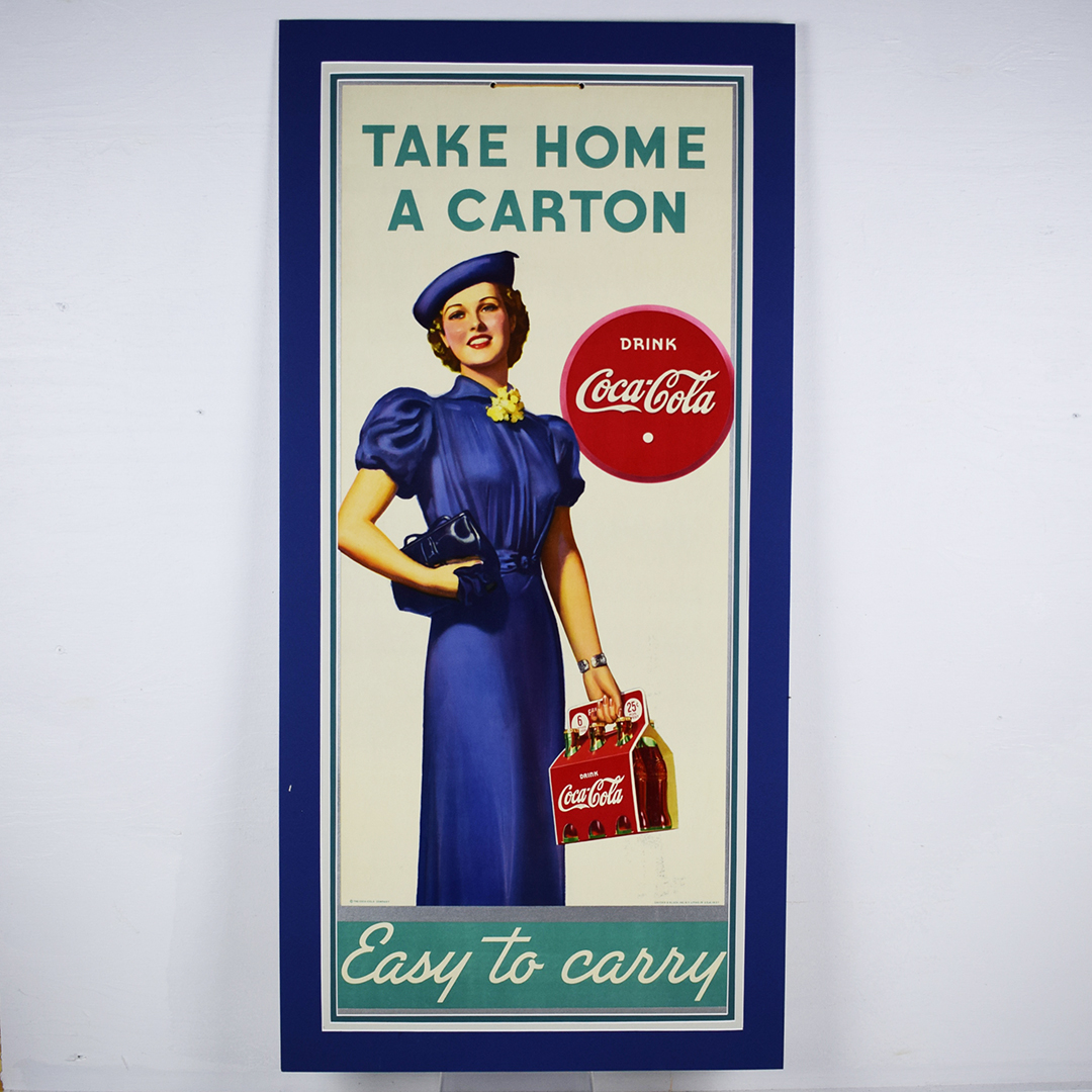 Coca-Cola always had a knack for eye-catching artwork on its signage; it was different from most boring ads back in the day! This 1937 cardboard sign features the slogan “Take Home A Carton” and a young lady carrying a six-pack easily. The colors on this sign are spectacular, and the added mat and frame make it more stunning. Below the six-pack container, the surface of the cardboard shows some color residue from production, and a slight wrinkle in the top wording letters. The sign measures 32 inches tall by 14 inches wide, while the professional frame measures 36 inches tall by 18 inches wide. 14015-QYPP