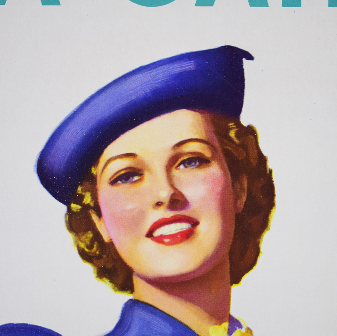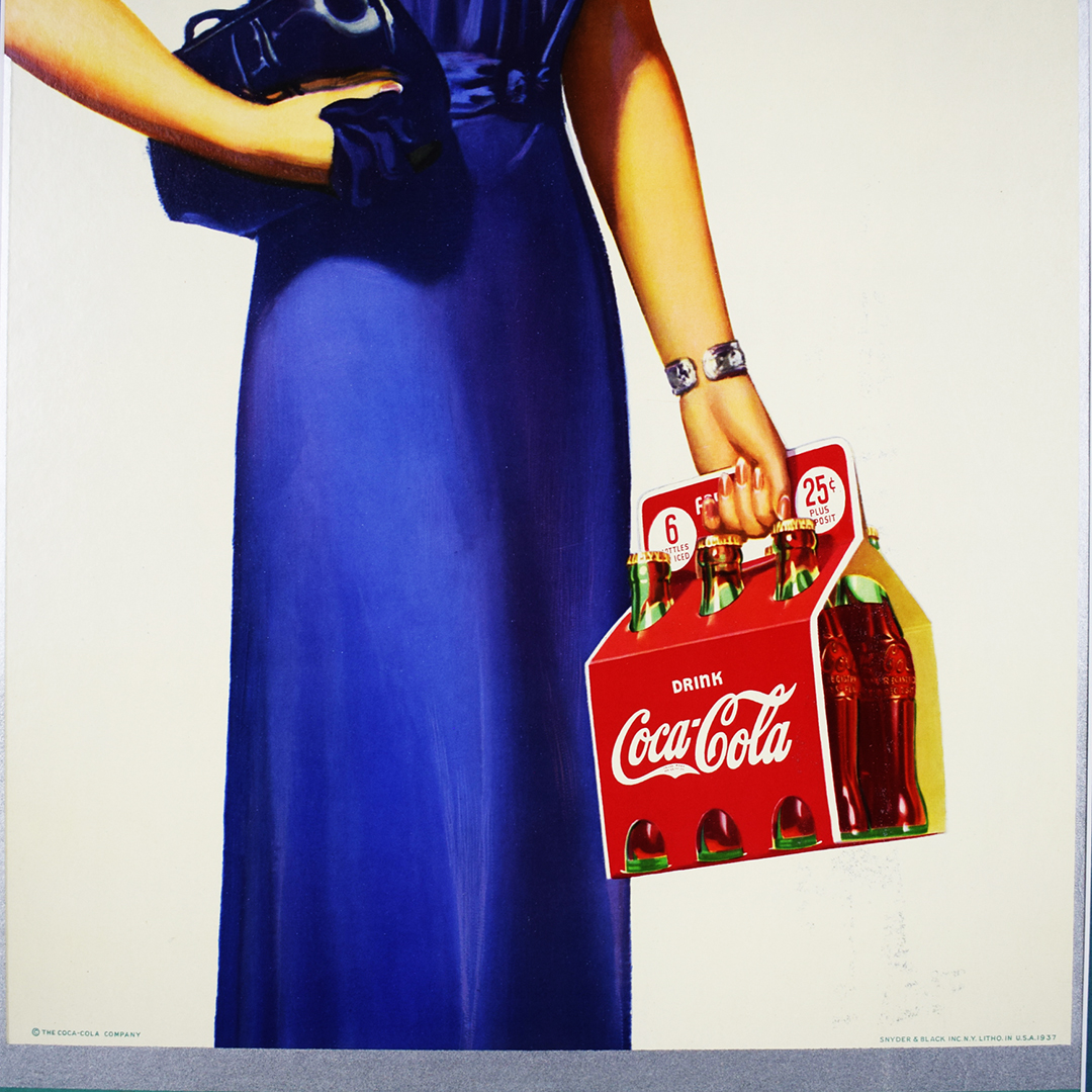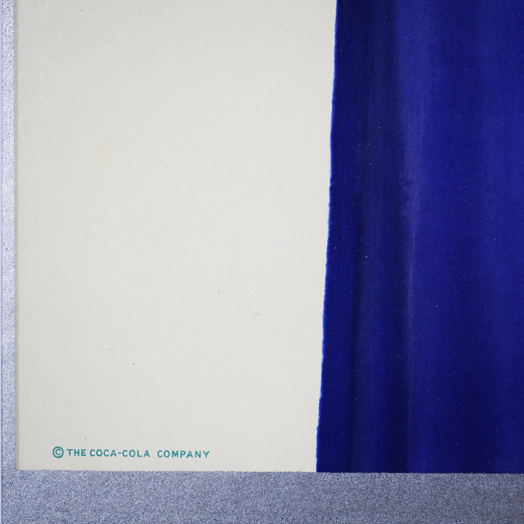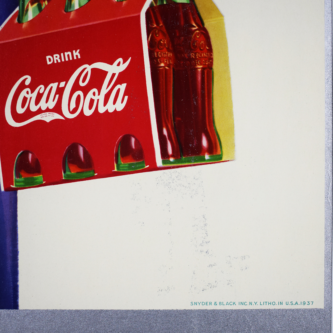 Coca-Cola always had a knack for eye-catching artwork on its signage; it was different from most boring ads back in the day! This 1937 cardboard sign features the slogan “Take Home A Carton” and a young lady carrying a six-pack easily. The colors on this sign are spectacular, and the added mat and frame make it more stunning. Below the six-pack container, the surface of the cardboard shows some color residue from production, and a slight wrinkle in the top wording letters. The sign measures 32 inches tall by 14 inches wide, while the professional frame measures 36 inches tall by 18 inches wide. 14015-QYPP
