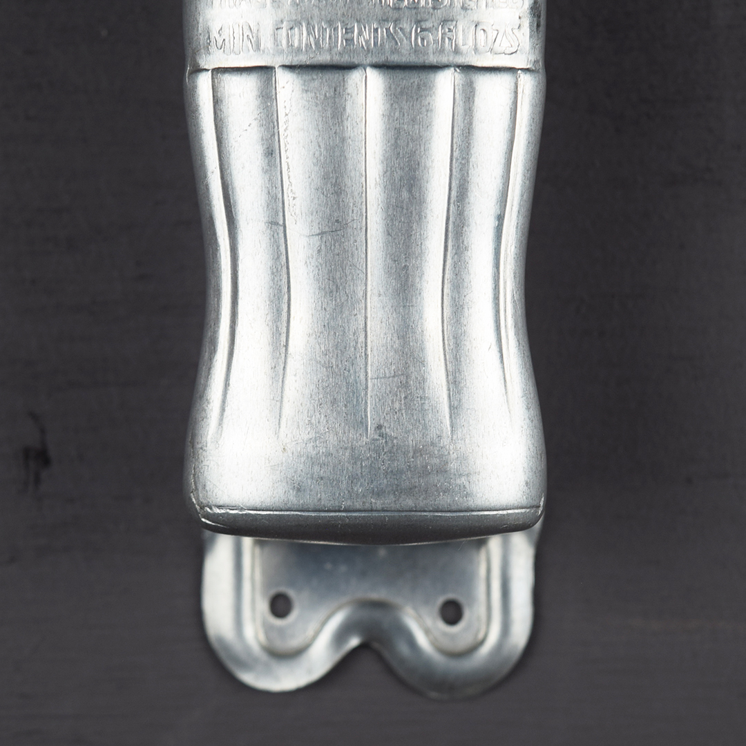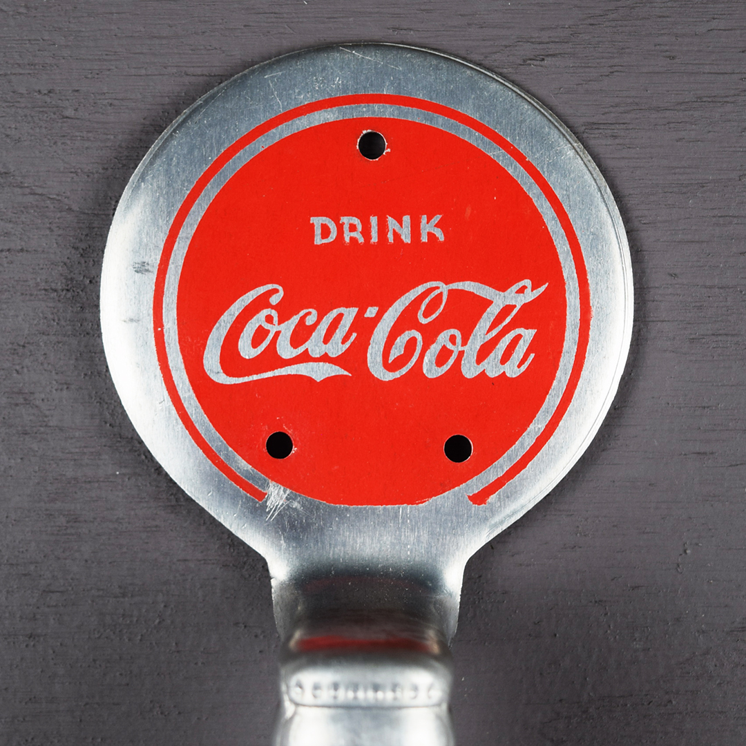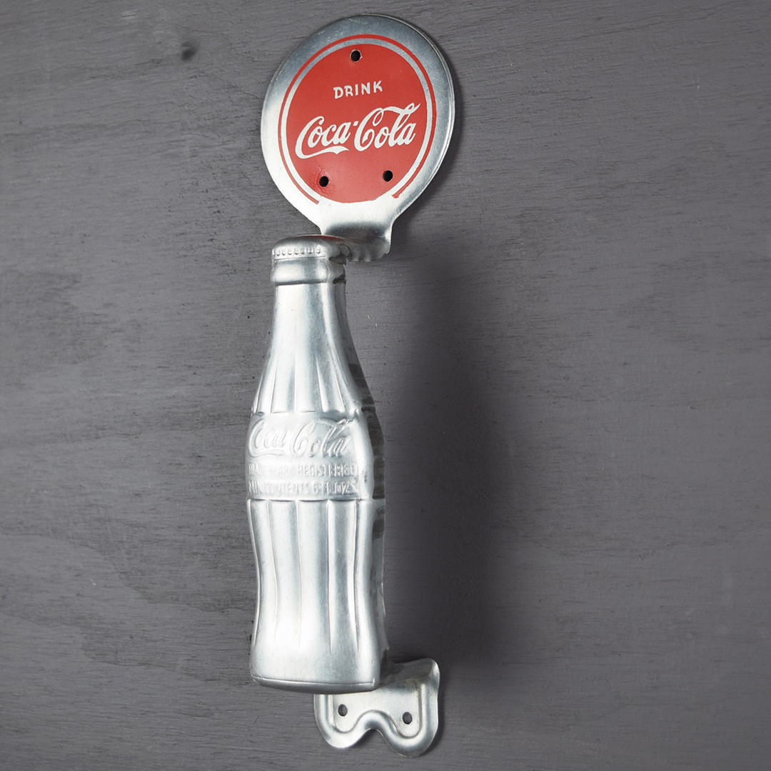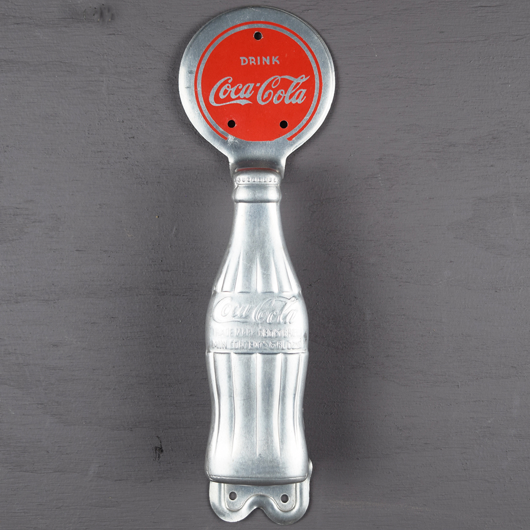 This aluminum Coca-Cola door pull is in outstanding condition and appears unused. It highlights the iconic hobbleskirt bottle and a red circle with the classic Coca-Cola script. Measuring 10.75 inches tall by 3.25 inches wide at the circle, the back is stamped “Miro-Flex Co,” “Wichita Kans.” and “Pat. Pending.” Dated to the 1940s, it will complement any collection. 21470-RPP