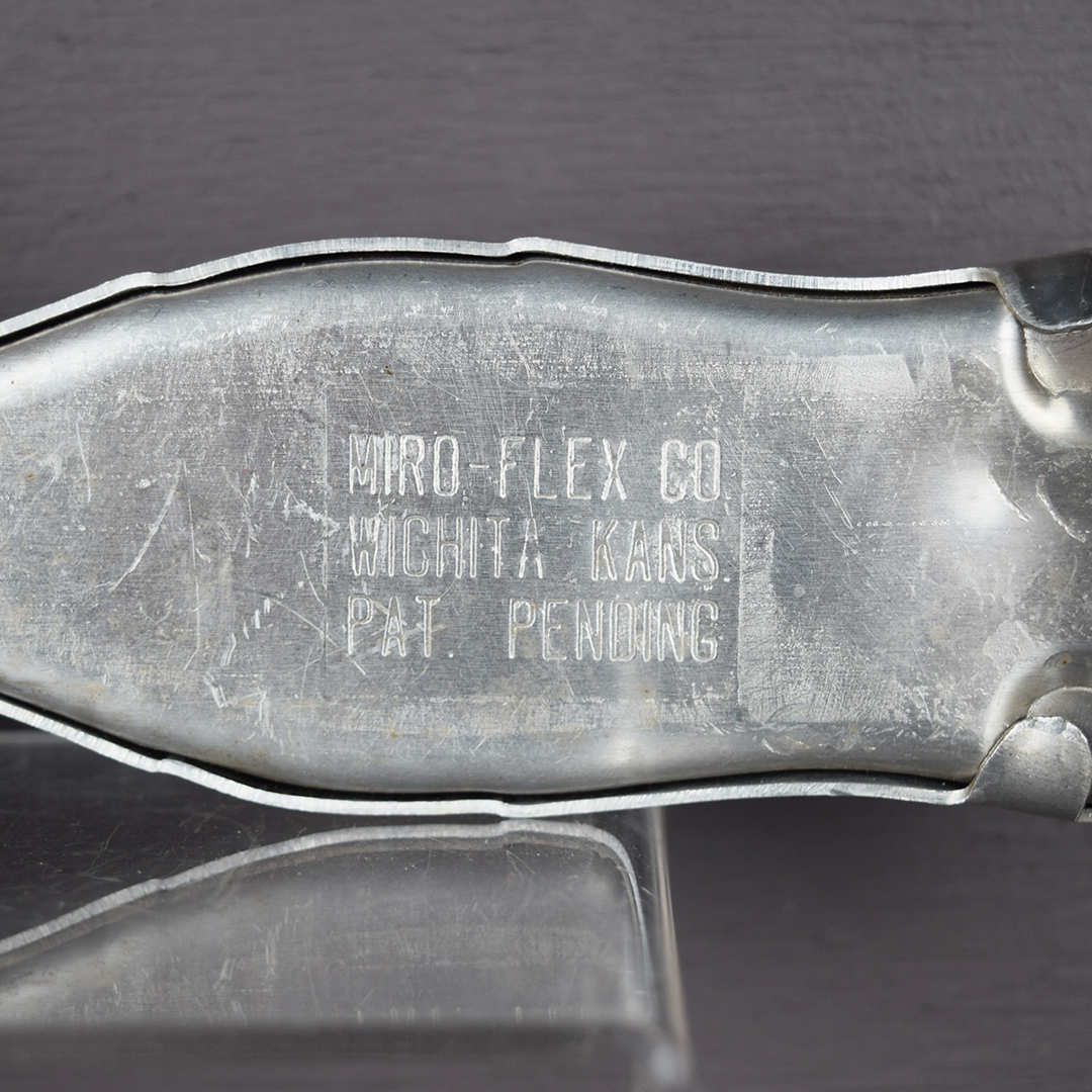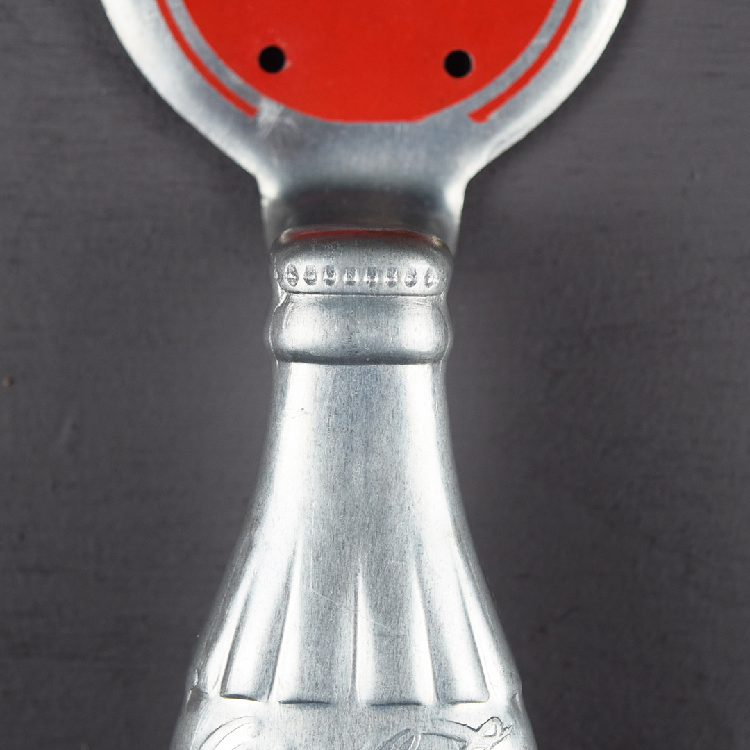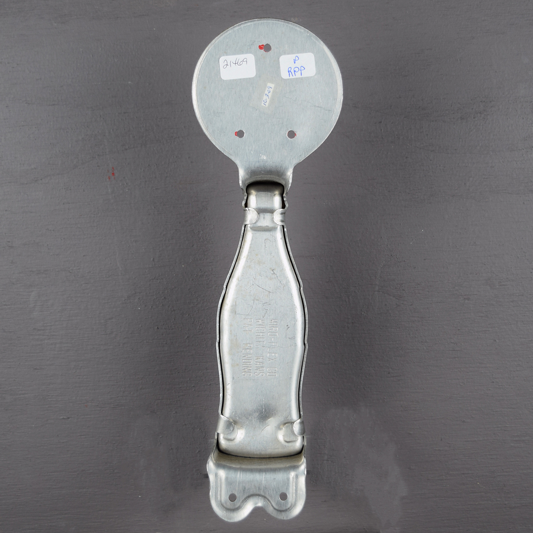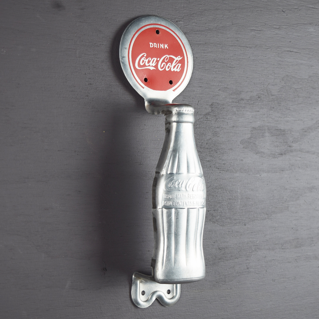 This aluminum Coca-Cola door pull is in outstanding condition and appears unused. It highlights the iconic hobbleskirt bottle and a red circle with the classic Coca-Cola script. Measuring 10.75 inches tall by 3.25 inches wide at the circle, the back is stamped “Miro-Flex Co,” “Wichita Kans.” and “Pat. Pending.” Dated to the 1940s, it will complement any collection. 21470-RPP