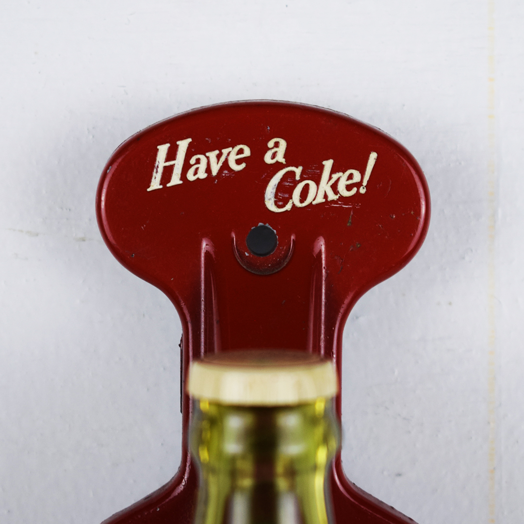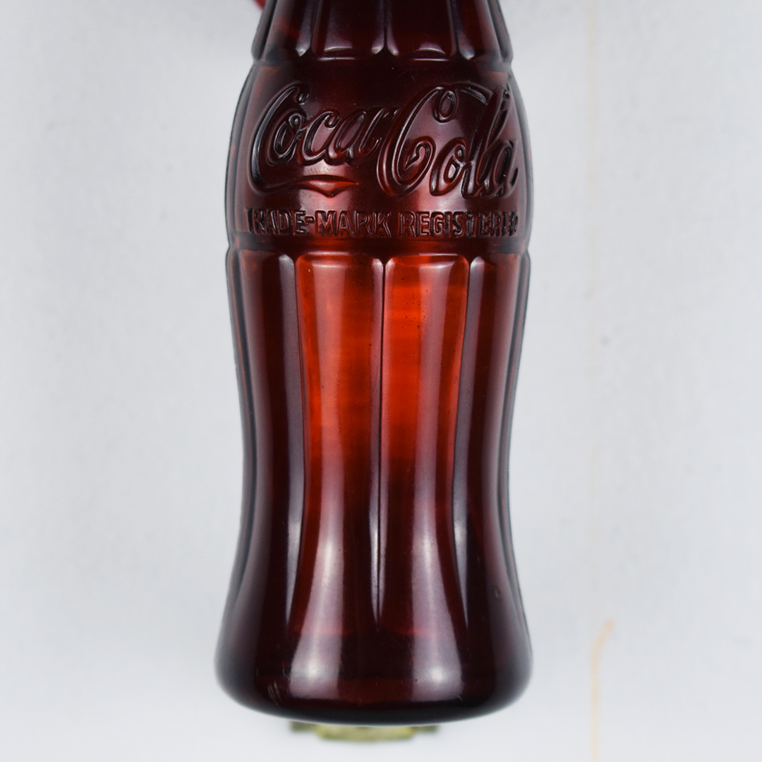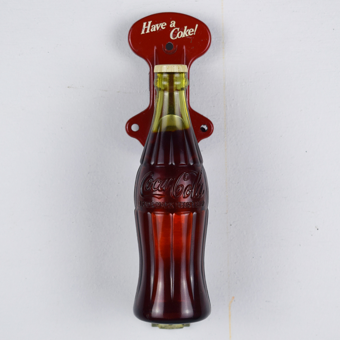 How cool is this door handle? Typically used in a soda fountain, this plastic Coca-Cola bottle features a handle grip and is attached to an aluminum housing that connects to the store door. The handle is made by Milton Sturm & Co., Chicago, IL, as stamped on the housing. It measures 8 inches tall by 2.25 inches wide and is in near-perfect condition. The red-painted aluminum bracket reads “Have a Coke!” with some production marks visible under the red paint. It’s perfect for displaying in your soda fountain collection. 21352-RPP