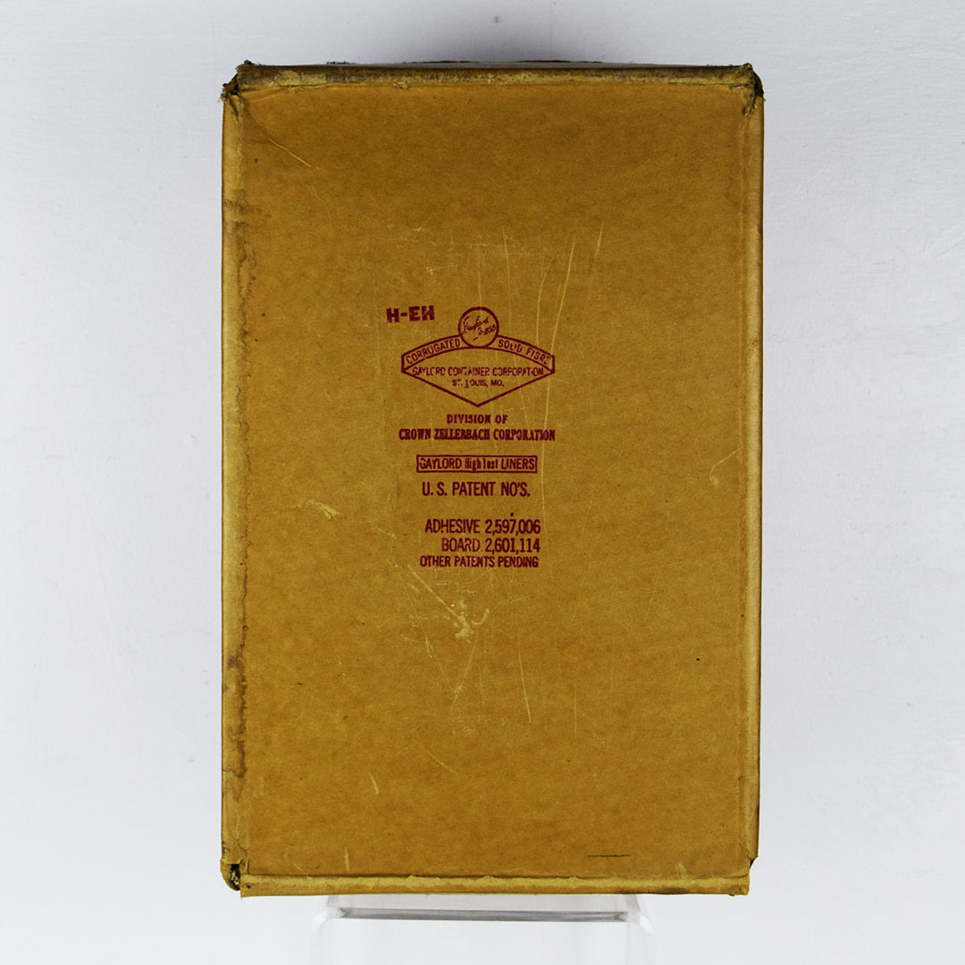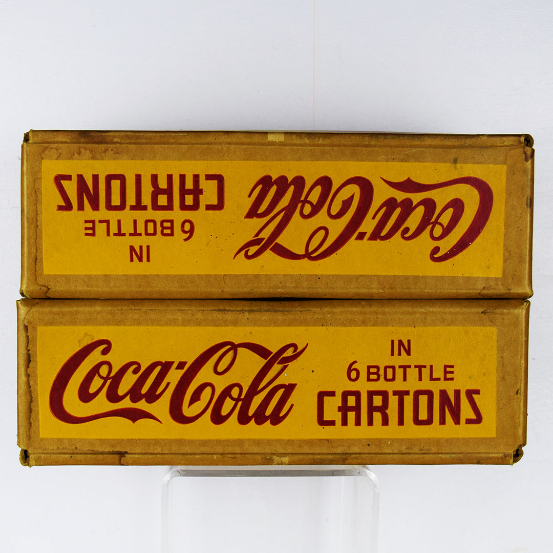 Coca-Cola was ready when party supplies were needed, especially with this heavy cardboard 24-bottle carrier! It allows the customer to carry four six-packs of 6.5-ounce bottles easily and without breaking. The sides and top graphics read “Coca-Cola In 6 Bottle Cartons” with red letters on a yellow background. It has a handle on each side, with “Coca-Cola In Cartons” below the opening. Water staining and outer corner wear are on this 1940’s piece. 17600-WT