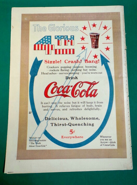 Full page Coca Cola ad on the back cover of the July 3, 1910 Minneapolis Journal Sunday Magazine. The ad celebrates the 4th of July with the inscription “The Glorious 4th (4th in stars and stripes) Sizzle ! Crash ! Bang !” There is an image of a flared lip Coke glass with exploding stars all around it in the upper right corner and the familiar curved arrow insignia that was used on Coke bottles and advertisements at that time. The ad is in excellent condition with very light discoloration. There are a few pages behind the ad but the front of the magazine has been torn off. 7826-0100