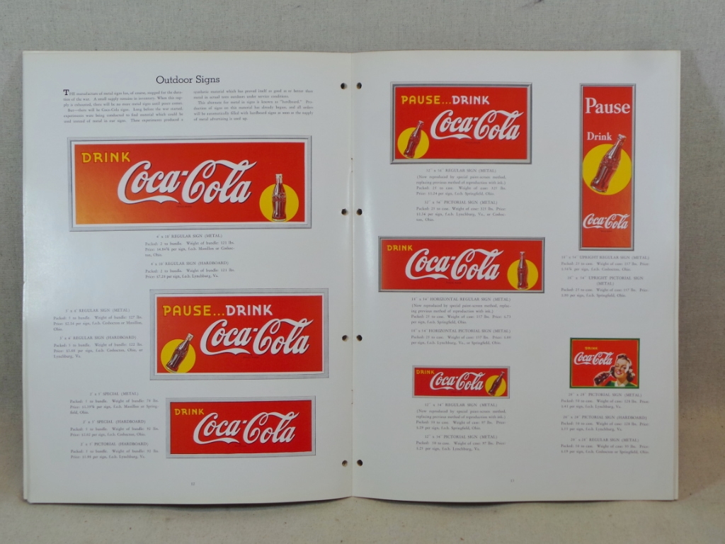 Another great Coca-Cola advertising price list from 1943, featuring beautiful 4-color illustrations of cardboard displays, Rationing Signs, America’s Fighting Planes set, Our America school sets, outdoor embossed metal signs, porcelain hanging signs, store front decals, lollypop sign, metal carton rack, sidewalk signs, playing cards, blotters, trays and more. Amazing prices too! 20-pages. Measuring 11″ x 15.” Condition issues: This has been hole-punched (most likely to be inserted into a binder). Some minimal creasing because of its size, and writing in ink inside cover with salesman’s name and issue number. Other than what I indicated, pages are clean as far as sharp corners. No staining, no stuck pages, no age odor. Cover is vibrant, along with inside pages. Very nice to use as a reference guide, as many pieces listed are not seen in price guides. 18095-31QTP