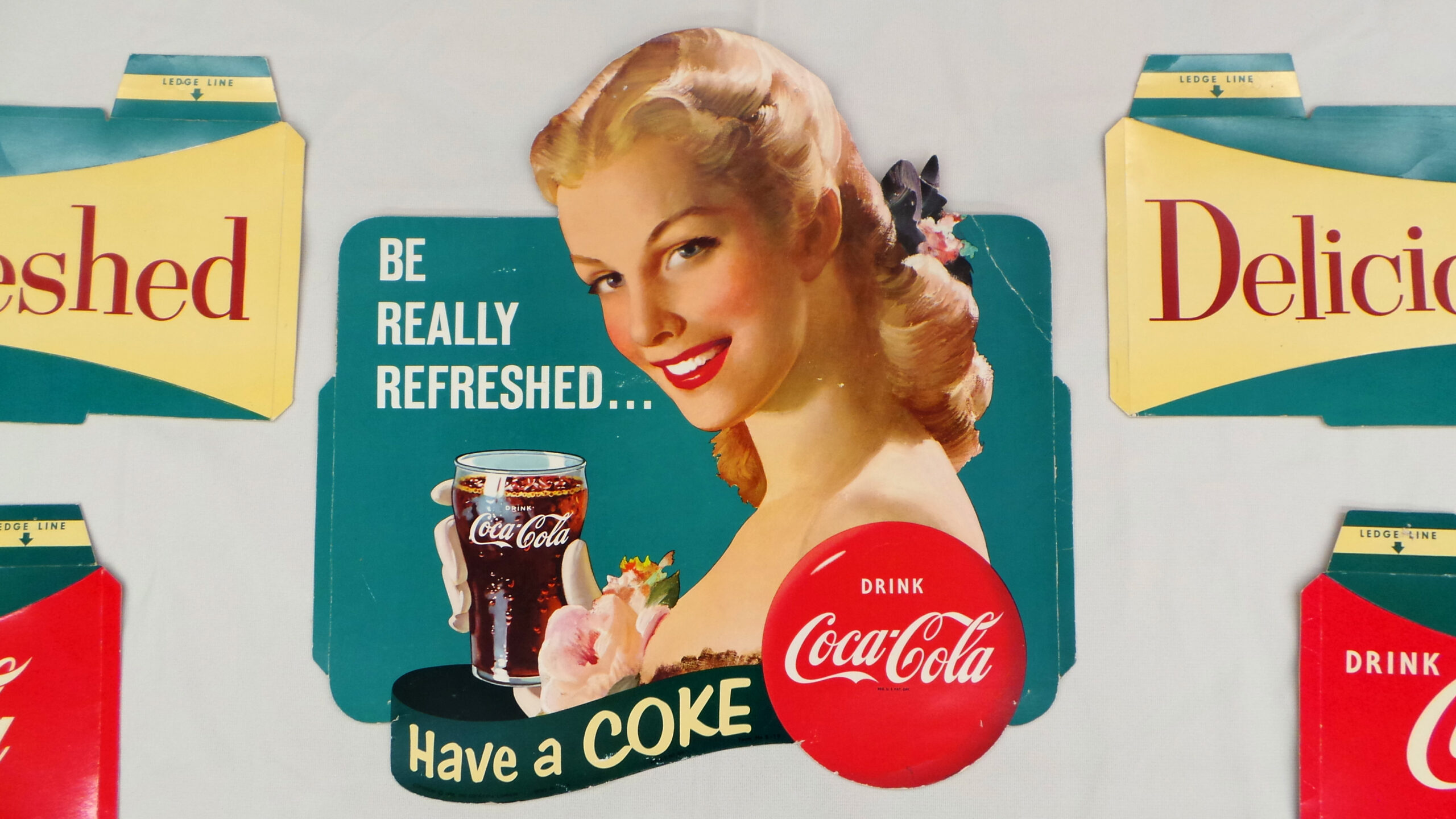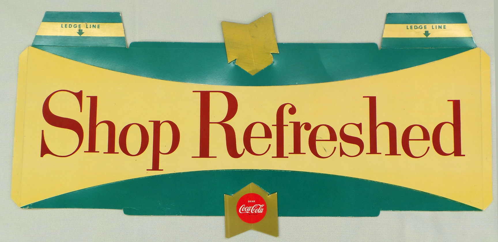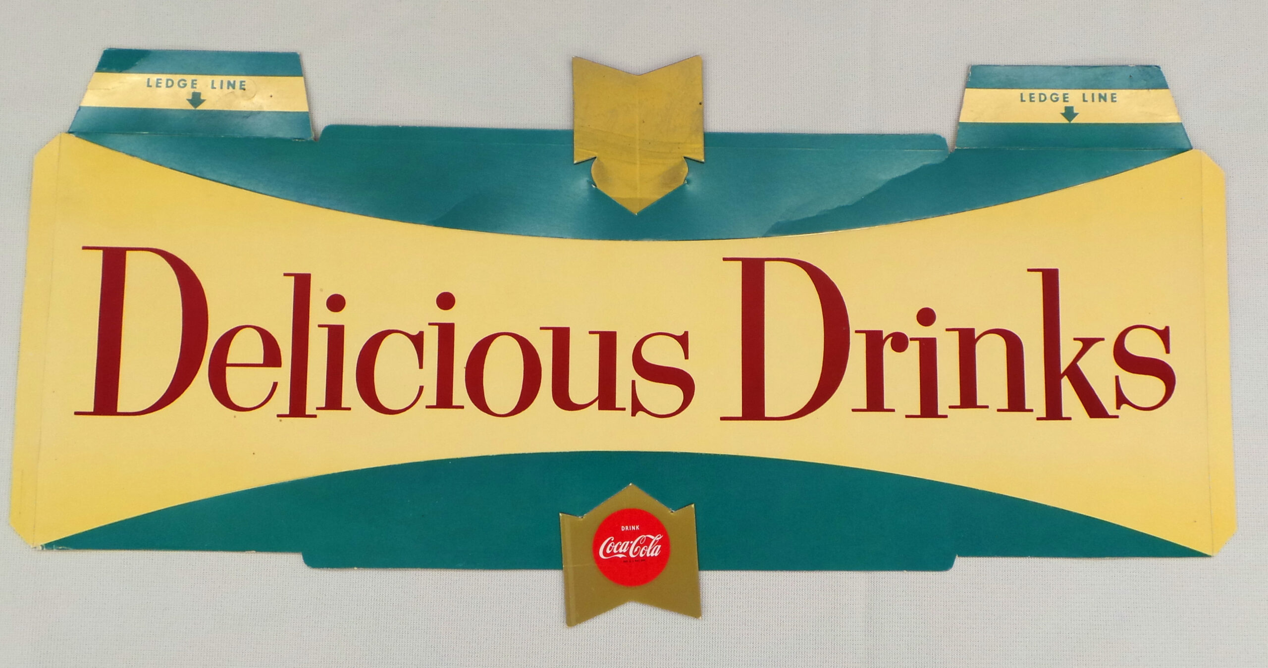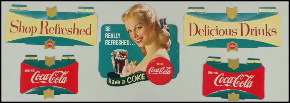Wonderful colorful Circa 1958 five piece cardboard diecut Coca Cola festoon with an image of a pretty young lady holding a glass of Coke with a red button emblem at her shoulder. The caption reads “Be really refreshed … have a Coke.” The next two panels are inscribed “Shop refreshed” and “Delicious drinks” and the outer two are inscribed “Drink Coca Cola.” The festoon is designed with interlocking gold strips that create a bulge in the panel when joined, thus creating a true 3D sign. It is in excellent condition with great color. There are two minor creases behind the lady’s head on the center section, which when put on the wall will not be visible. Truly a soda fountain surviver. 6565-80QWTP