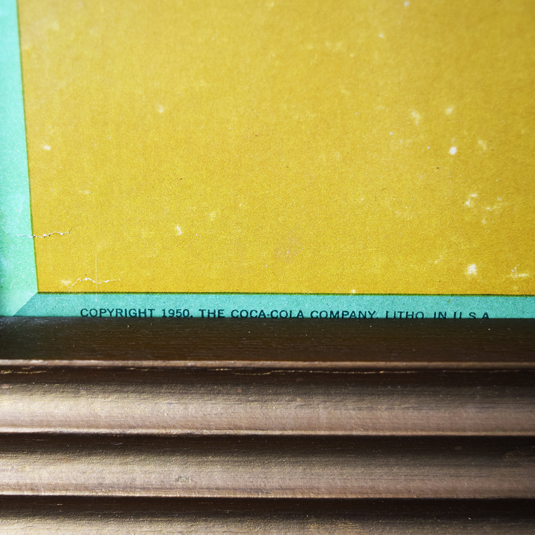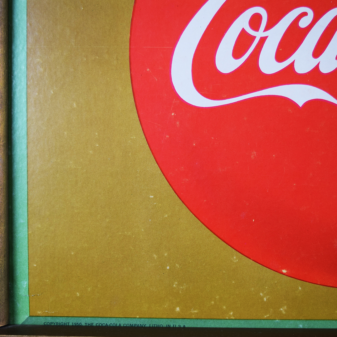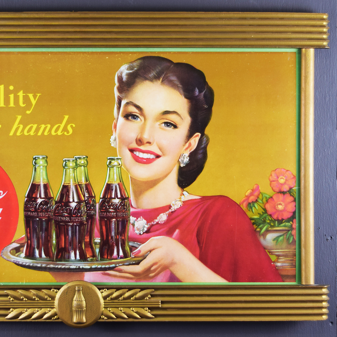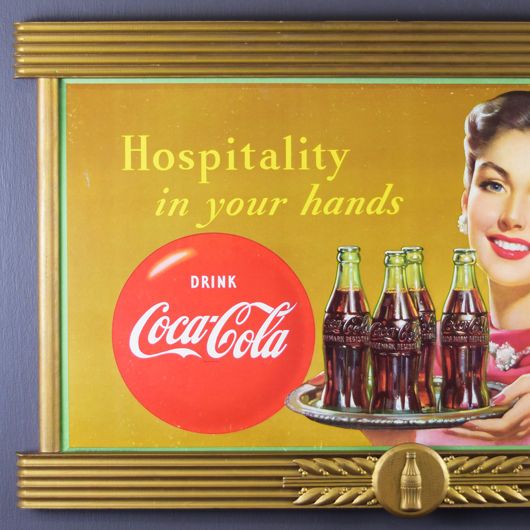 Coca-Cola is regarded as a master of marketing, boasting iconic campaigns and worldwide brand recognition. This single-sided cardboard sign, dated 1950 in the lower left corner, is housed in a wooden Kay frame that measures 25 inches tall by 40 inches wide. The litho on the cardboard sign features a smiling lady holding a tray with four Coca-Cola bottles ready for company. The slogan reads, “Hospitality is in your hands”, and the iconic red Coca-Cola button is below. The cardboard sign features vibrant colors, with some minor discoloration in the outer sections and a few small wrinkles in the lower right corner. The gold frame is an original Kay Frame, as stamped on the reverse side. This signage would have hung in your local grocery store, and now it’s time to hang it in your collection. 21478-QTYP