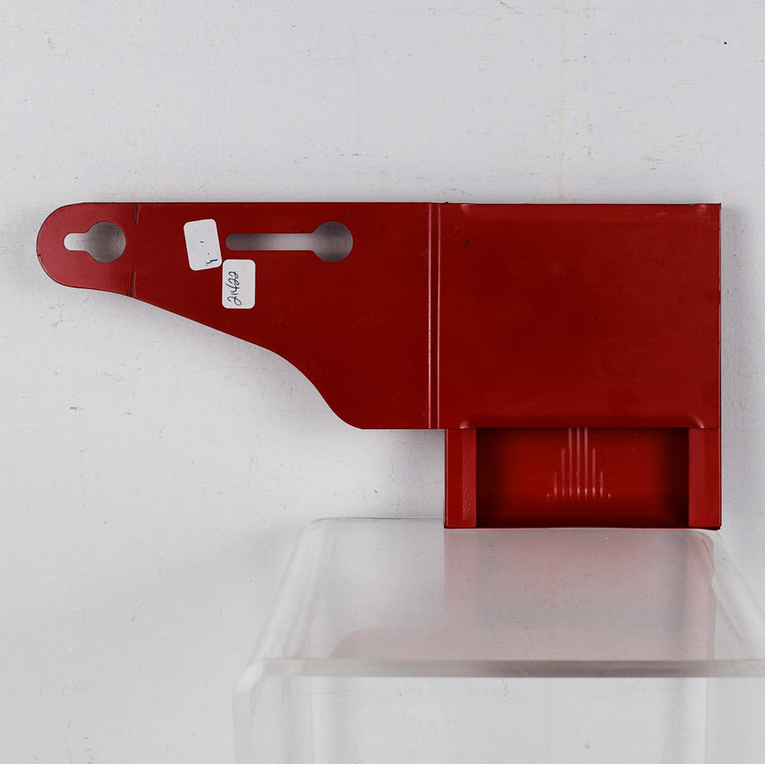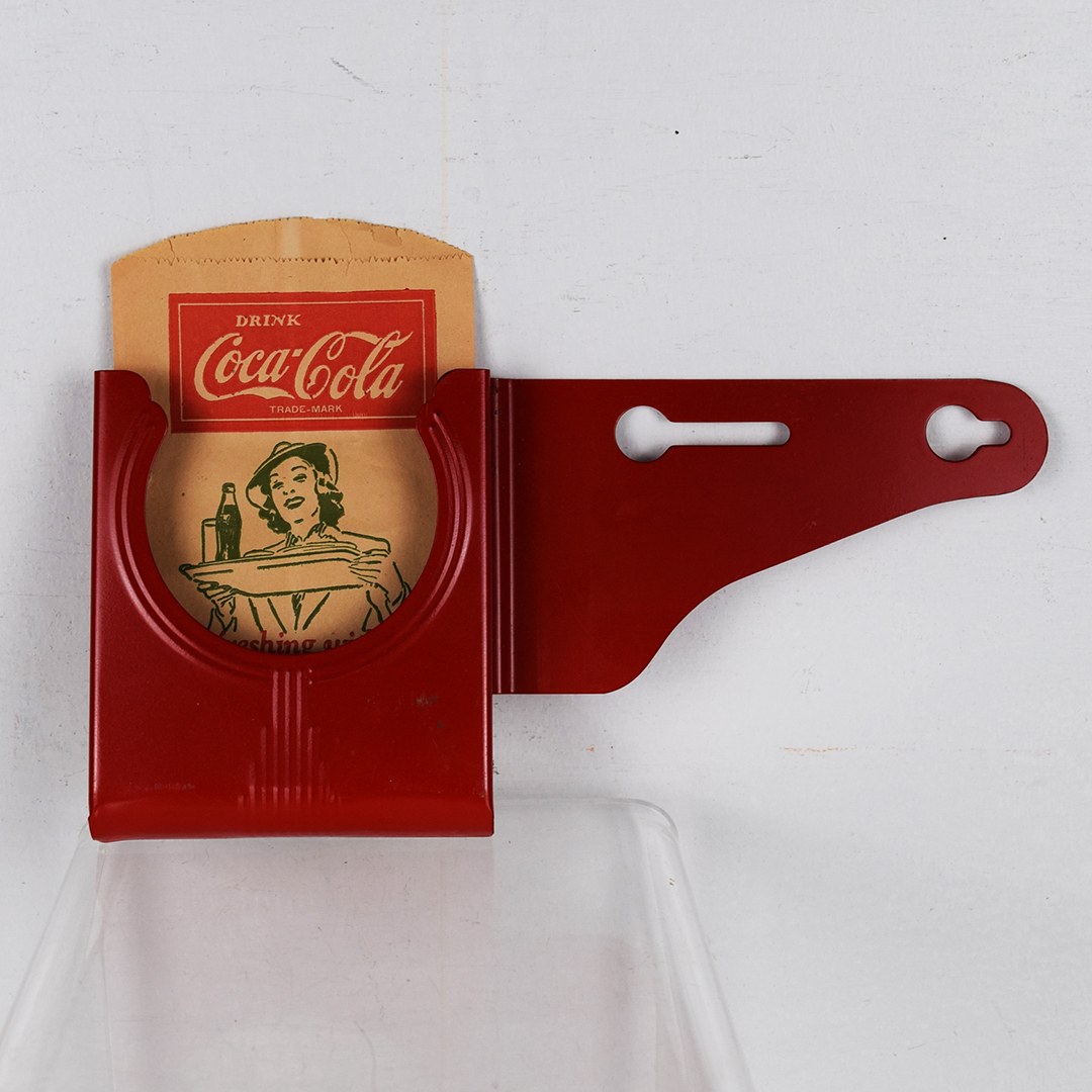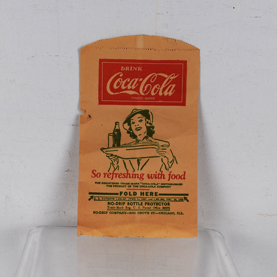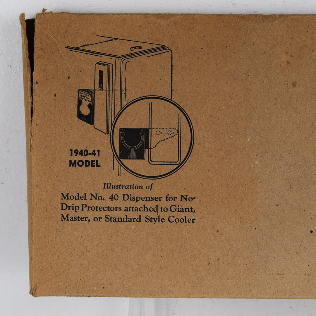 No-drip bottle protectors allowed you to enjoy an ice-cold Coca-Cola without the outside water condensation making your hand or table wet. This Model No. 40 metal bracket was attached to the side of 1940 and 1941 Coca-Cola coolers and allowed customers to take a paper bottle protector when they purchased a bottle of Coke. This bracket is in new old stock condition, complete with the original box and one no-drip bottle protector. The bracket measures 5 inches in height by 10.5 inches in length. The box shows wear on the end flaps, and the no-drip bottle protector has a few small tears from storage. 21422-QPP