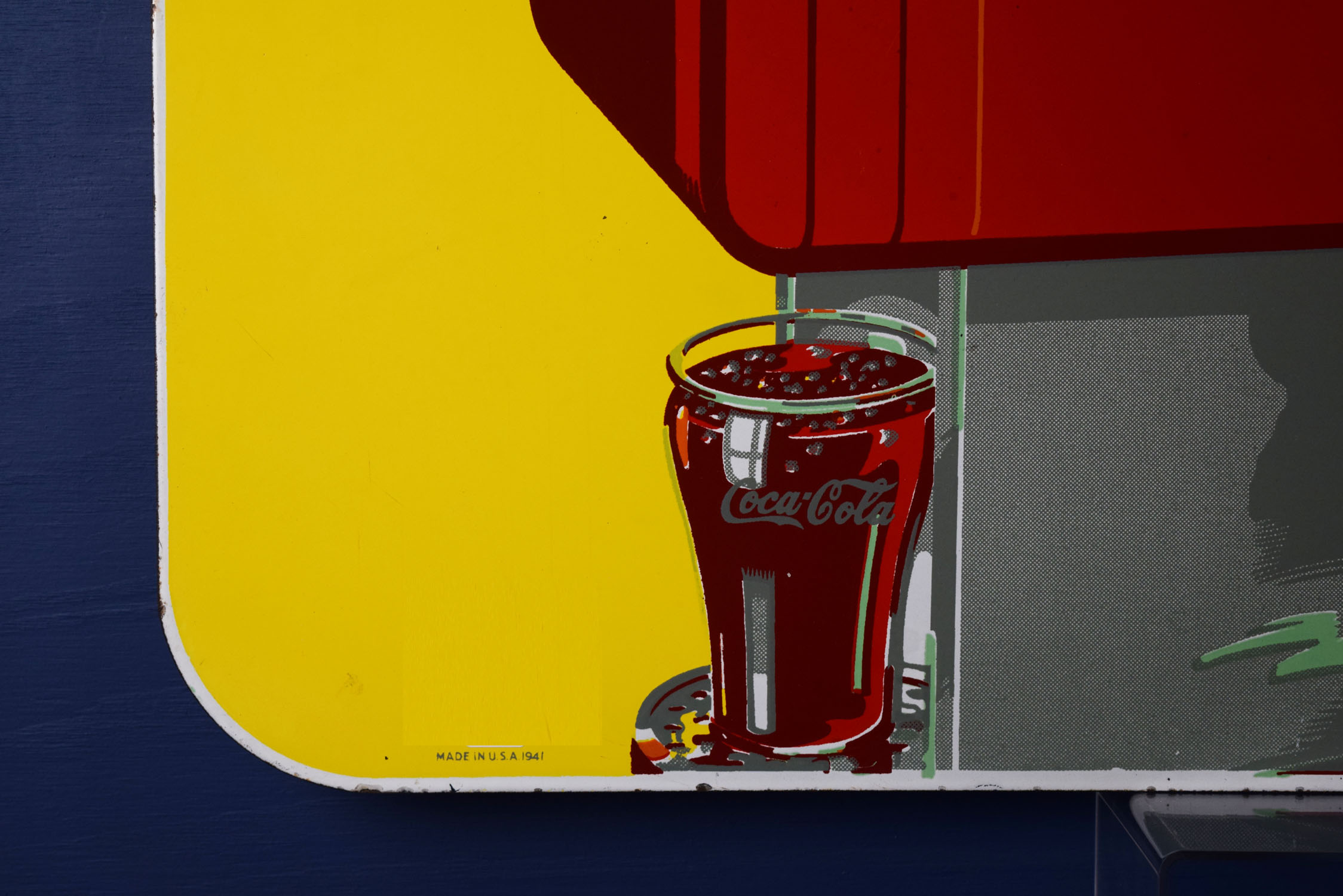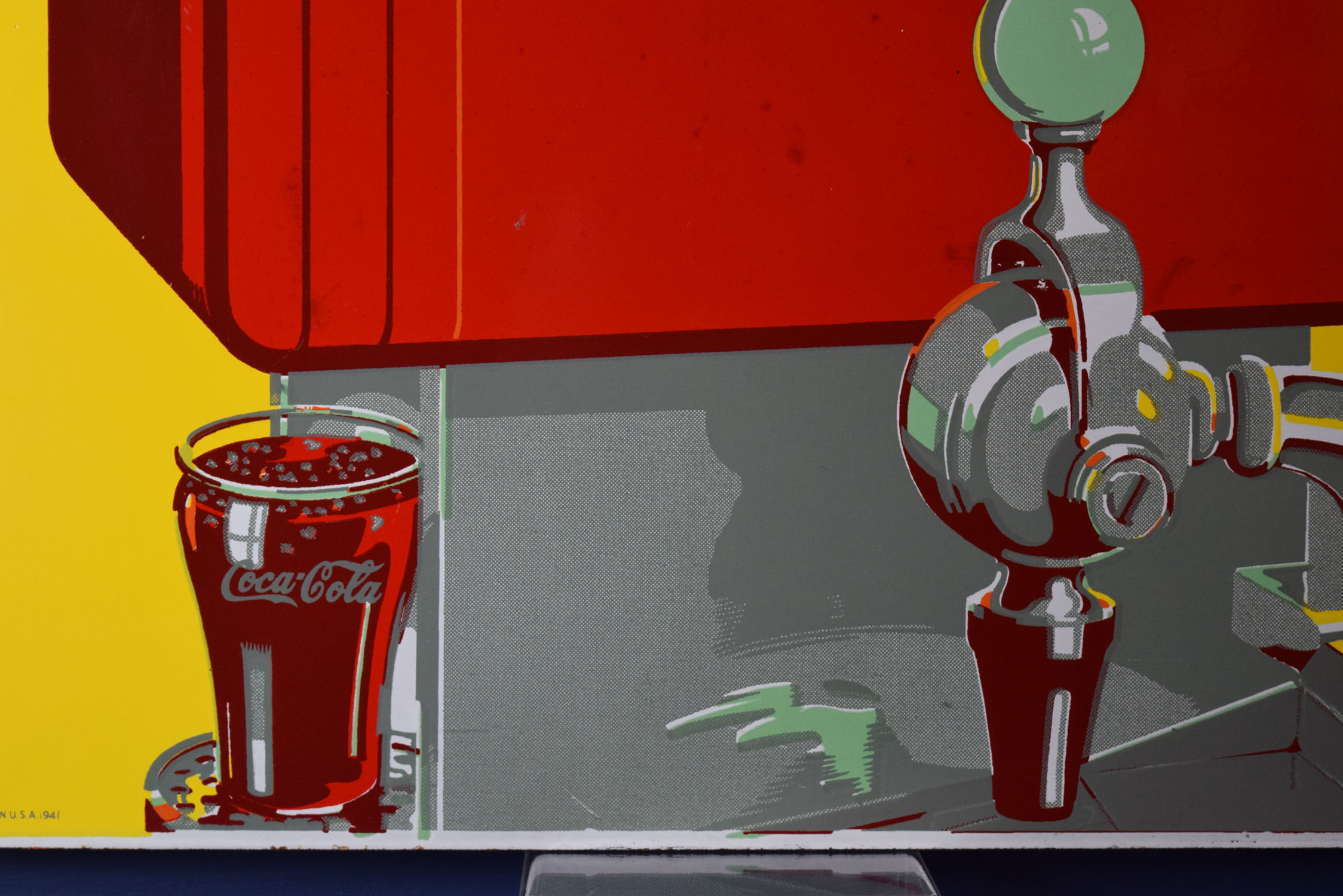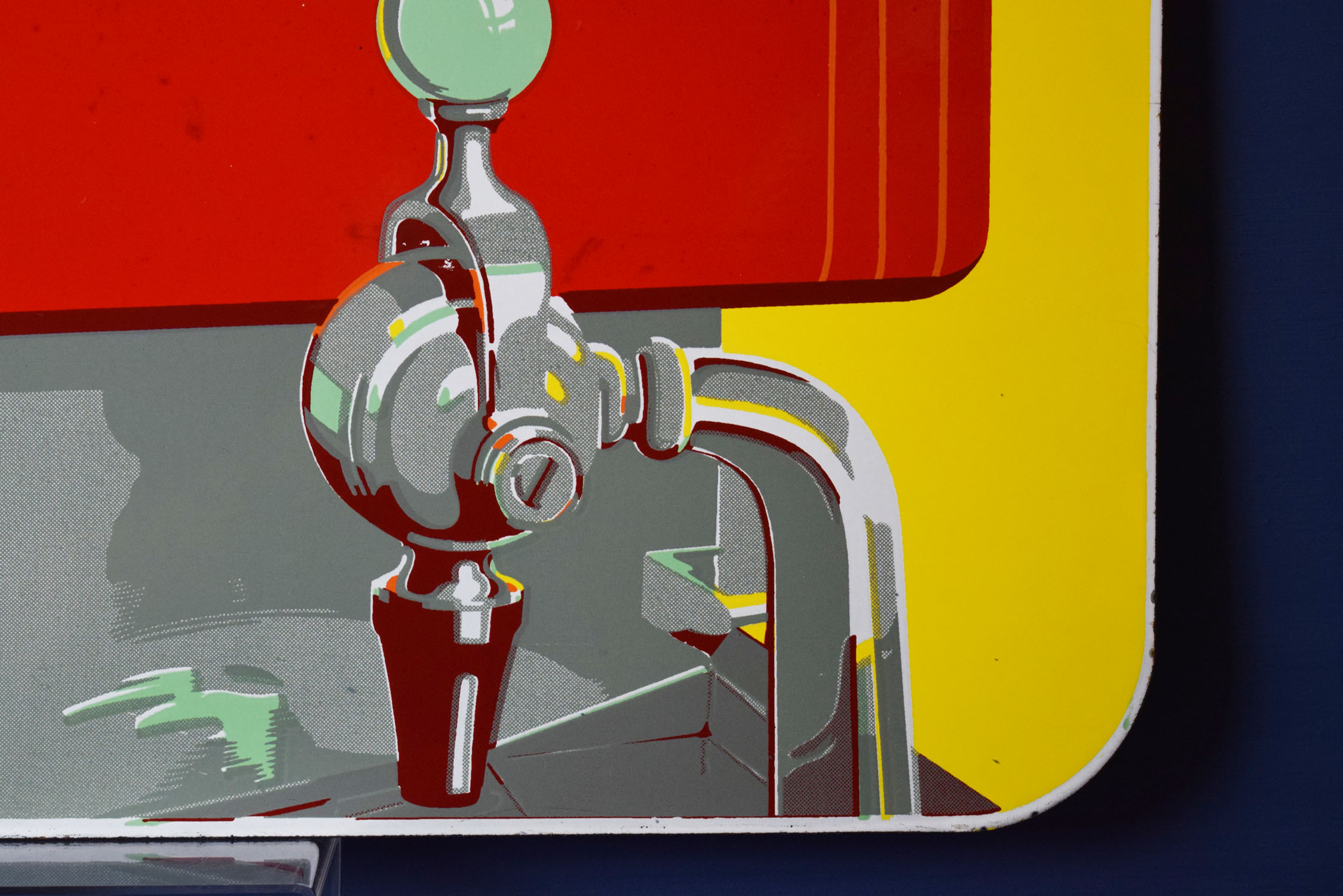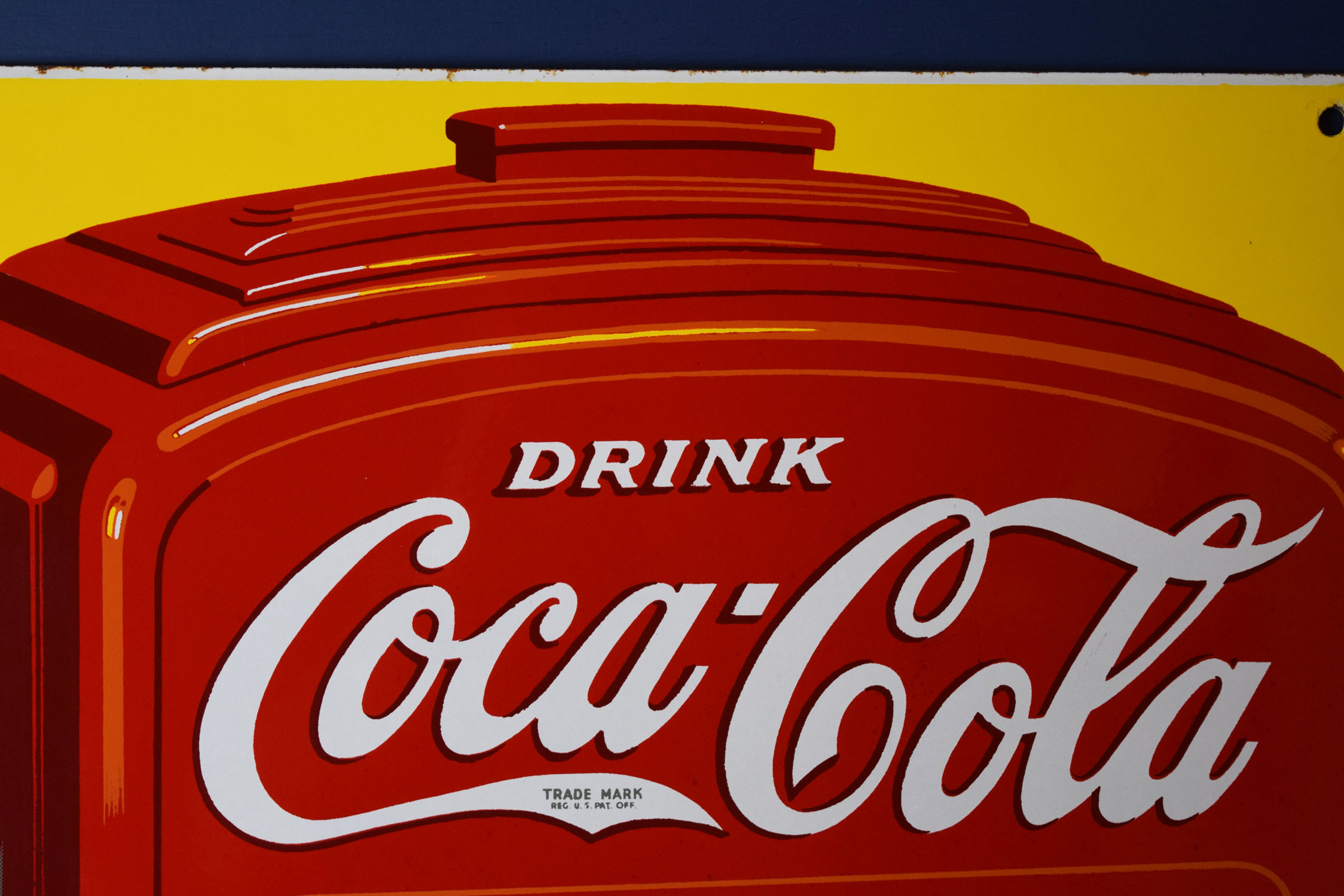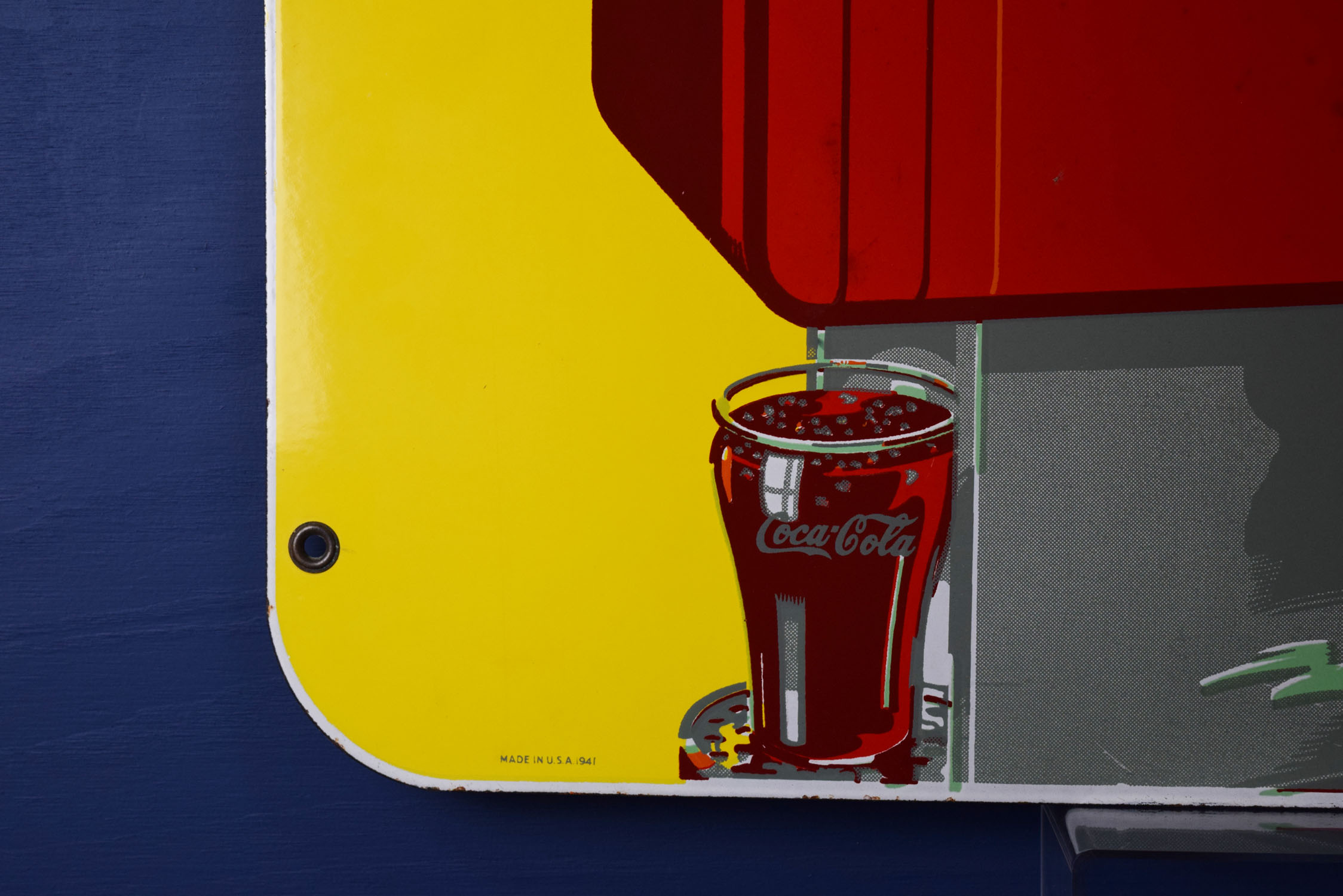 One of the nicest fountain dispenser porcelain signs we have seen recently, this one is top notch and in amazing shape. It is dated 1941 and the colors just pop on this beauty. A few small chips around the outer edge can be seen, along with one small chip by the upper mounting hole. The field is super clean and glossy, just as it should be. This is one that you will not have to upgrade, it is top of the scale and ready to own! 19663-RTPP