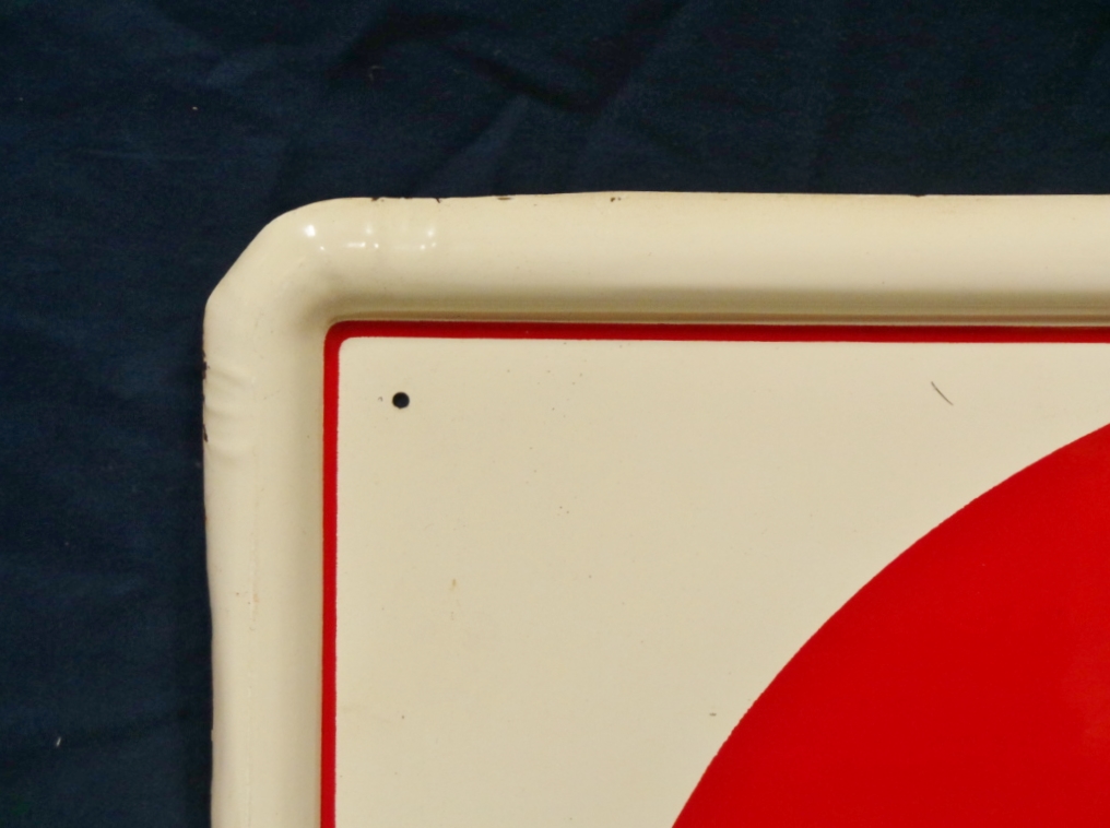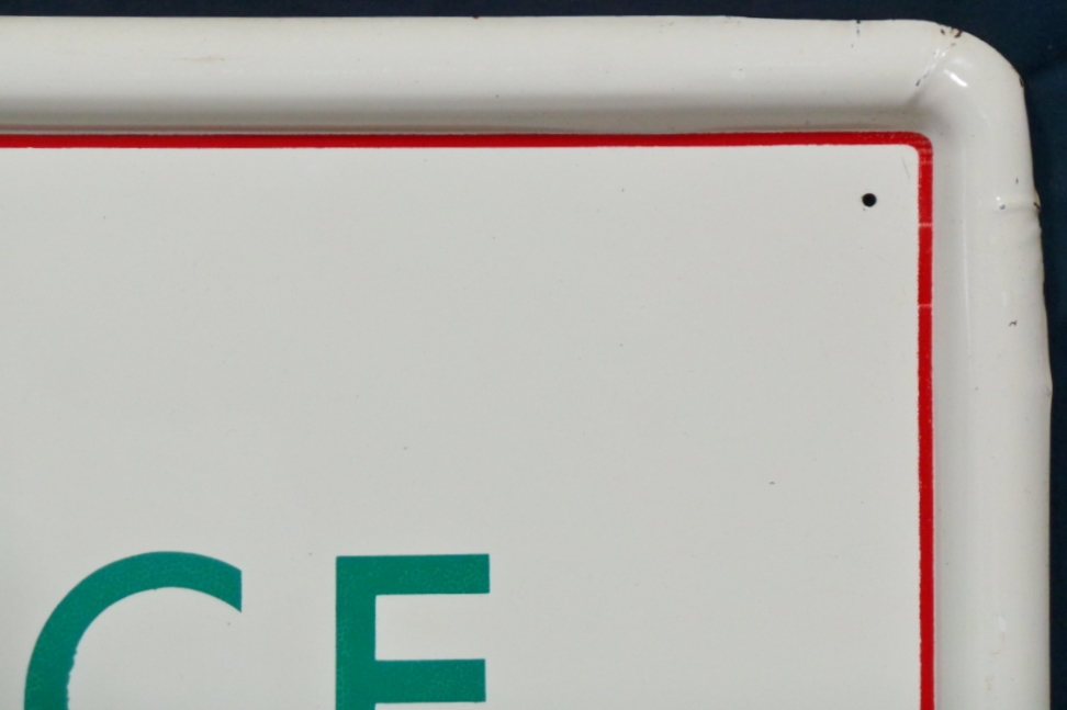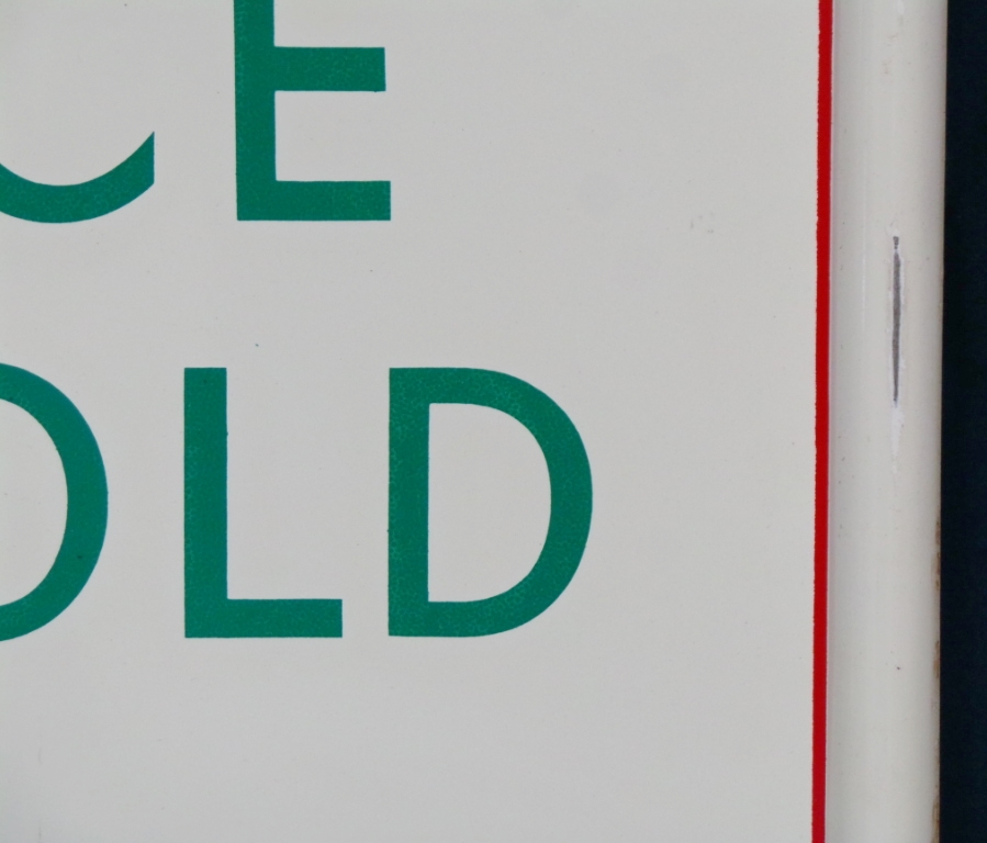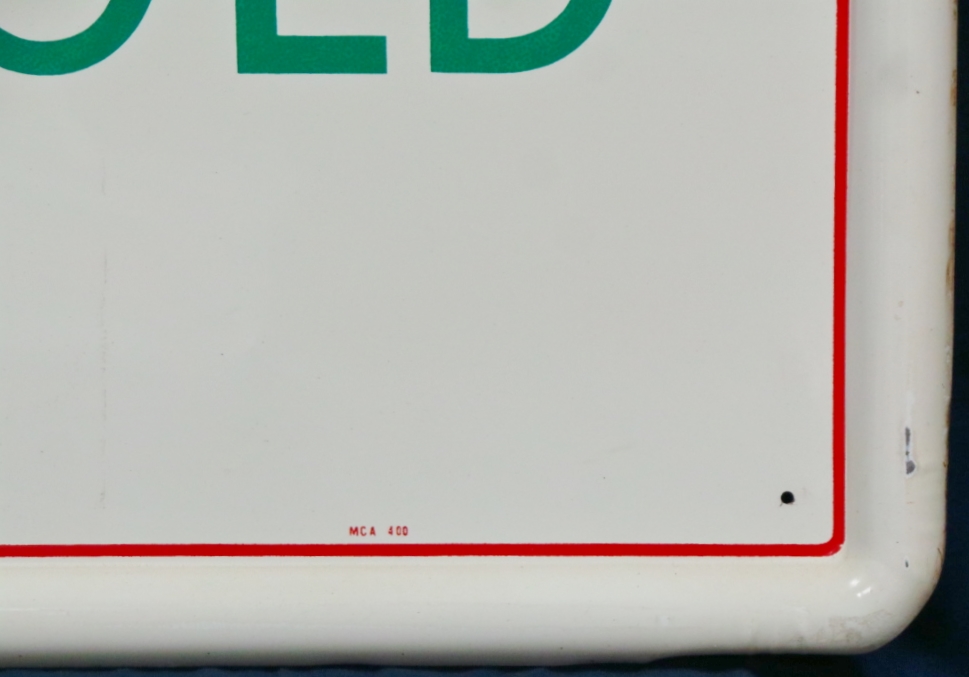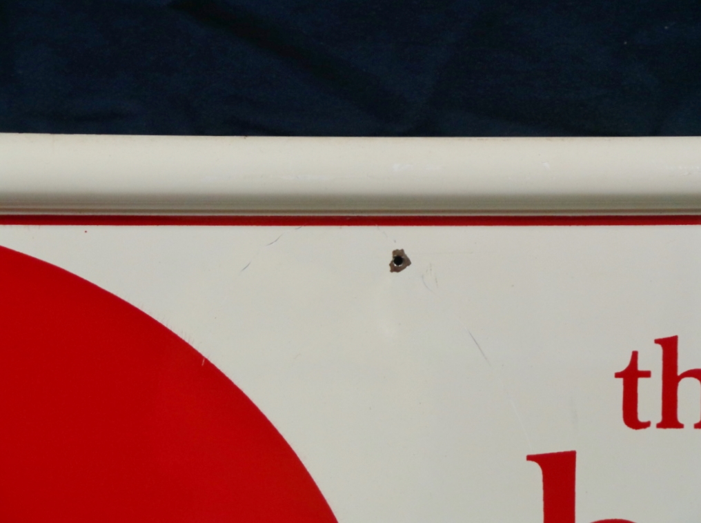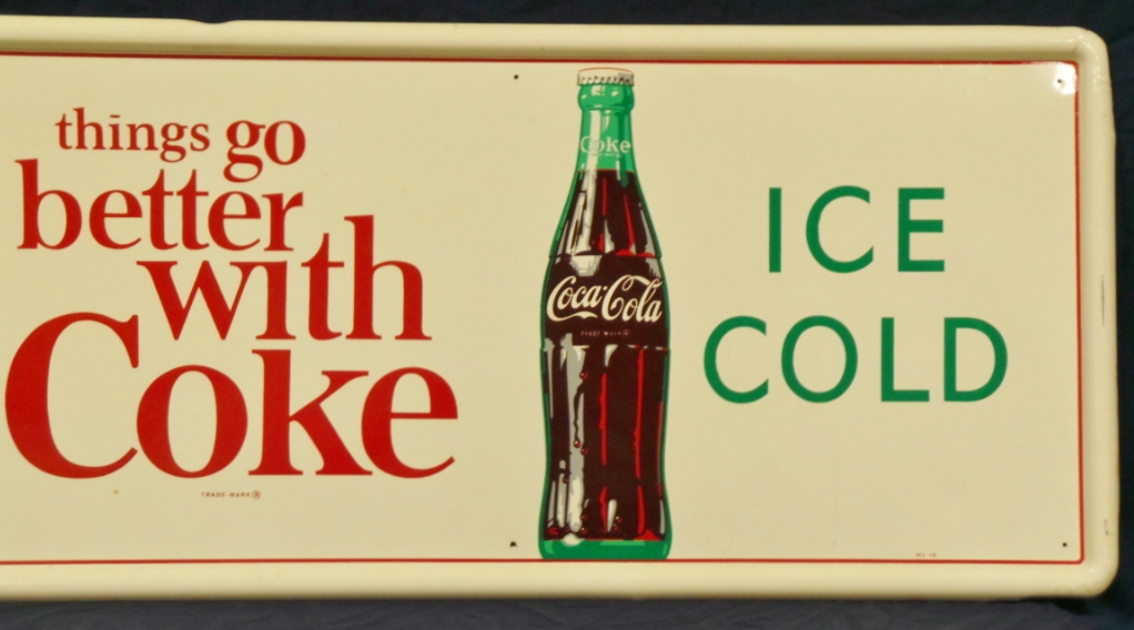 This great looking larger Coca Cola sign has it all! From the beautiful red Coca Cola button on the left to the iconic Coke bottle in the center, and “Ice Cold” on the right it tells you everything you need and makes you want a Coke, because “Things Go Better with Coke”! This metal sign is self framed and has a dent right in the middle top of the frame. The outer lip has some wear and some paint loss from years of use. The small mounting holes in the middle of the sign have some chipping around them, and have not been touched up. A few scratches in various places, one just below “Cold”, one just to the right of the Coke bottle, and a very light half moon scratch that goes from the red button over the mounting hole and stops at the “b” in better. As we said before, this is the larger sign, it measures just over fifty-three inches long and almost eighteen inches tall. A must have for the Coke collector! 18272-YPP