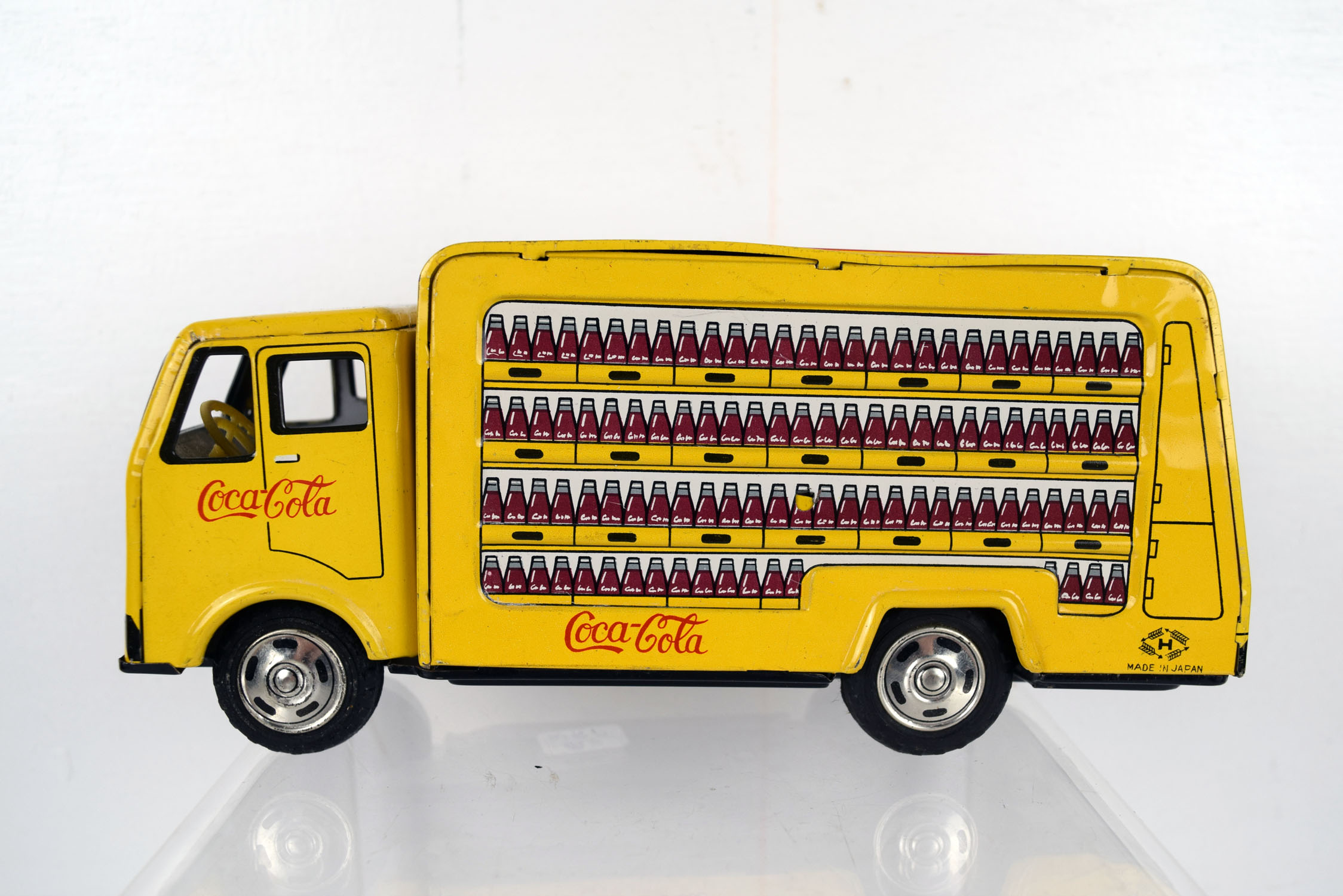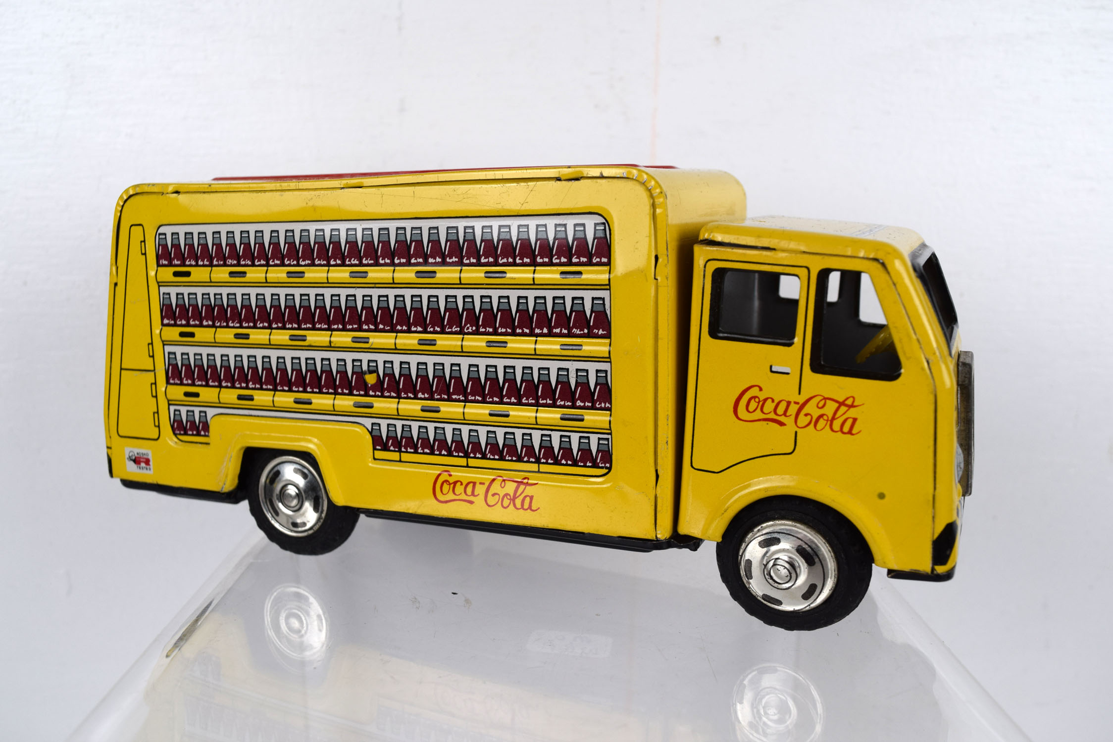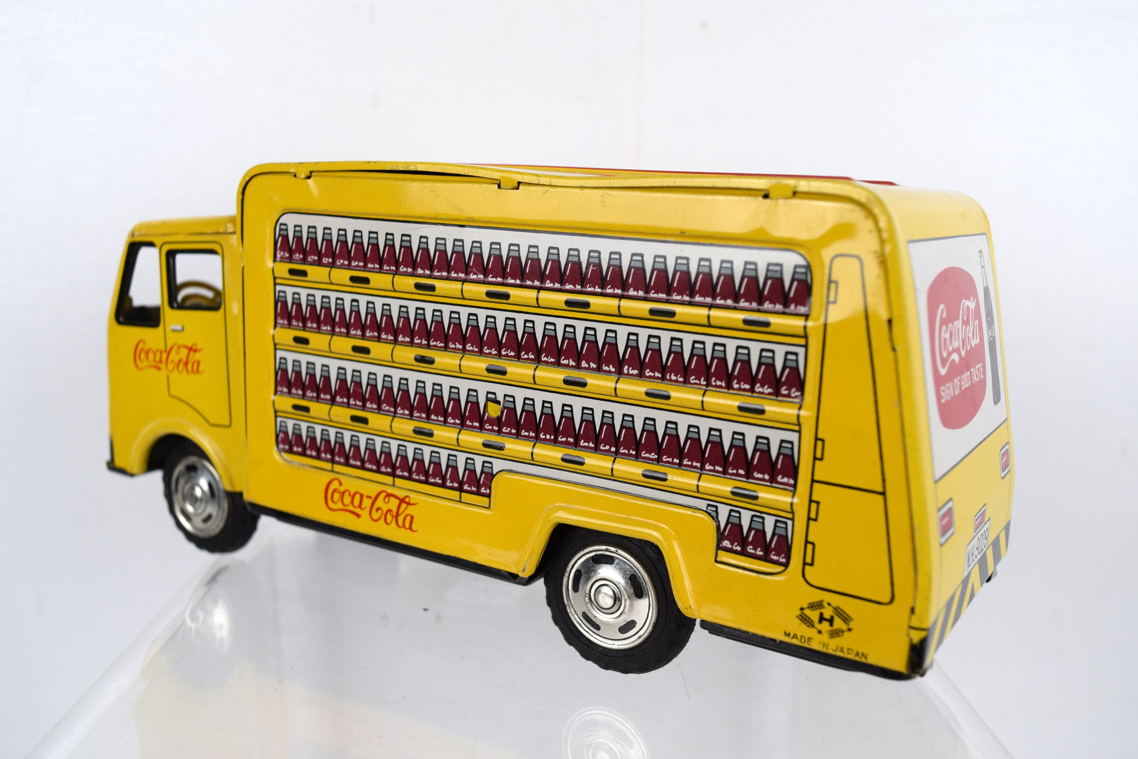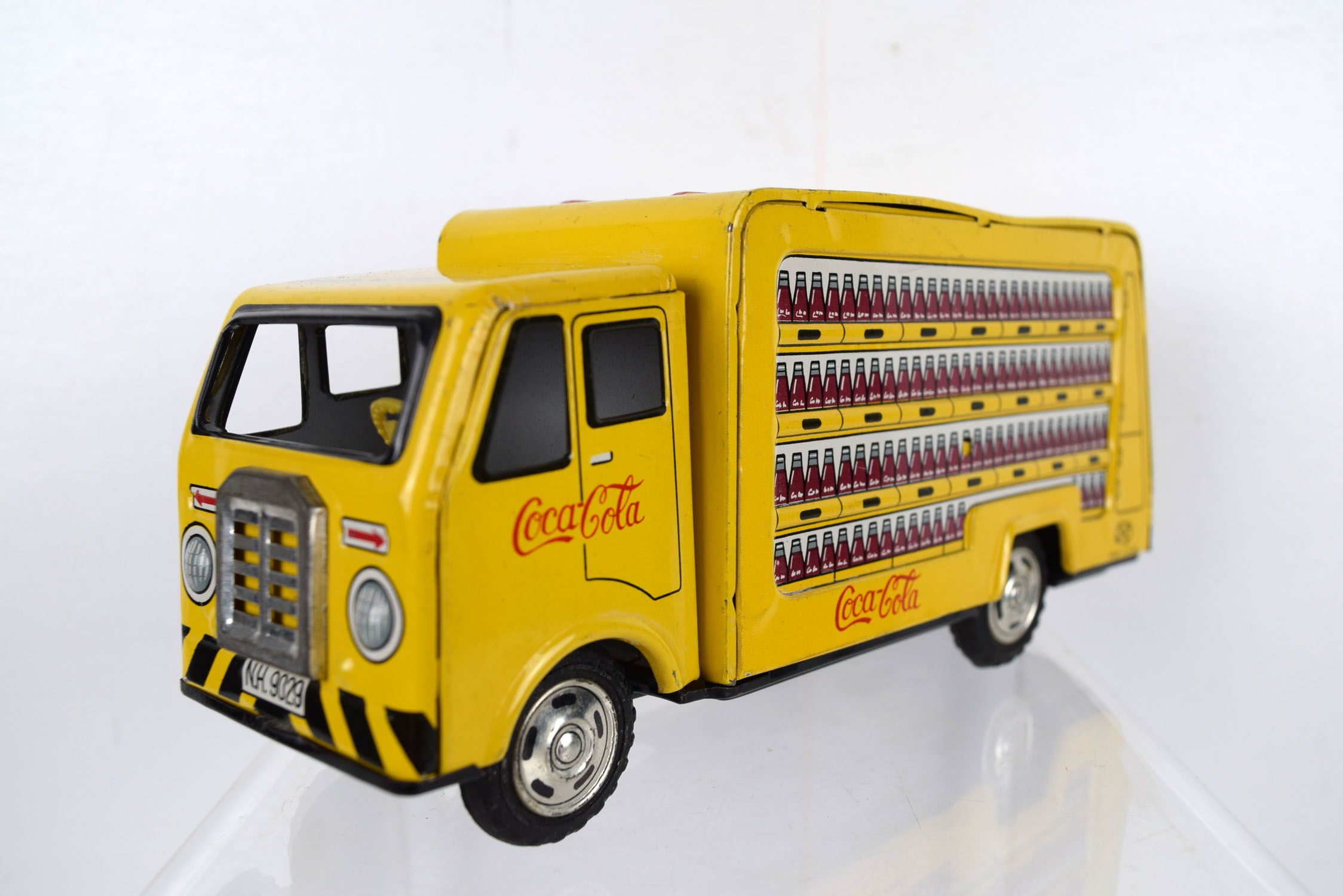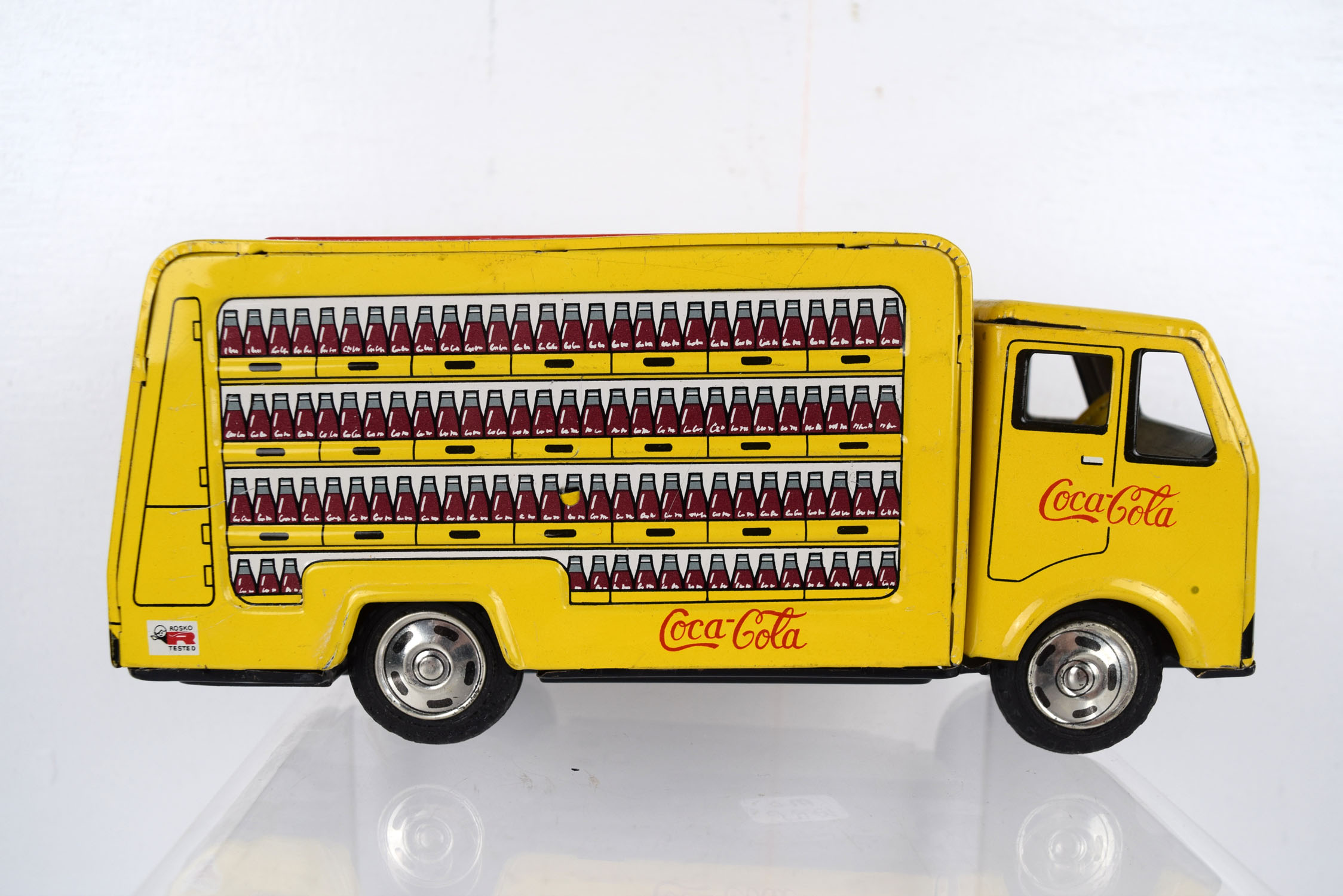 This tin friction truck comes to us from Rosko and is modeled after a Coca Cola delivery truck from the 1960’s. The body is lithographed and the drive mechanism has a friction motor. Some minor marks are on the body from being played with, and it has a slight bend in the roof on the left side. The sides feature cases of Coca Cola bottles with the Coca Cola script on the sides and doors. It is marked “Made In Japan” on the lower left corner and “Rosko Tested” on the lower right corner. Super nice toy for the age. 19953-WRP
