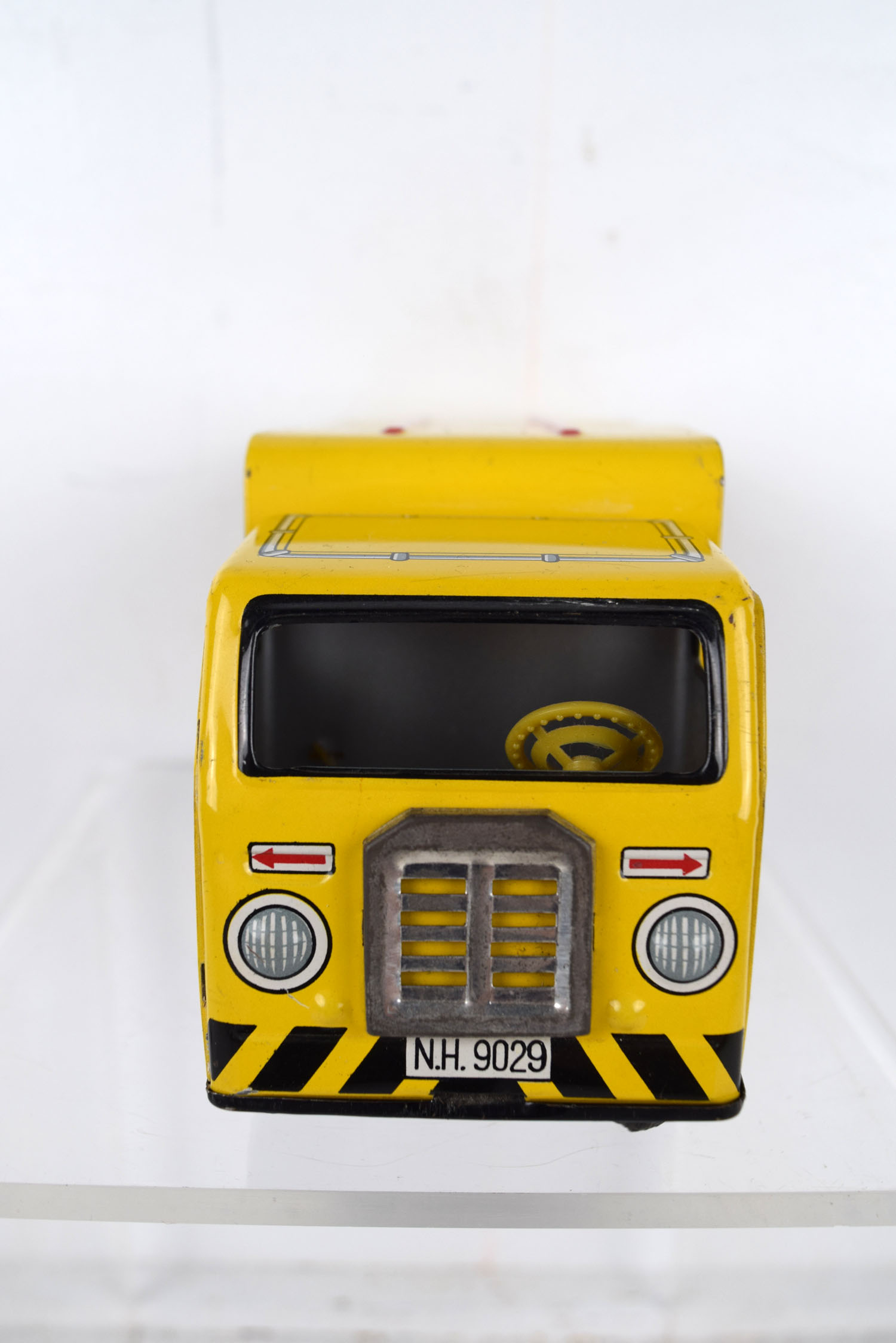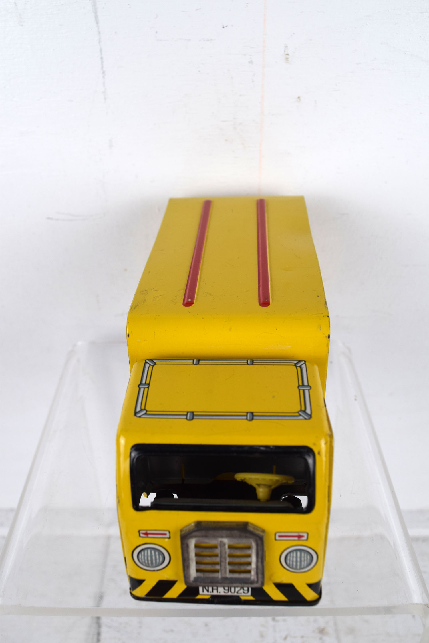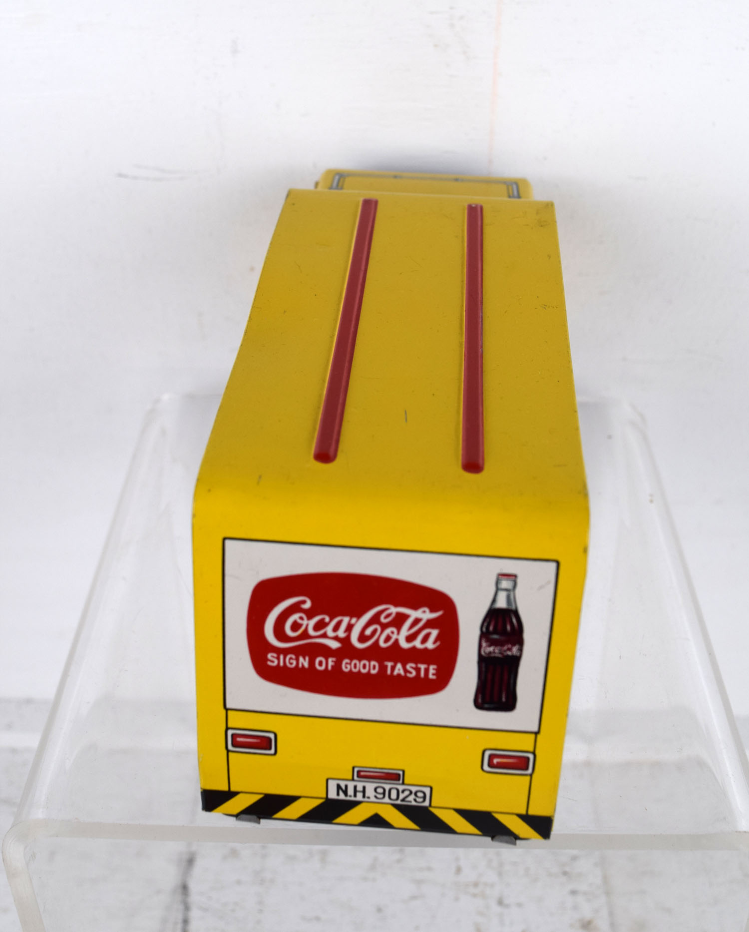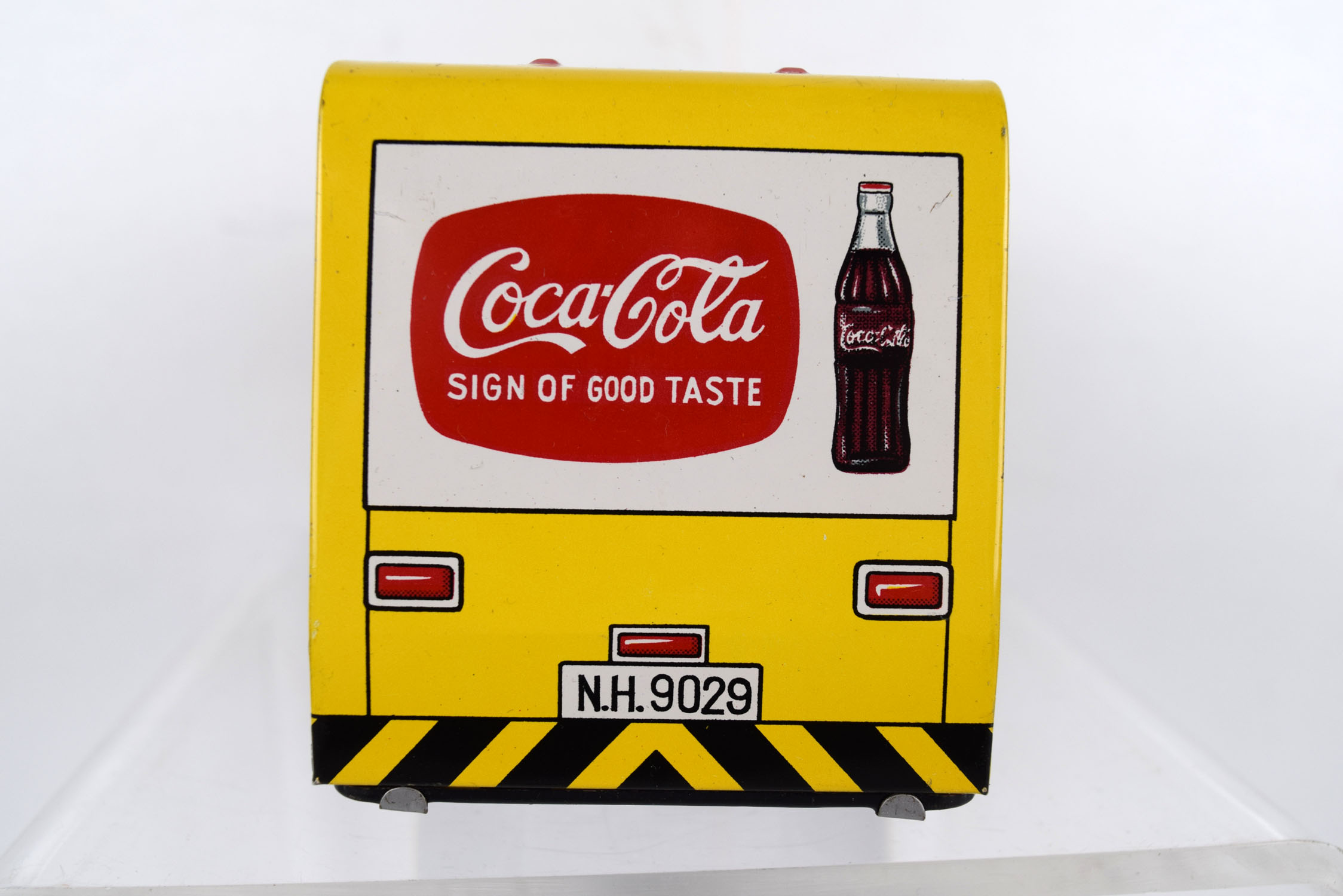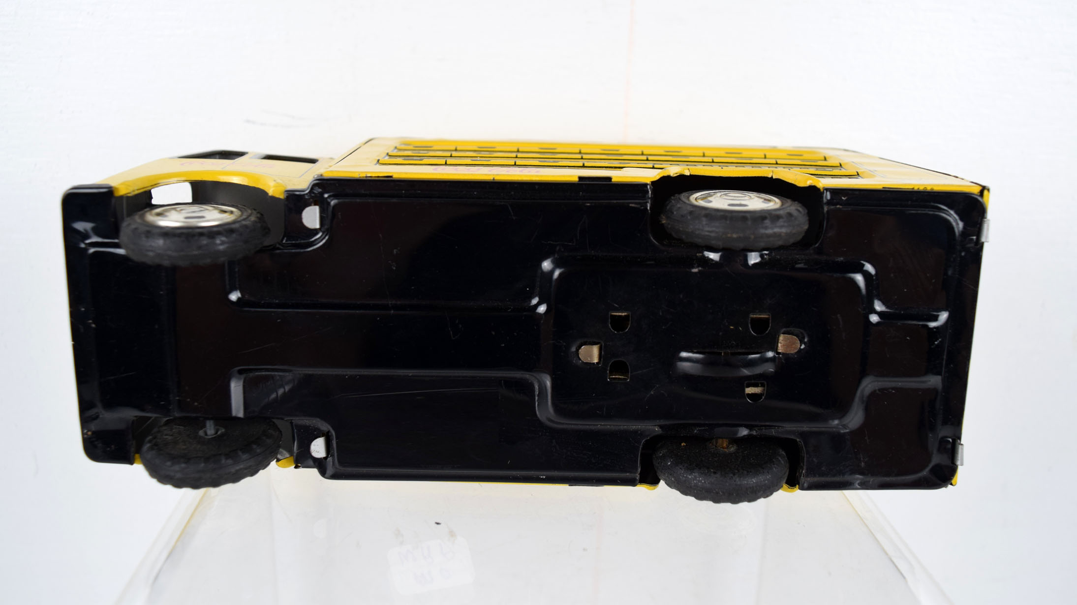 This tin friction truck comes to us from Rosko and is modeled after a Coca Cola delivery truck from the 1960’s. The body is lithographed and the drive mechanism has a friction motor. Some minor marks are on the body from being played with, and it has a slight bend in the roof on the left side. The sides feature cases of Coca Cola bottles with the Coca Cola script on the sides and doors. It is marked “Made In Japan” on the lower left corner and “Rosko Tested” on the lower right corner. Super nice toy for the age. 19953-WRP