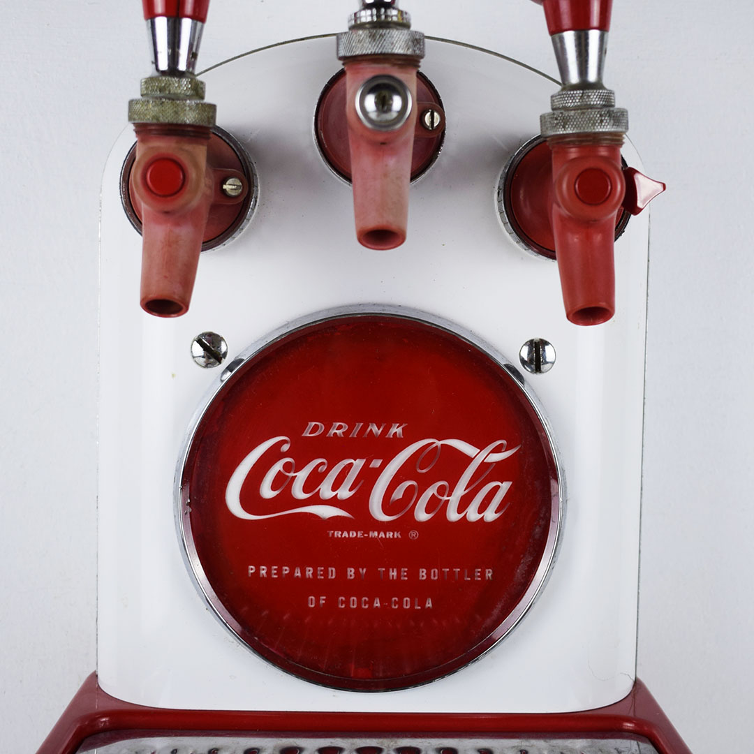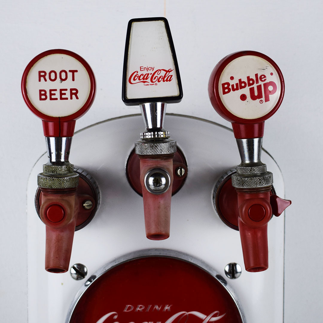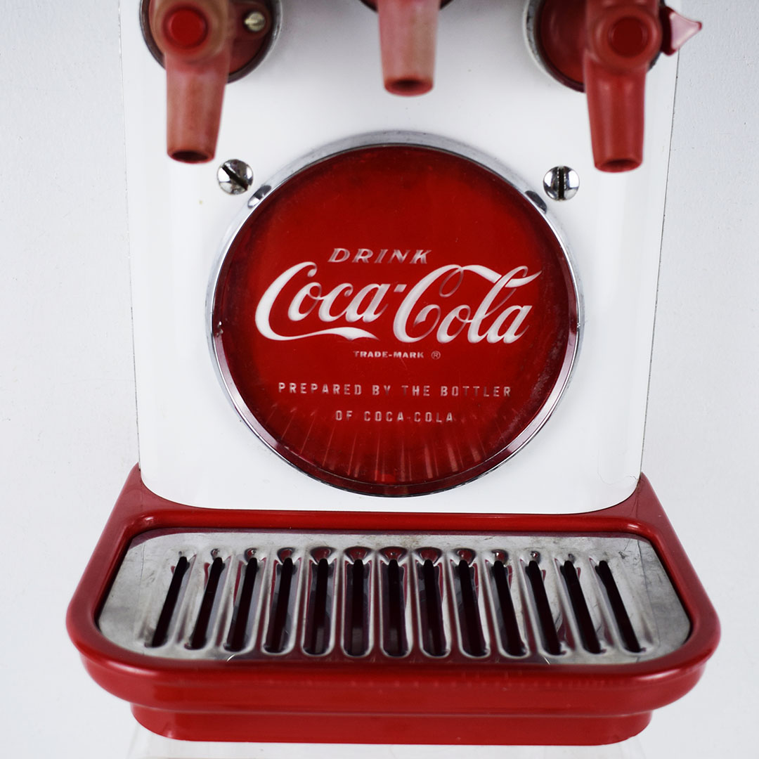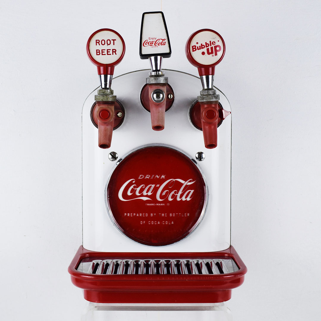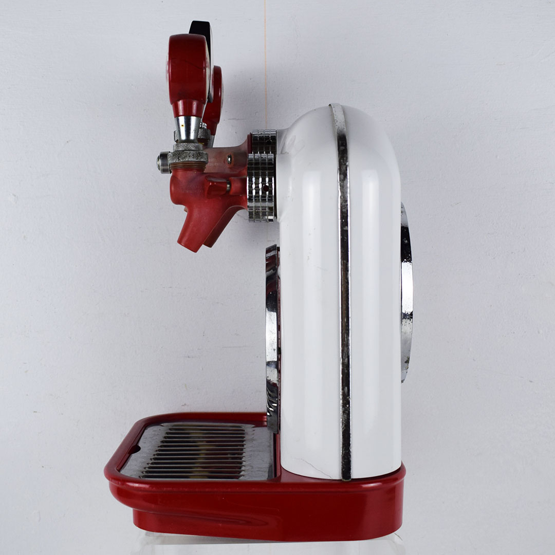 This small Cornelius soda dispenser was dubbed “Tombstone” by its users due to how it appeared when attached to the top of the soda fountain counter in the 1950s. The simple design allowed three different sodas to be dispensed and left plenty of room on the counter for customers to eat. The red Coca-Cola button is on each side, with one side only reading Coca-Cola and the other reading “Drink Coca-Cola Prepared By The Bottler Of Coca-Cola.” Each chrome band has some oxidation, with one side worse. The fountain side of the dispenser has a crack in the housing on the lower right side of the original housing. The three soda dispensers are Root Beer, Coca-Cola, and Bubble Up. All three pull nicely, but the Root Beer one has a crack where it attaches. This dispenser still retains the original metal grate and the original mounting brackets, which are marked “Cornelius.” It’s a super lovely dispenser that is seldom seen complete. 21157-EEP
