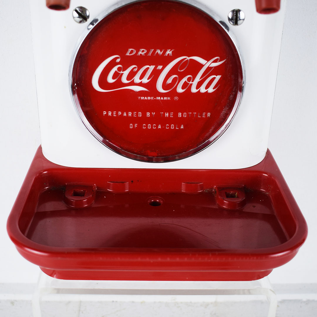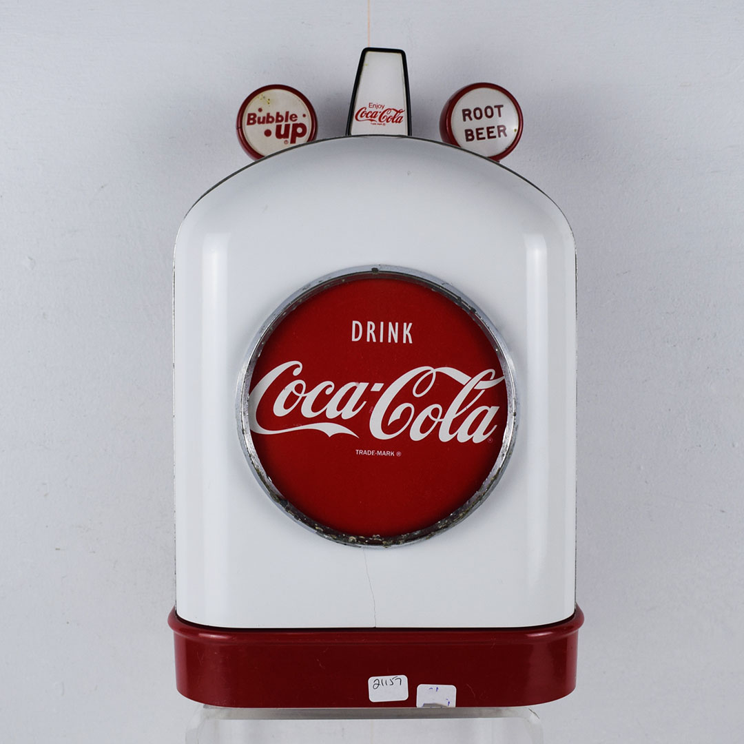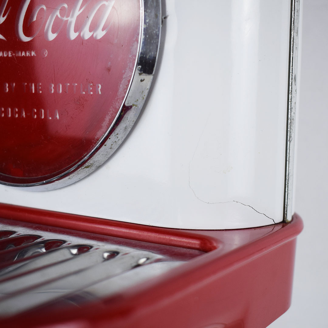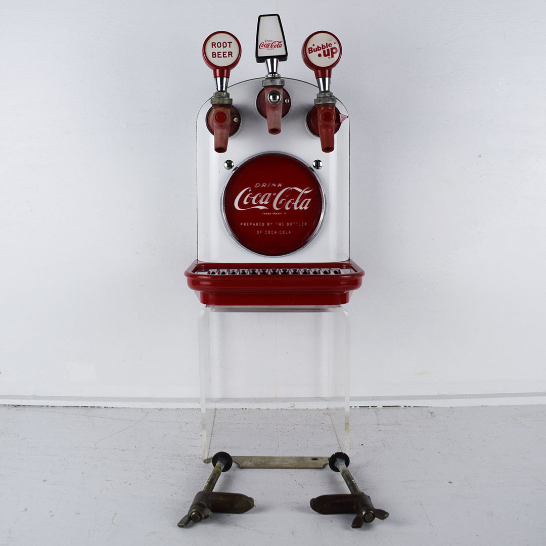 This small Cornelius soda dispenser was dubbed “Tombstone” by its users due to how it appeared when attached to the top of the soda fountain counter in the 1950s. The simple design allowed three different sodas to be dispensed and left plenty of room on the counter for customers to eat. The red Coca-Cola button is on each side, with one side only reading Coca-Cola and the other reading “Drink Coca-Cola Prepared By The Bottler Of Coca-Cola.” Each chrome band has some oxidation, with one side worse. The fountain side of the dispenser has a crack in the housing on the lower right side of the original housing. The three soda dispensers are Root Beer, Coca-Cola, and Bubble Up. All three pull nicely, but the Root Beer one has a crack where it attaches. This dispenser still retains the original metal grate and the original mounting brackets, which are marked “Cornelius.” It’s a super lovely dispenser that is seldom seen complete. 21157-EEP